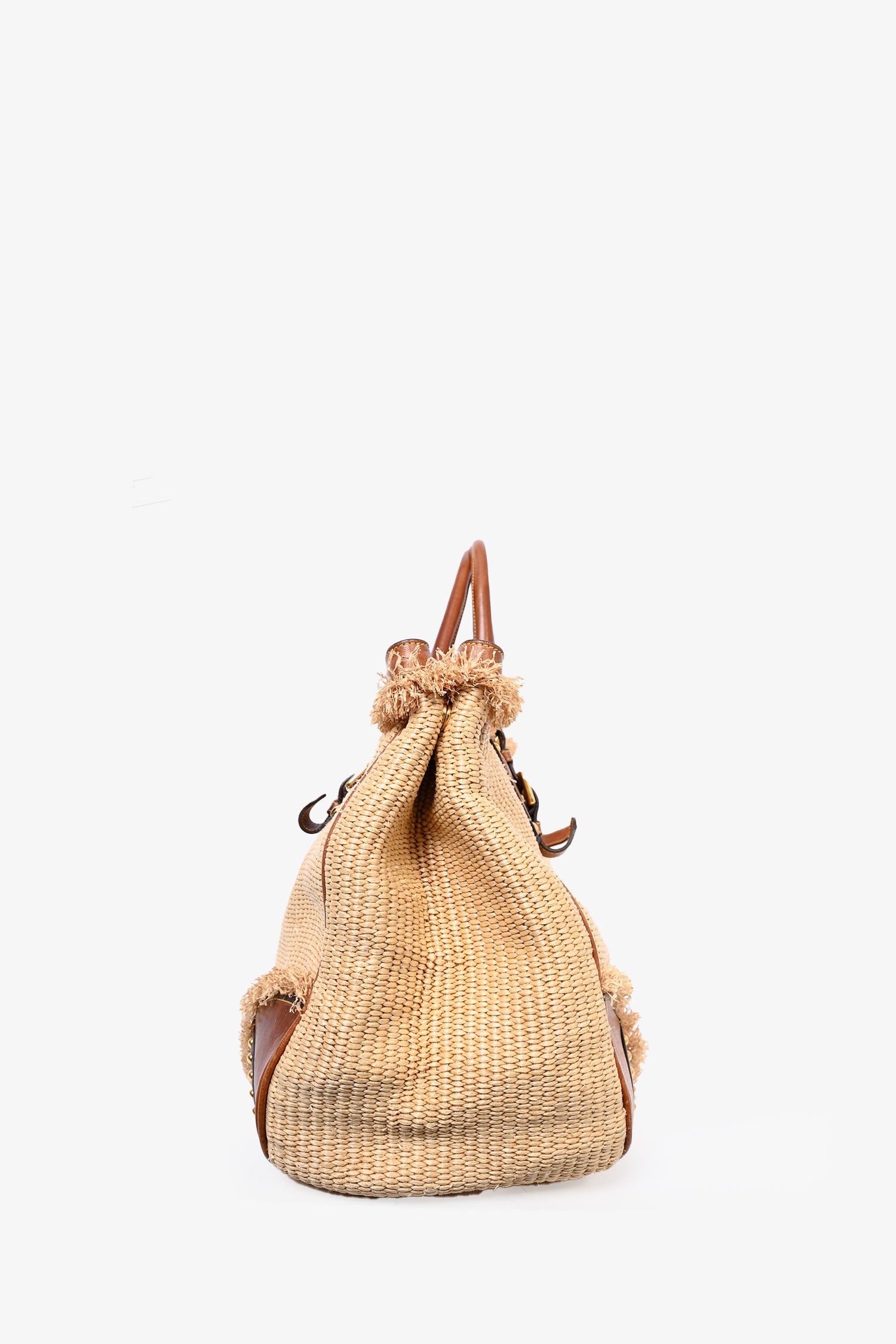 Prada Beige Raffia Brown Leather Trim Paglia Large Tote with Canvas Strap