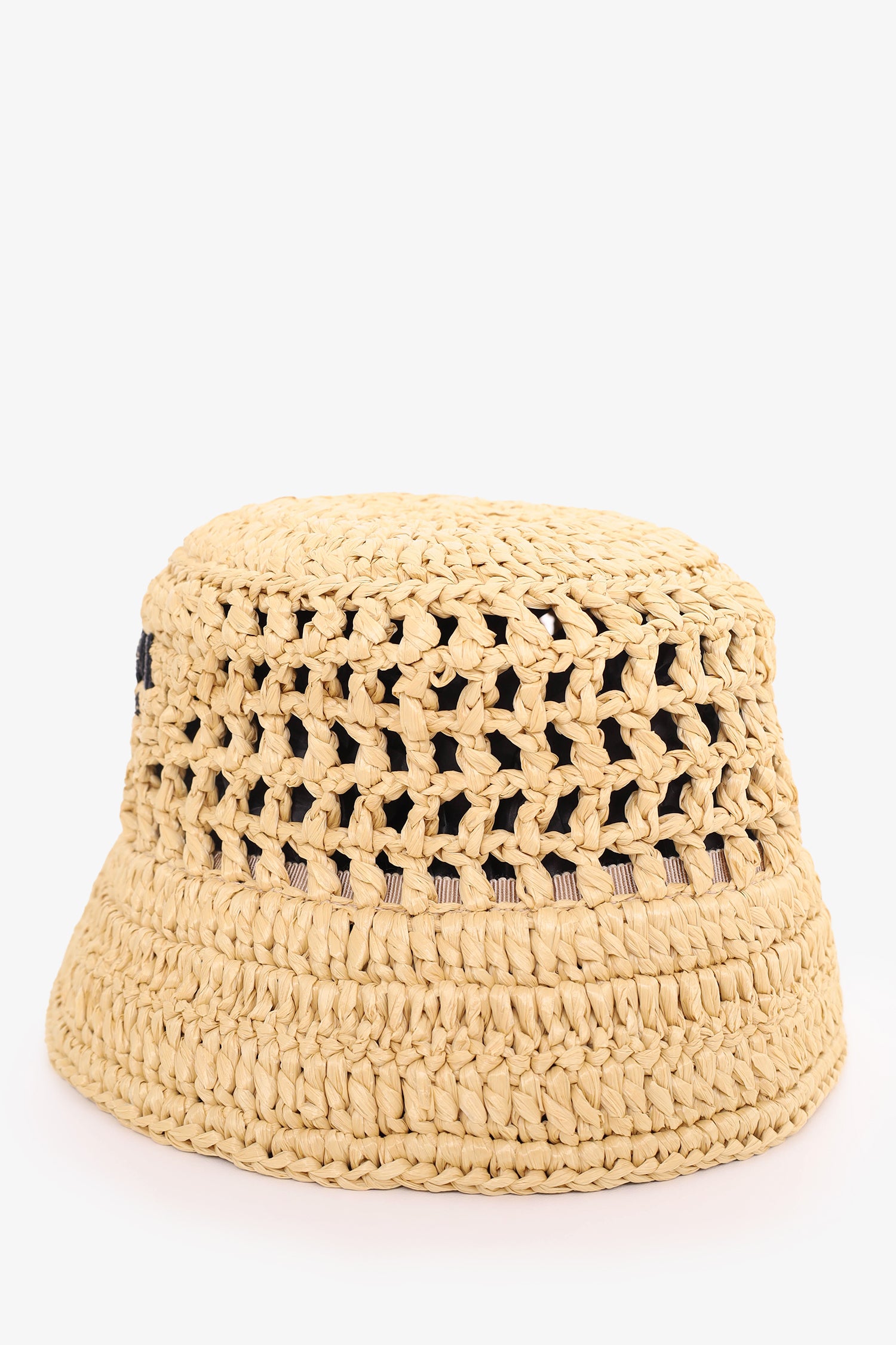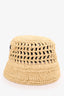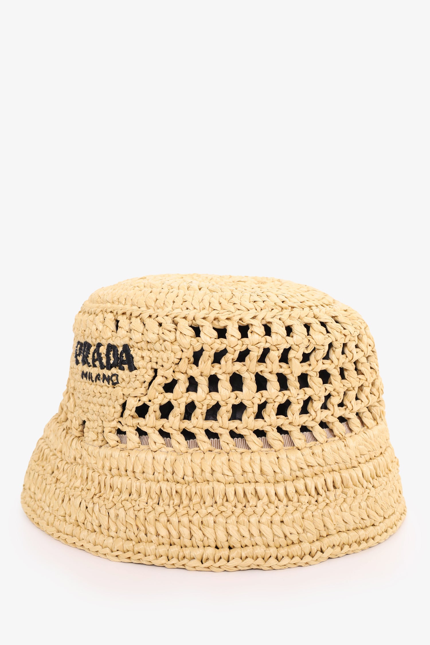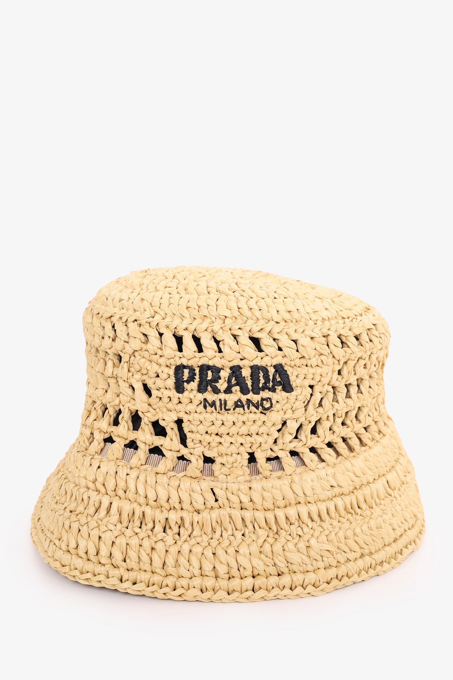 Refresh availabilityPrada Beige Raffia Bucket Hat. Black logo on front. Tonal stitching.