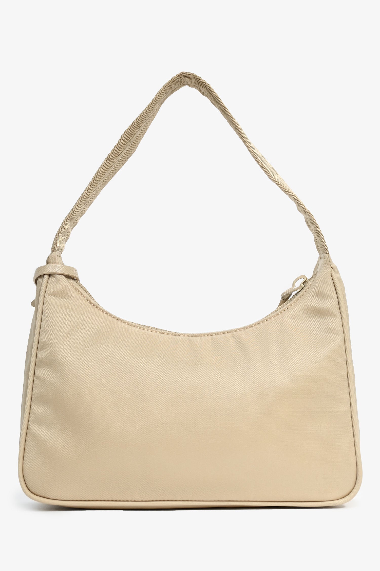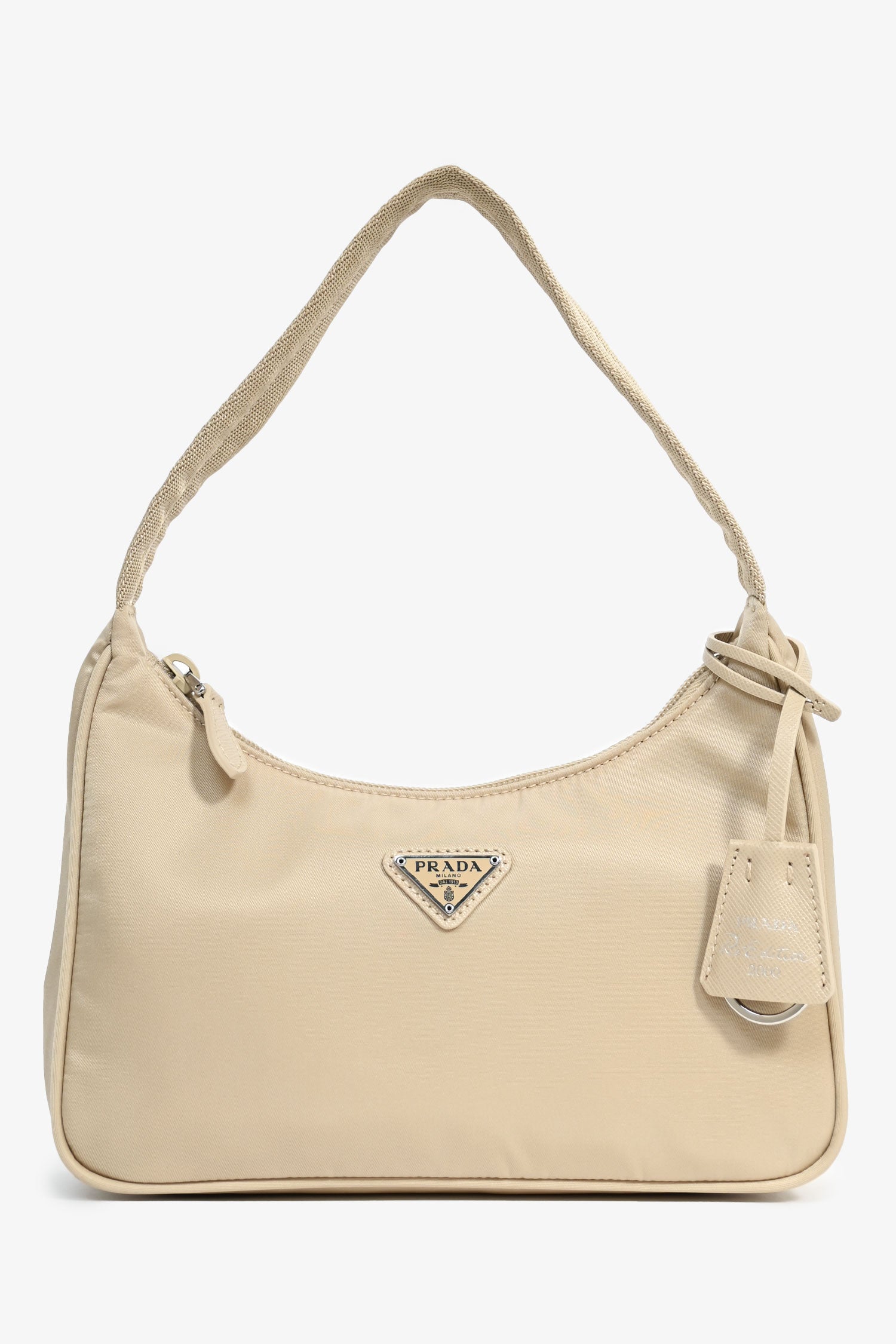 Refresh availabilityPrada Beige Re-Nylon Re-Edition 2000 Shoulder Bag. Top zipper closure. Single compartment. Detachable key ring. Textile lining. Silver-tone hardware. Tonal stitching.
