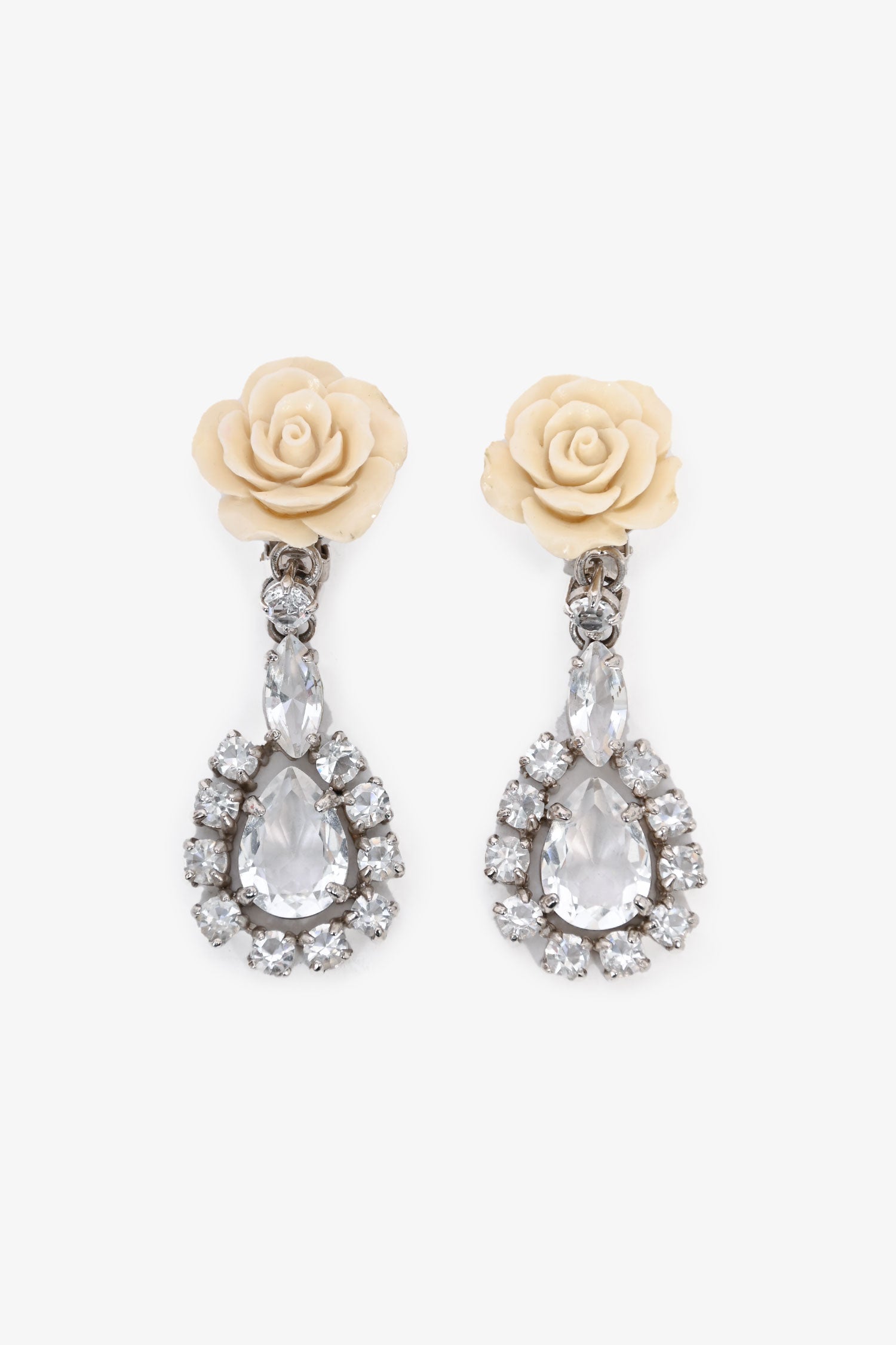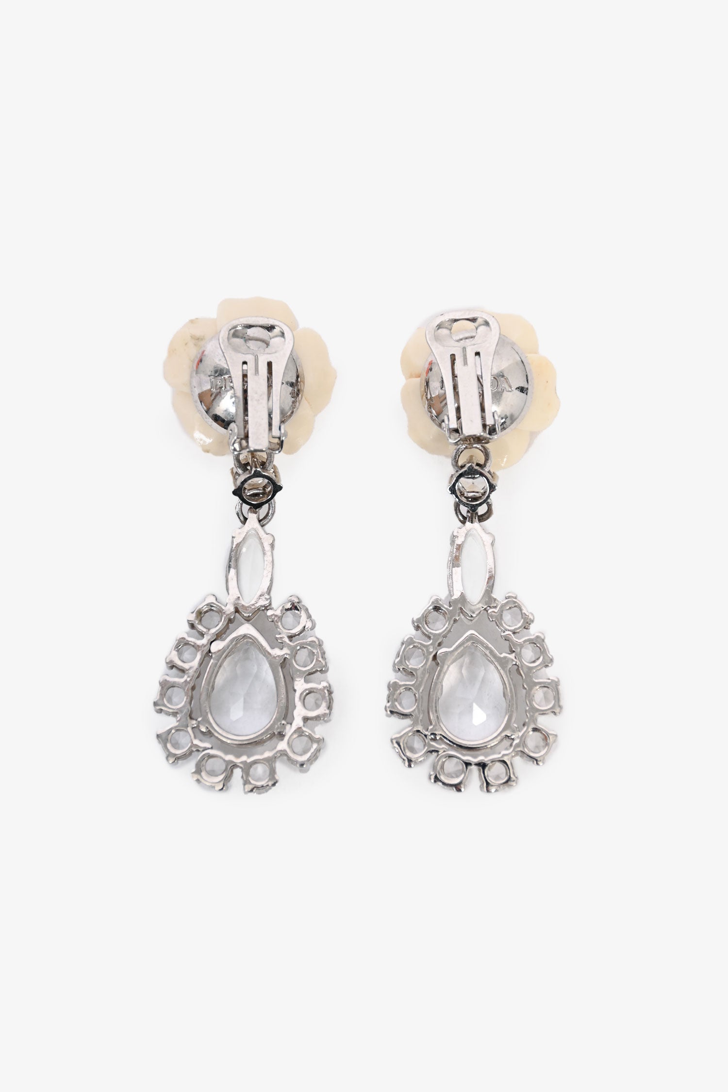 Prada Beige Rose Clip On Earrings with Large Crystal Drop
