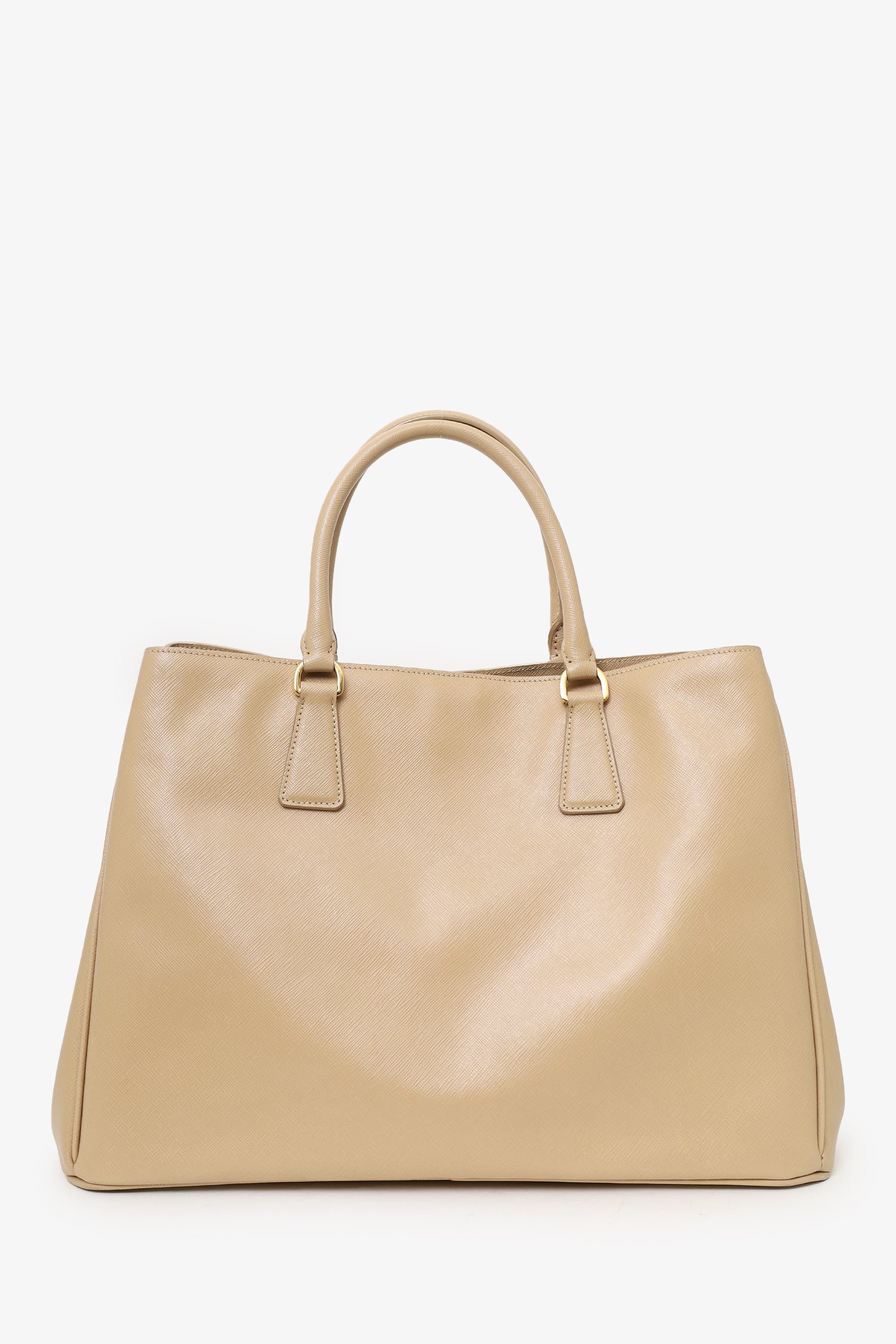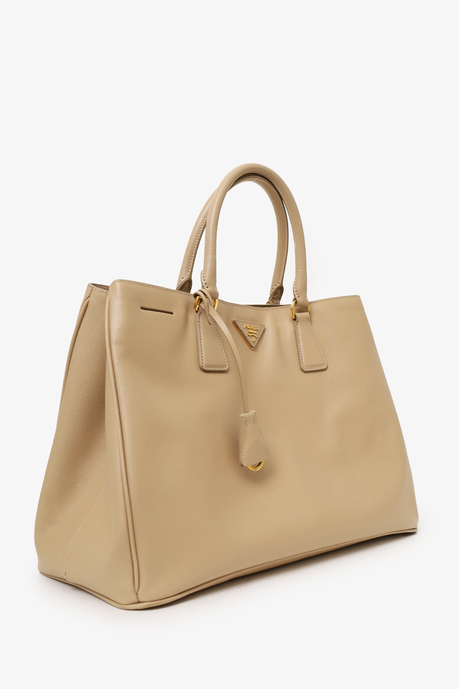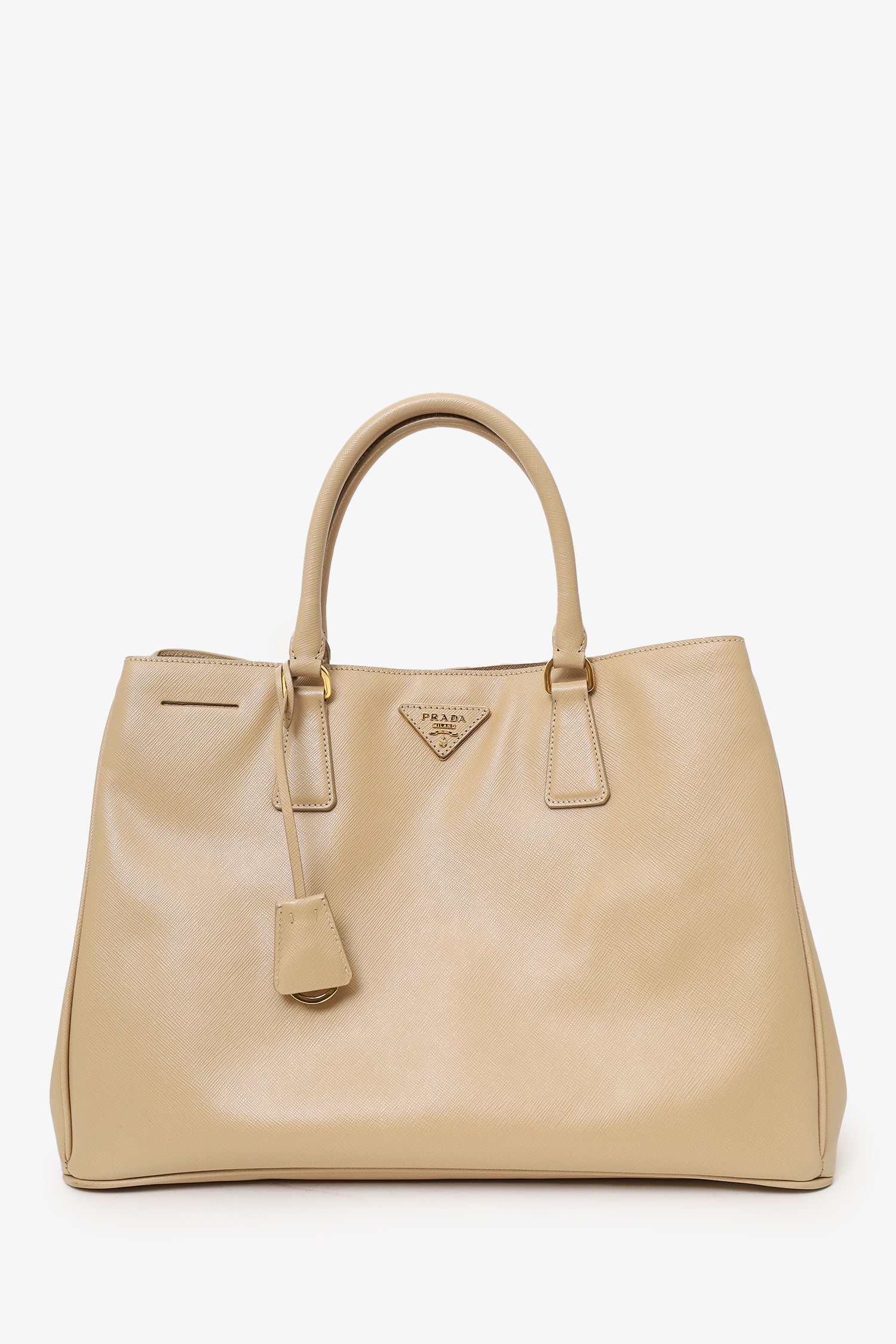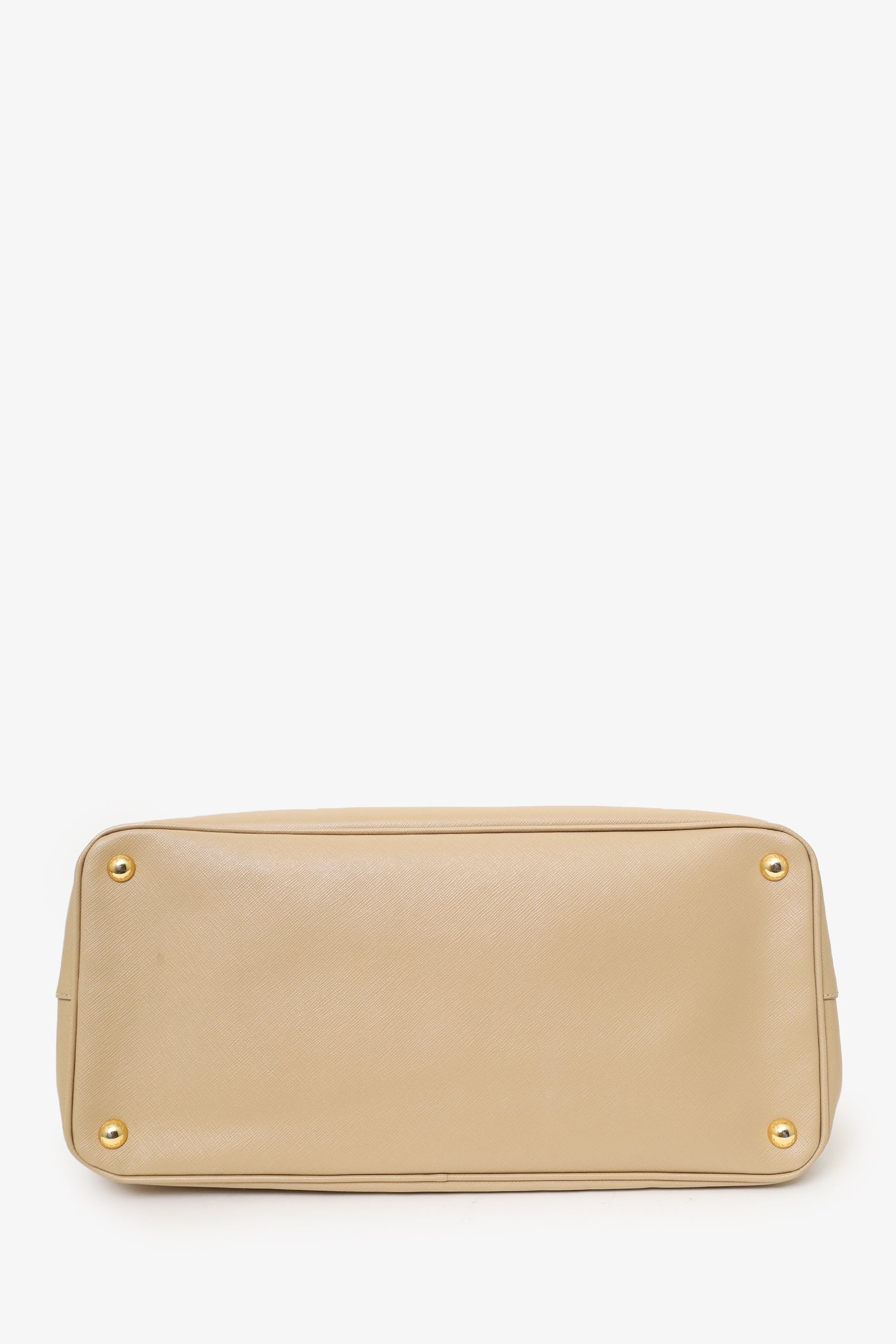 Refresh availabilityPrada Beige Saffiano Leather Large Galleria Tote Bag. Top interior snap-button closure. Top twin handles. Protective studs on bottom. Snap-button expansion on exterior sides of bag. Lined interior. 2 interior pockets; 1 zip and 1 slip. Gold-tone hardware. Tonal stitching.