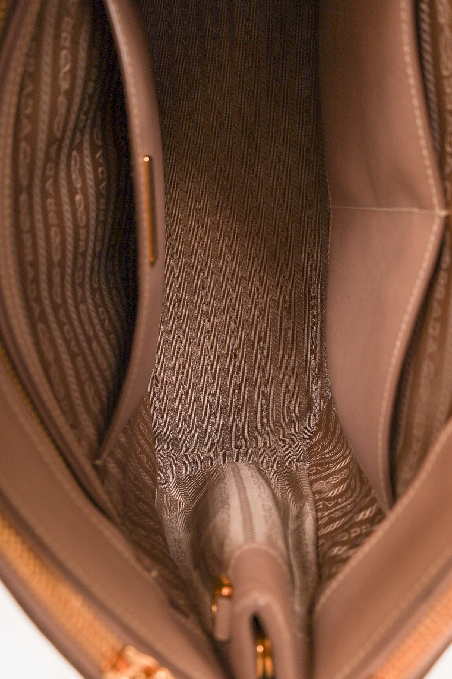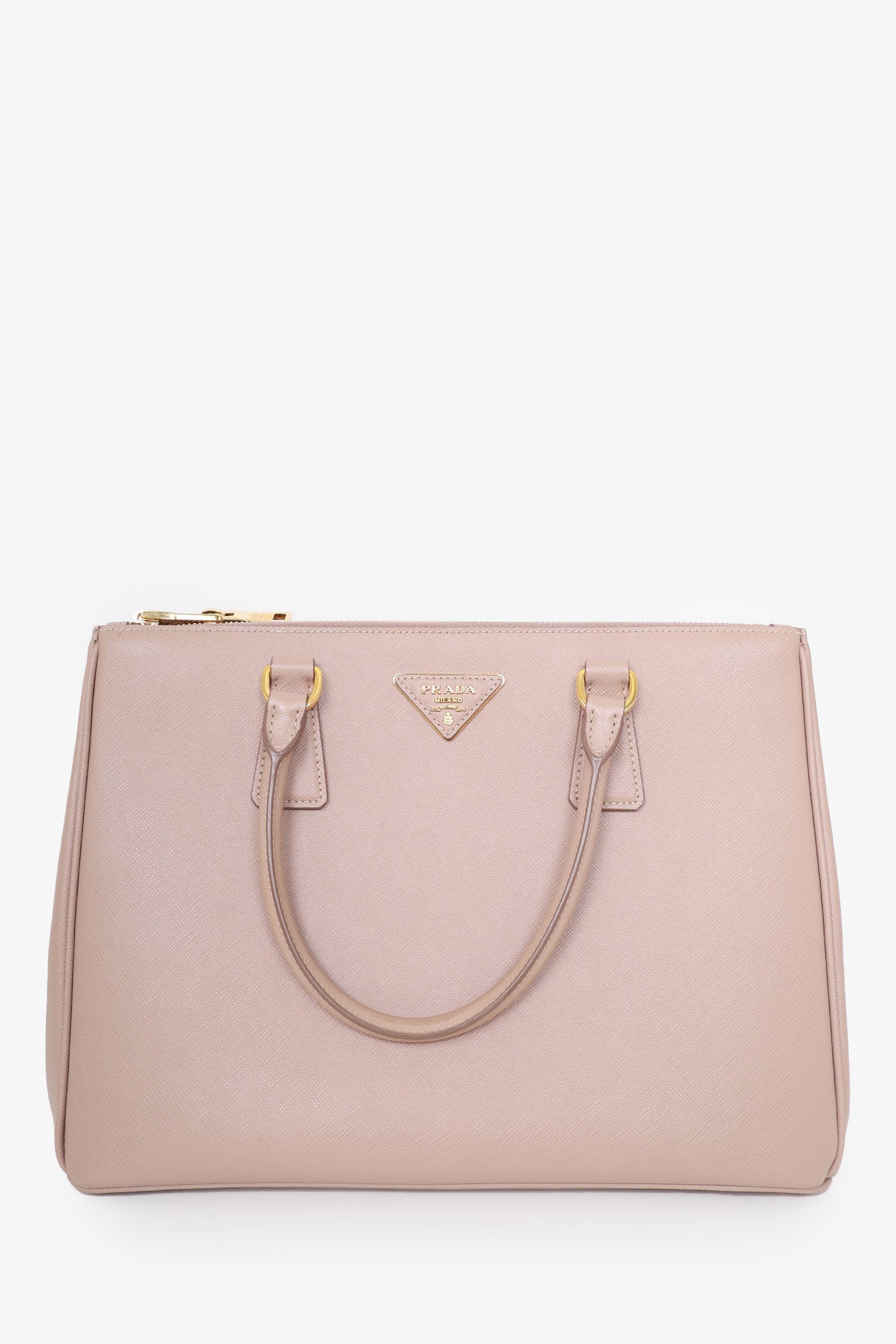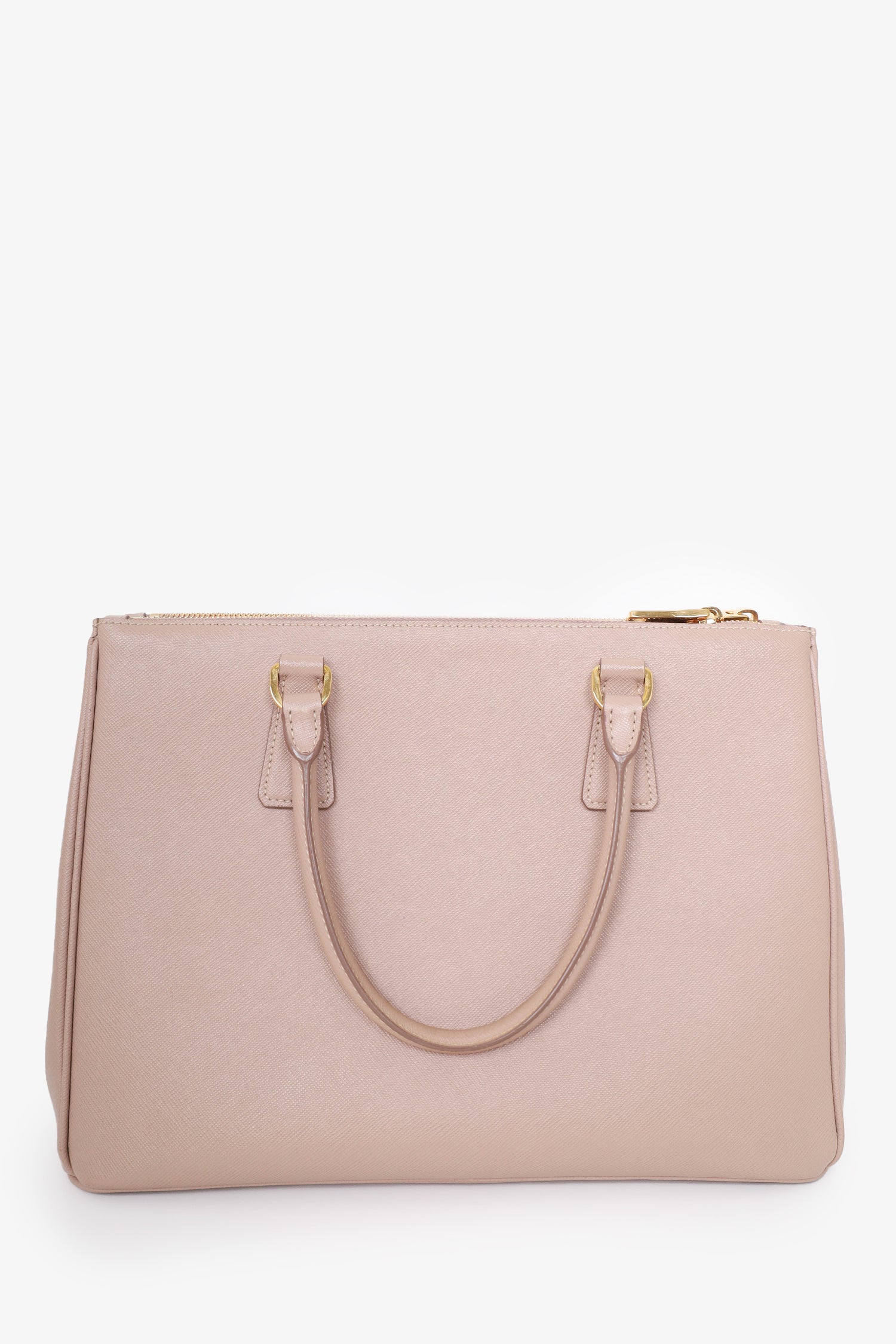 Refresh availabilityPrada Beige Saffiano Leather Large 'Galleria' Tote with Strap. Open compartment. 2 side interior pockets with zip closure. Interior wall zip pocket. 3 interior wall slip pockets.