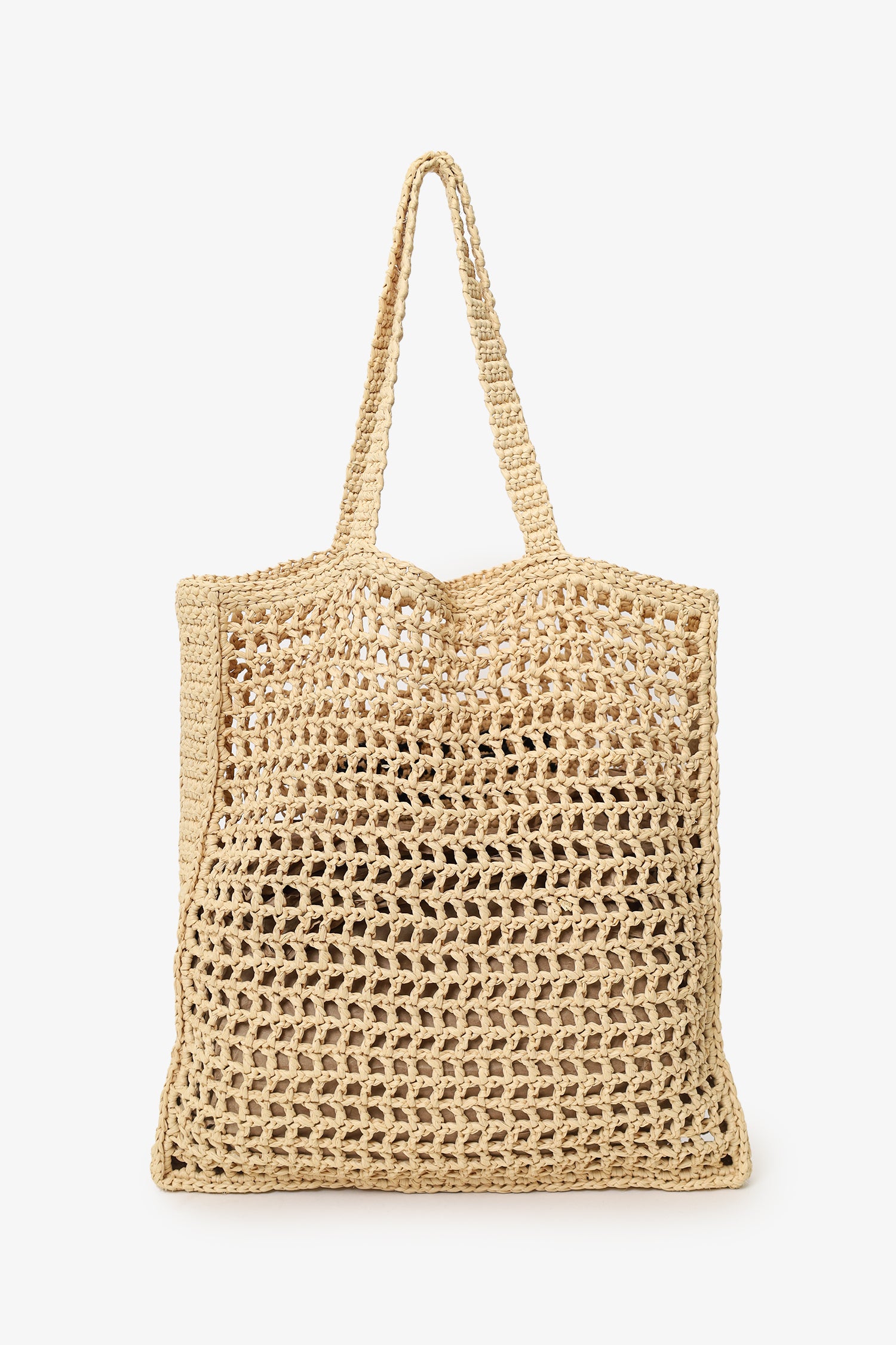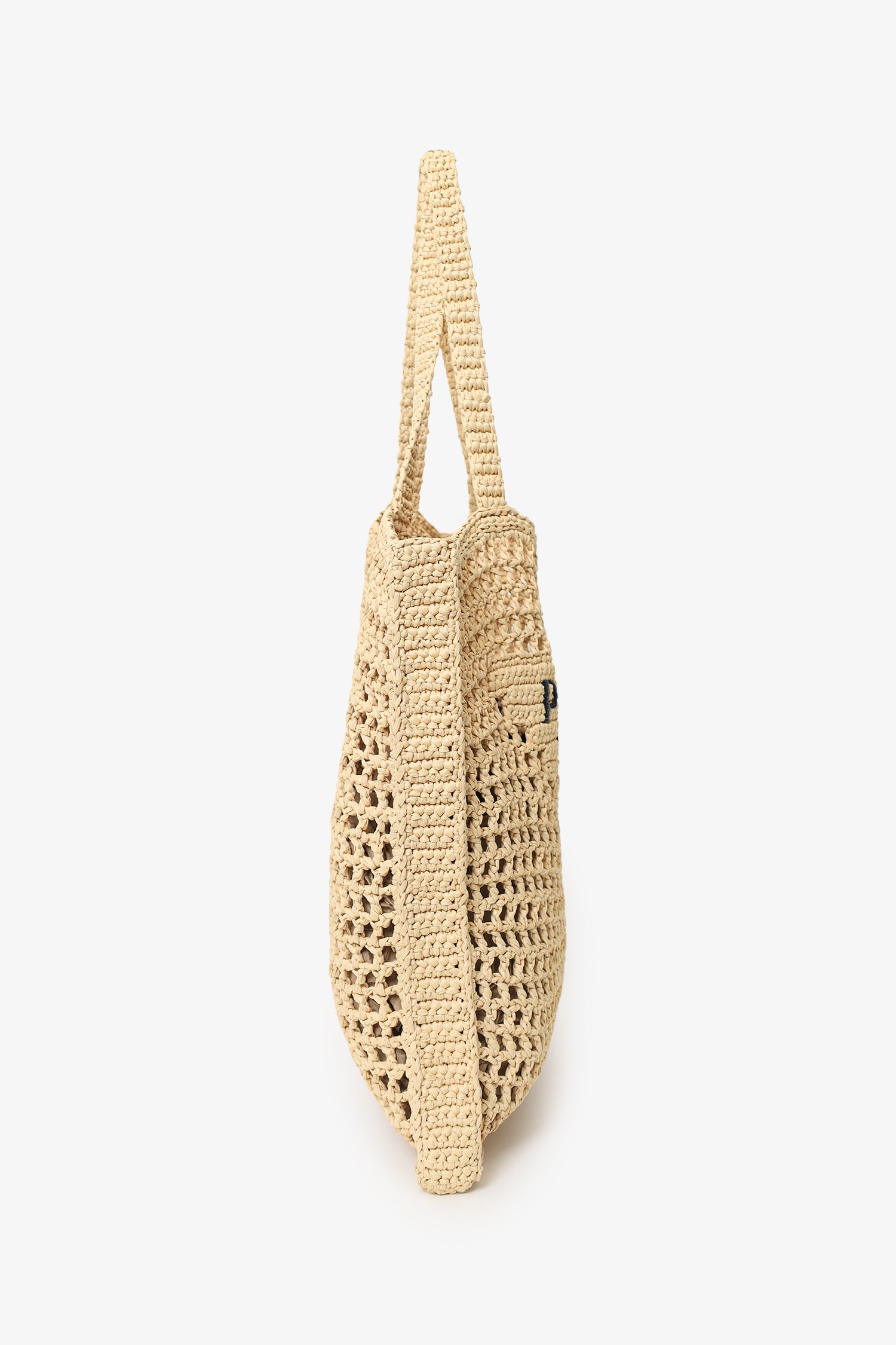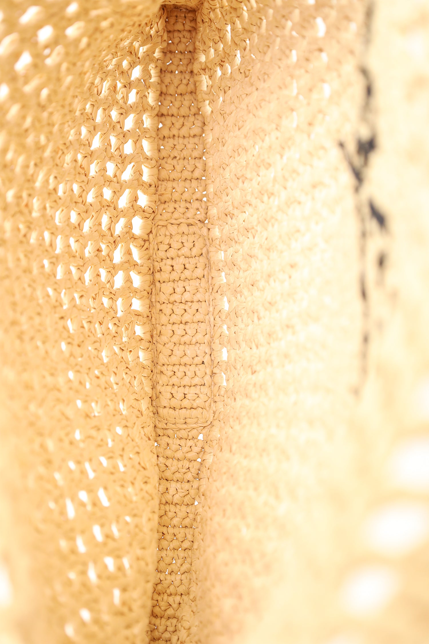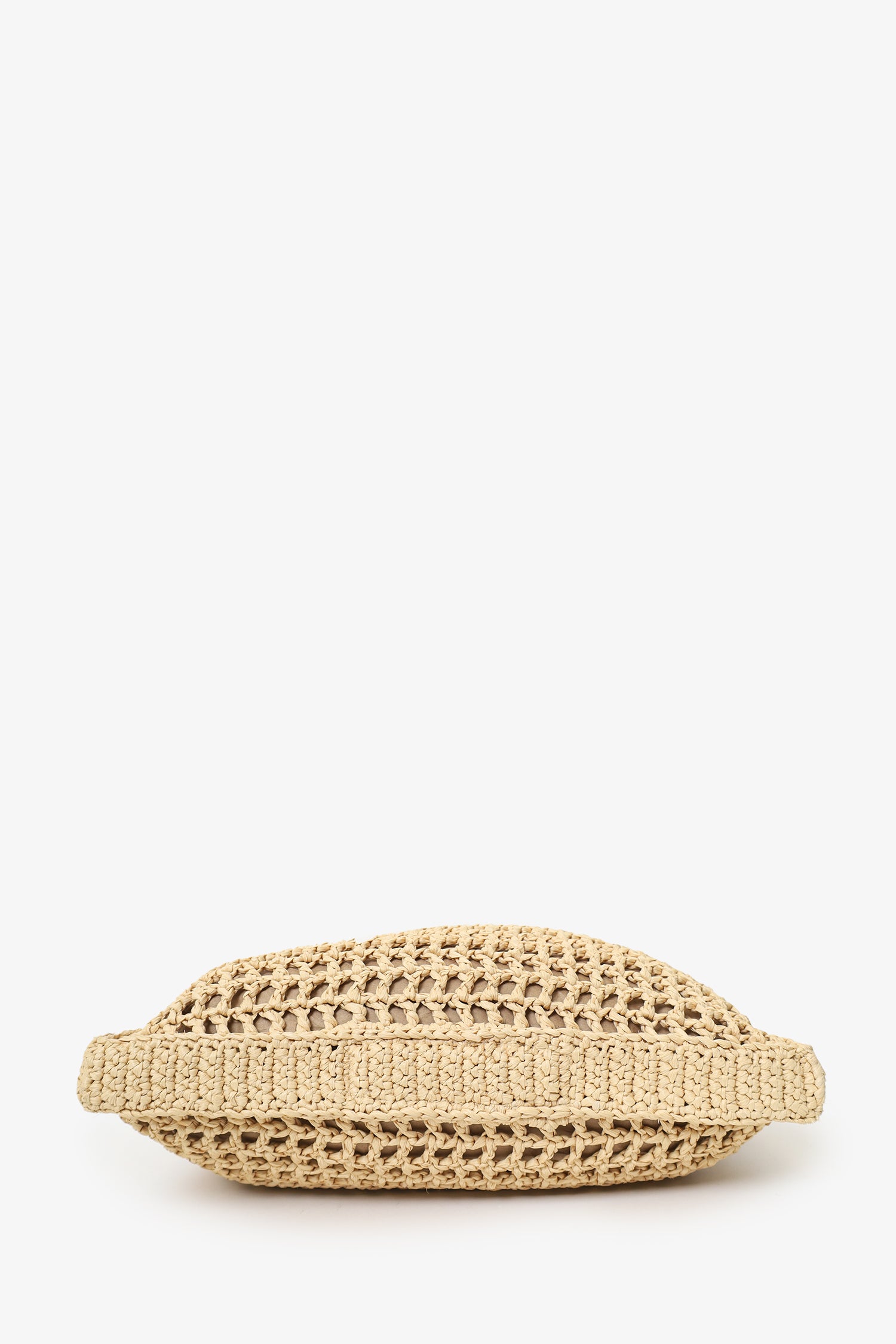 Refresh availabilityPrada Beige Small Logo Crochet Raffia Tote. Open top. Dual shoulder straps. Contrast and tonal stitching.