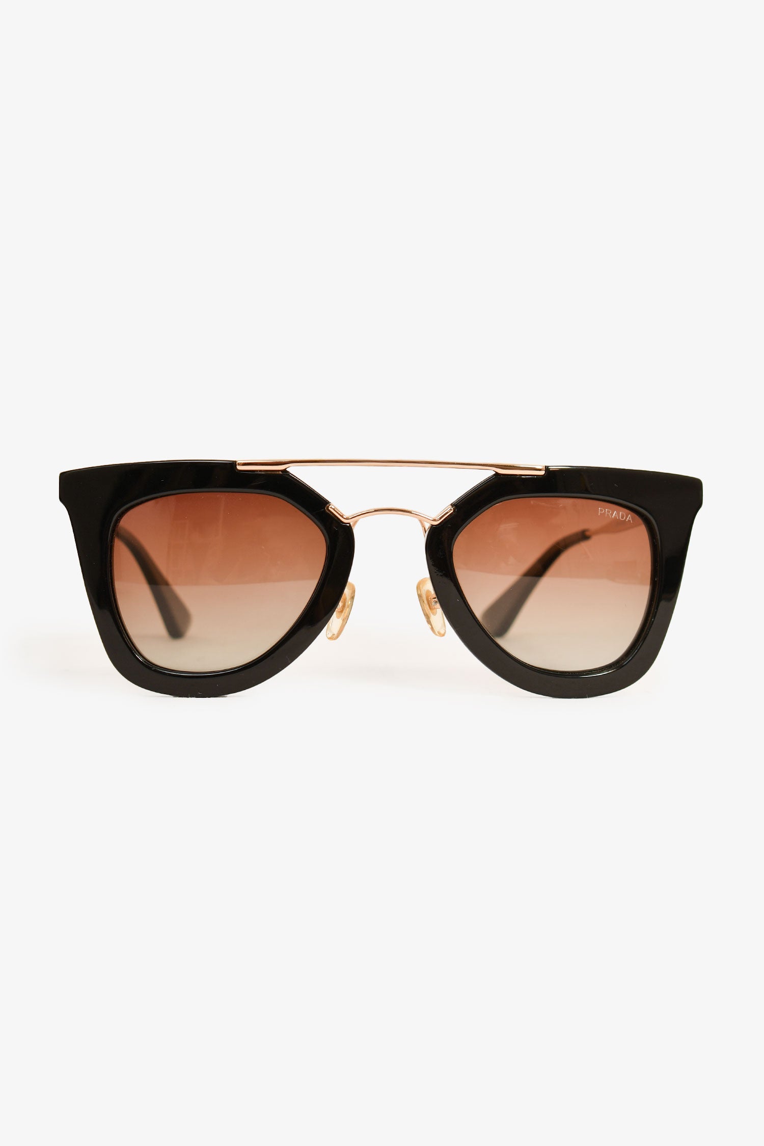 Refresh availabilityPrada Black Acetate Gold Aviator Sunglasses. Gradient tinted frames. Wired, gold-tone hardware. Clear nose pads. Black-tone acetate frames.