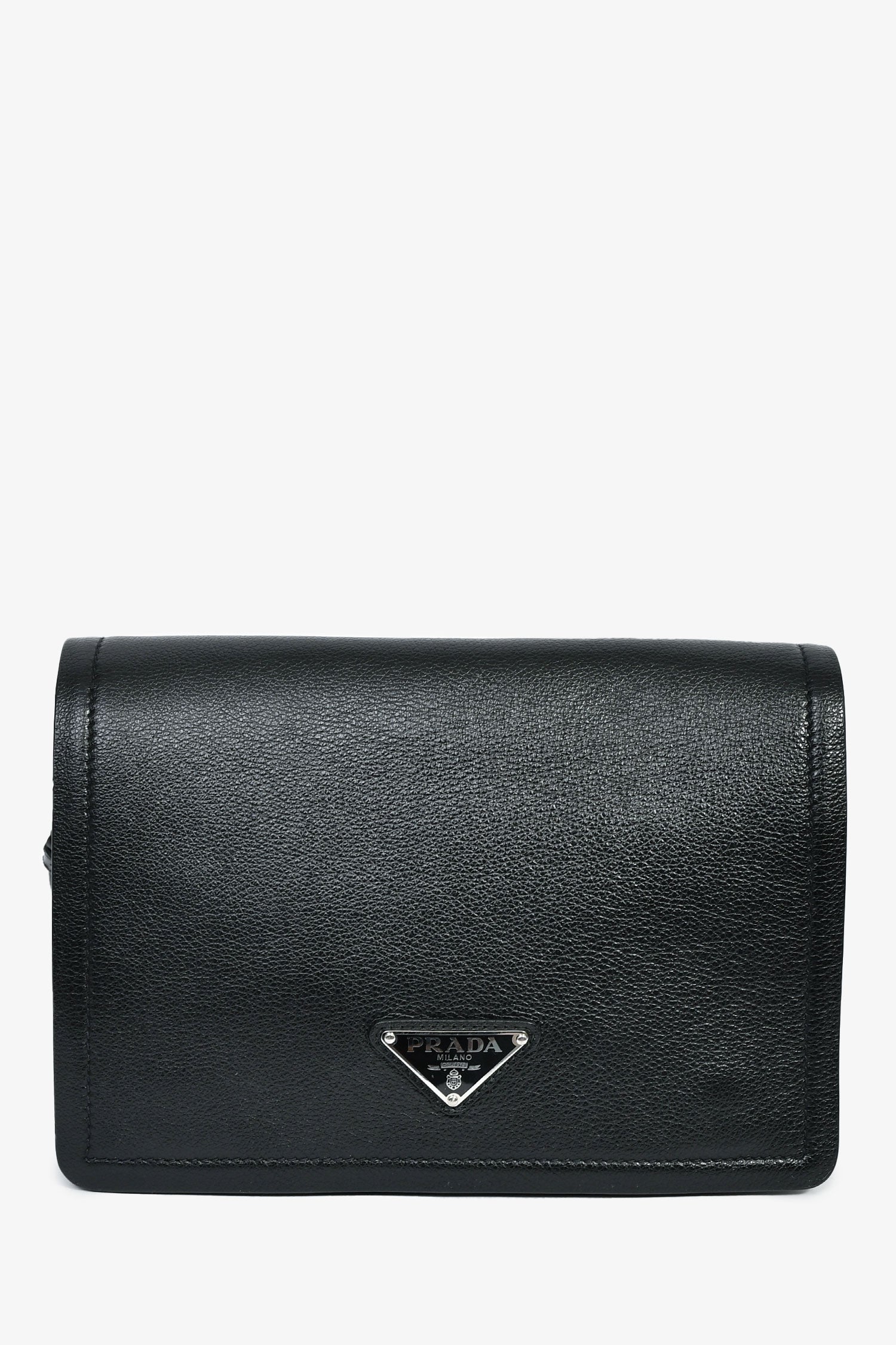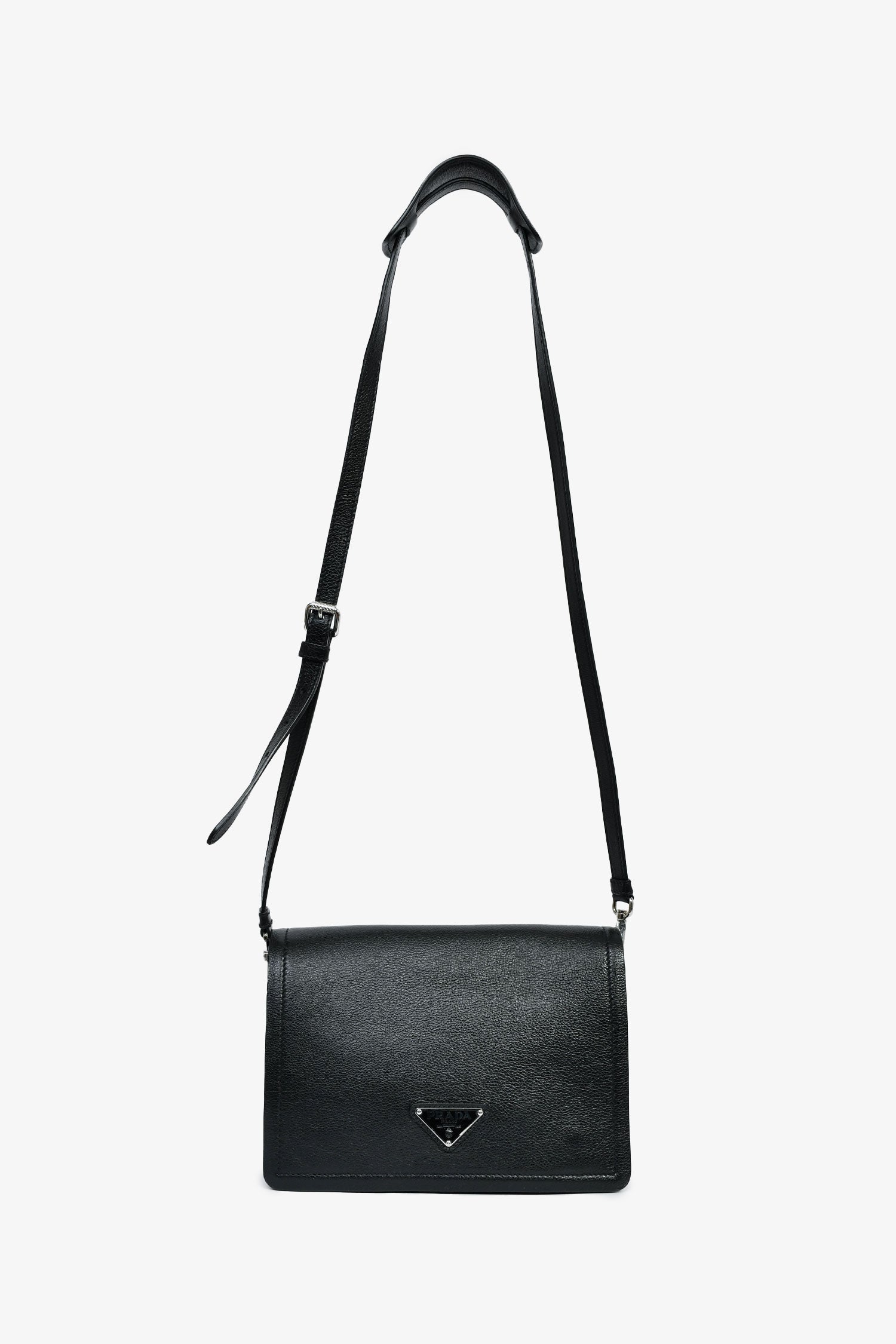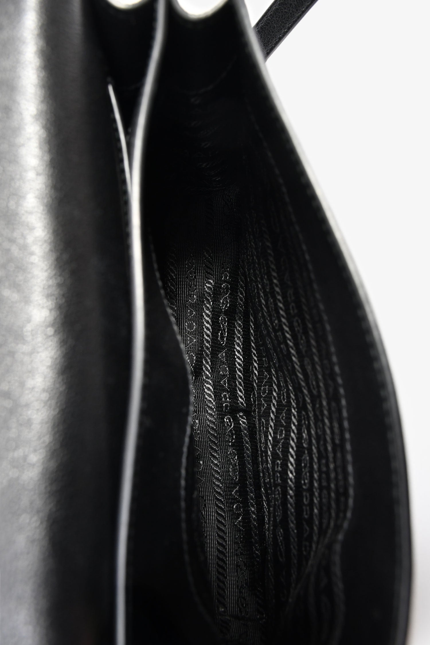 Refresh availabilityPrada Black Calf Leather 'Glace' Messenger Bag. Fold-over flap with magnetic closure. Detachable crossbody strap. Lined interior with 2 compartments and 1 wall pocket. Silver-tone hardware. Tonal stitching.