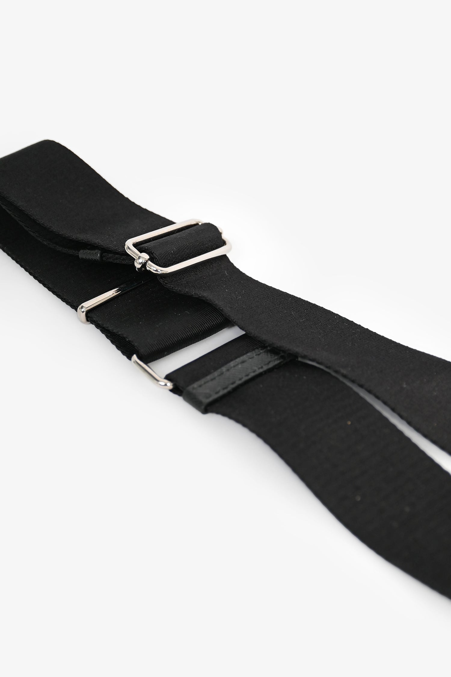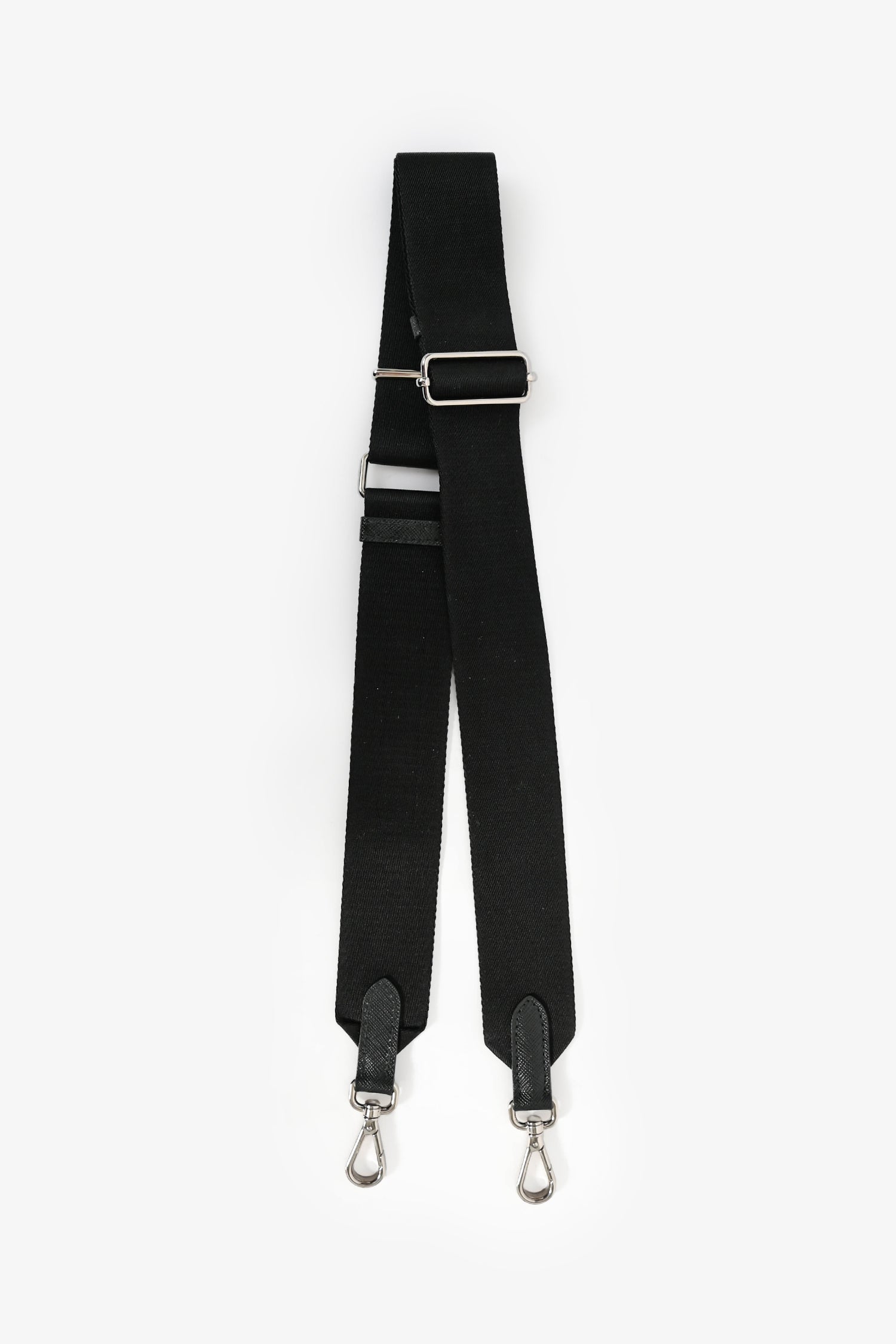 Refresh availabilityPrada Black Canvas Logo Strap. Silver-tone closures. Webbed canvas. Tonal stitching.