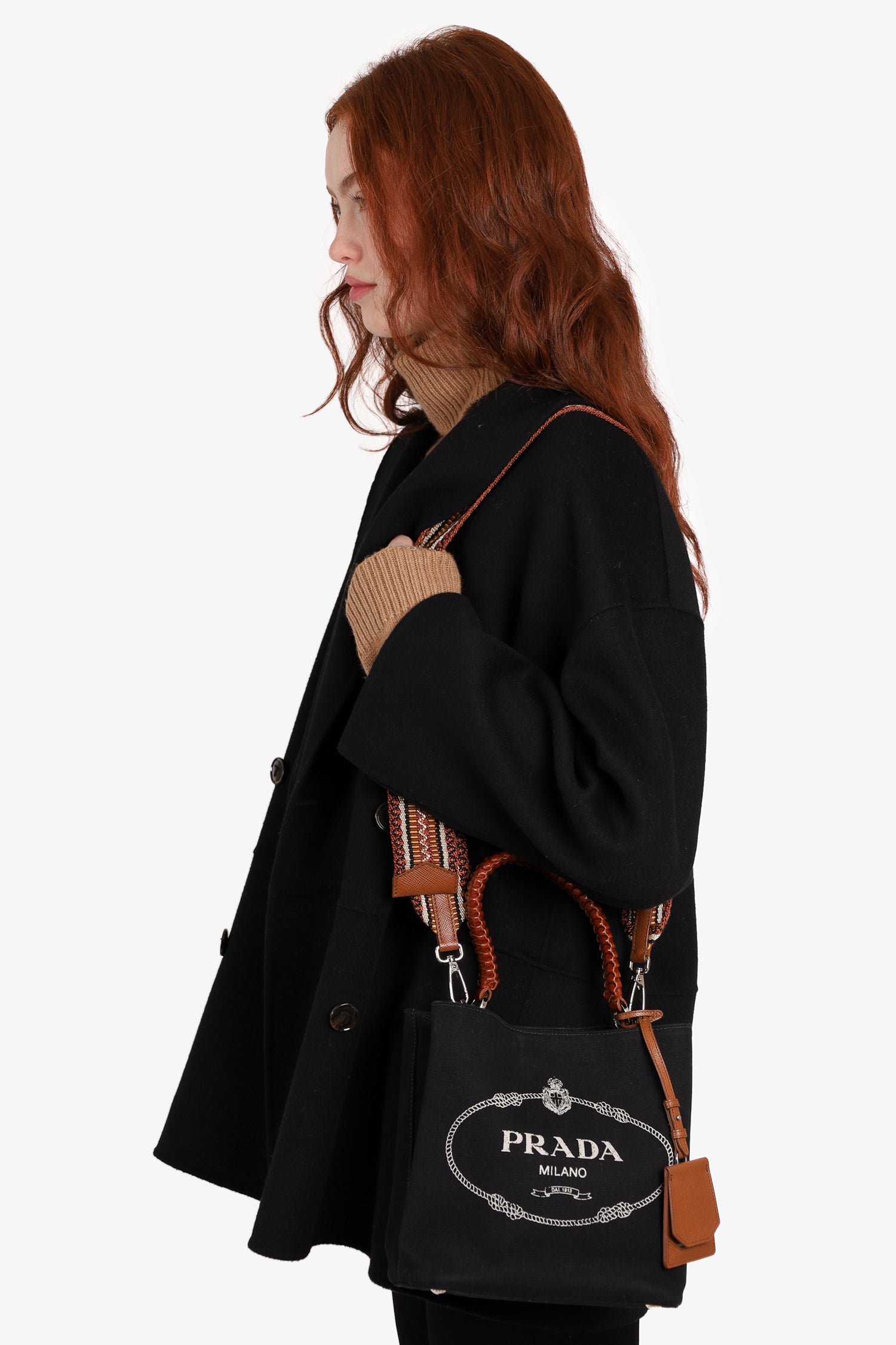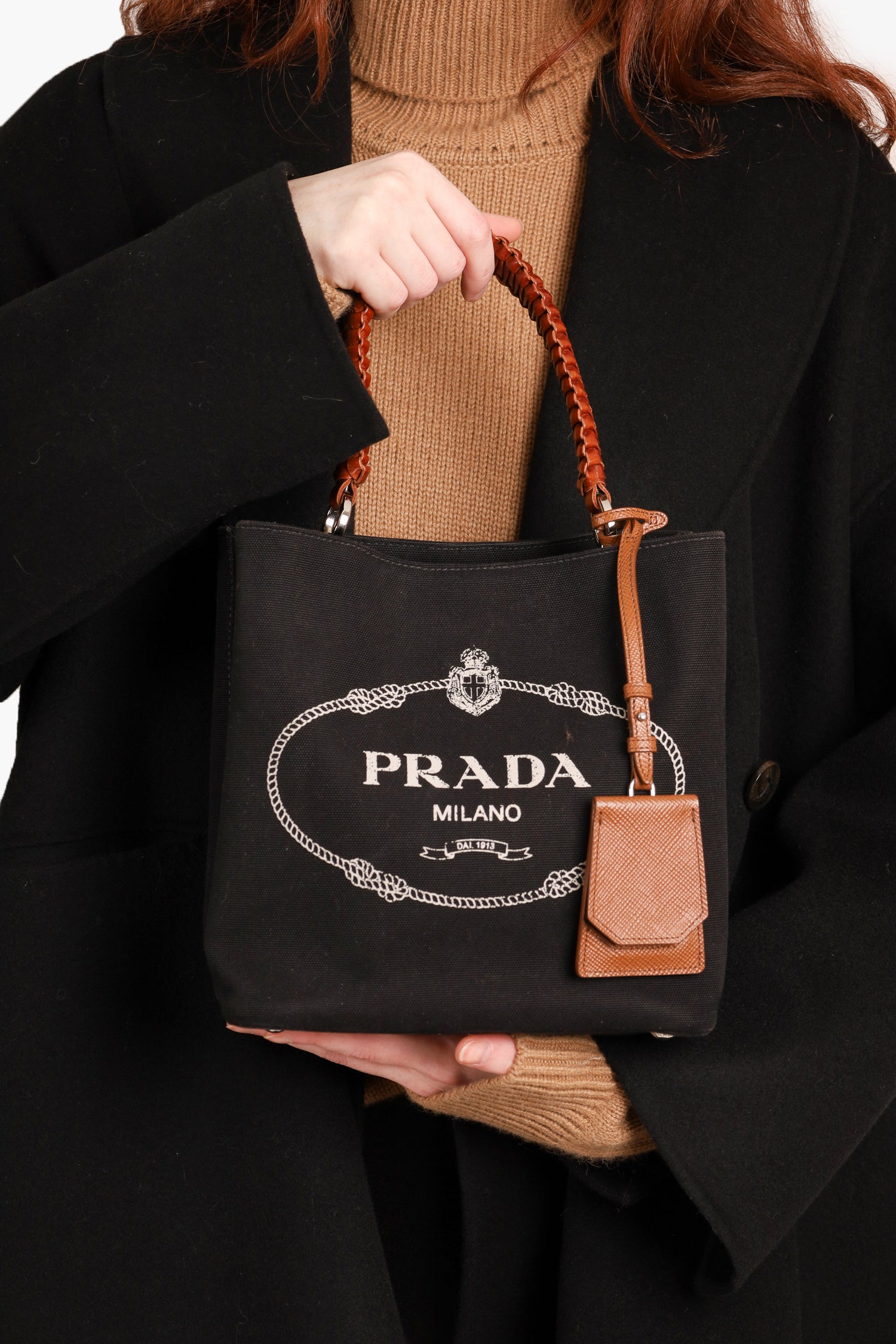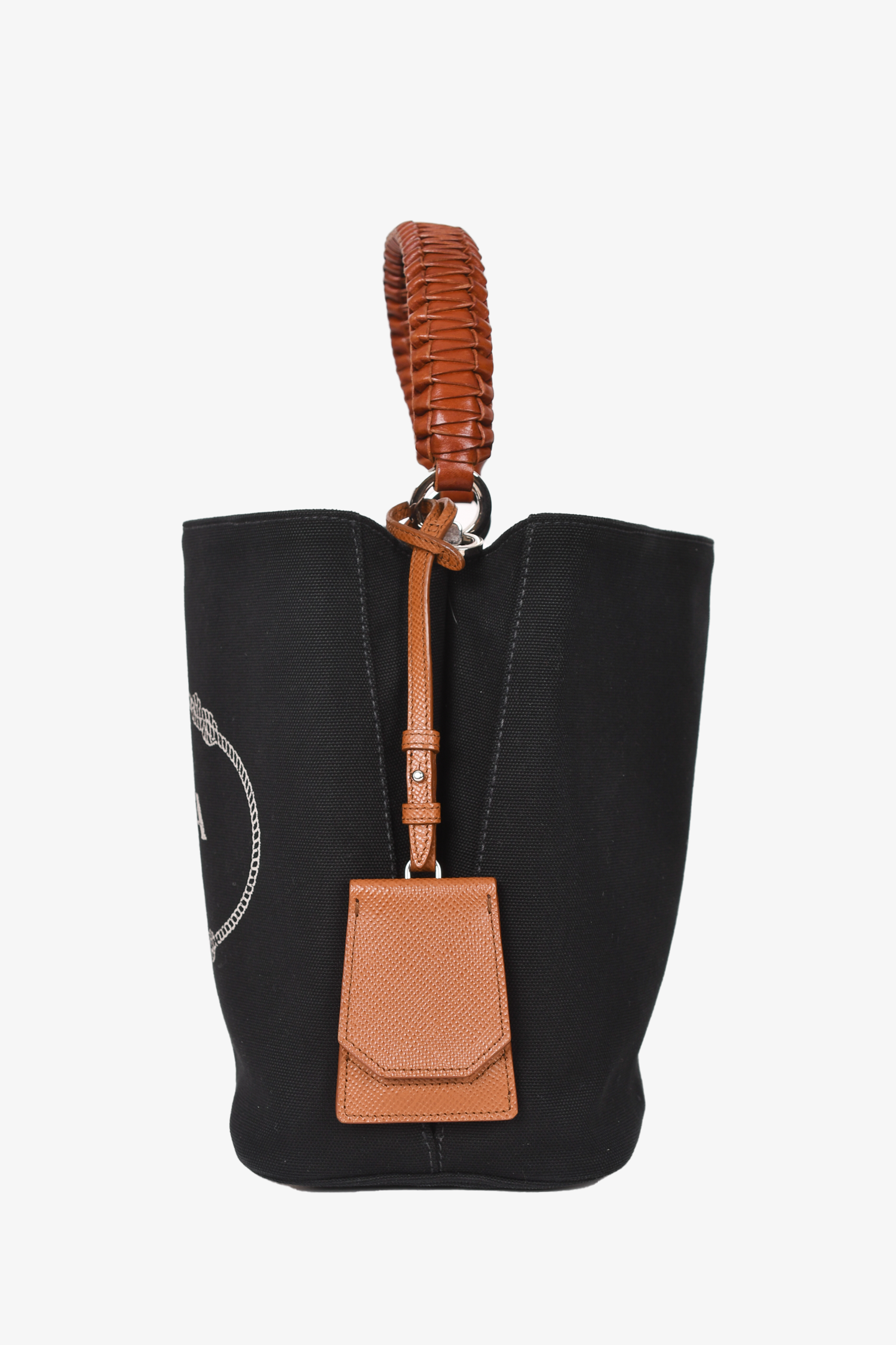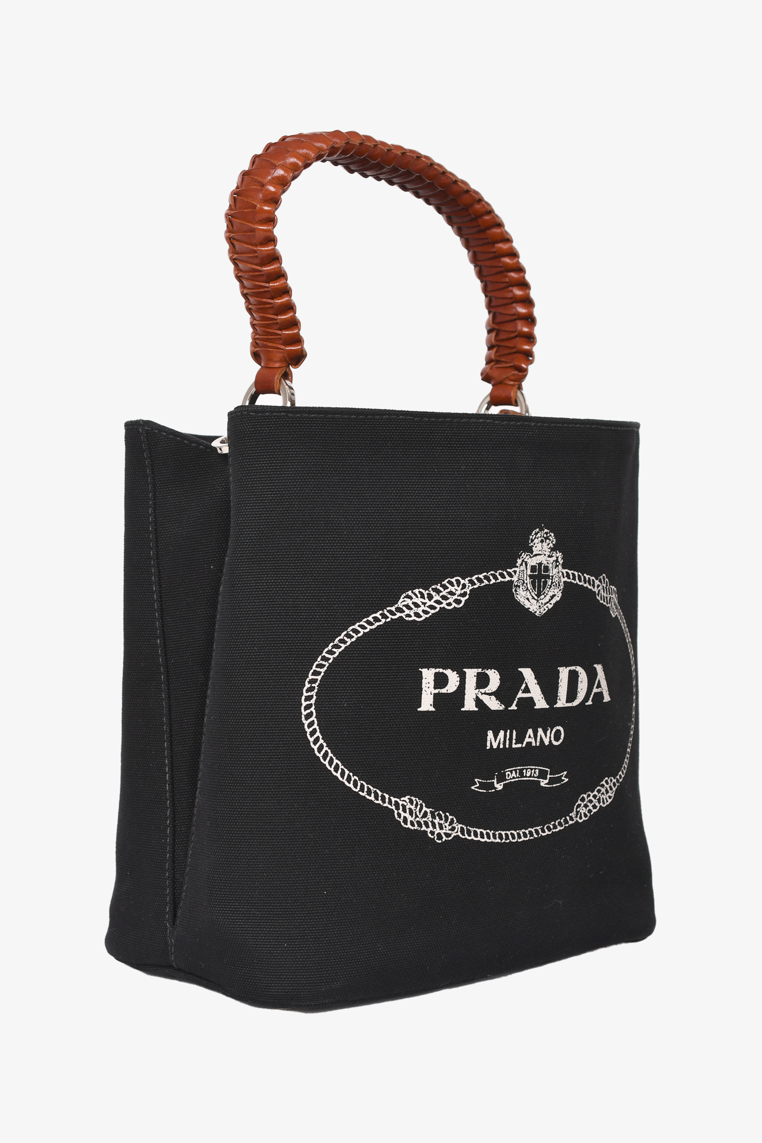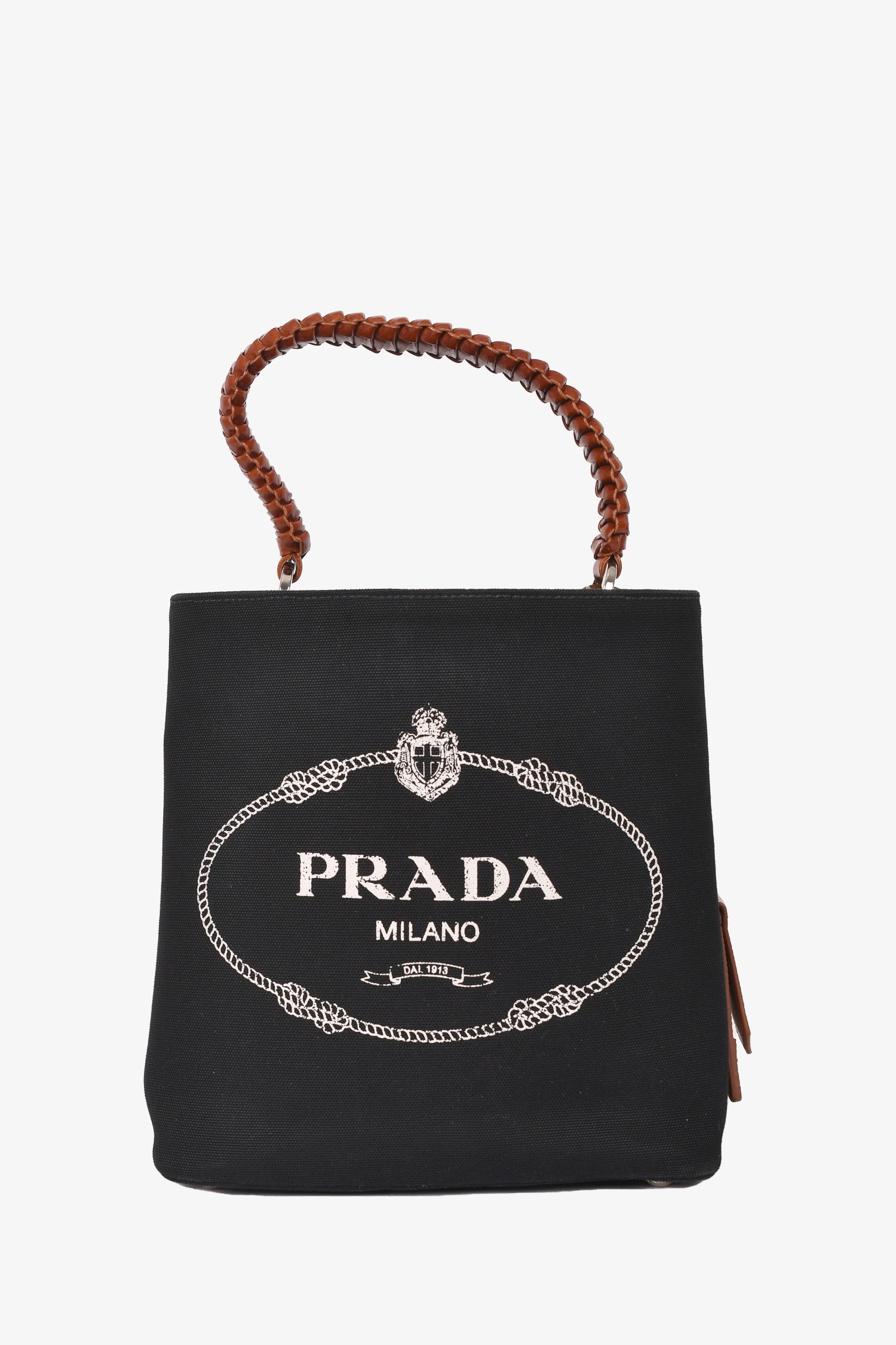 Refresh availabilityPrada Black Canvas Panier Bucket Bag. 4 exterior slit pockets. Magnetic tab closure. 2 compartments. 1 interior slip pocket. Silver-tone hardware. Tonal stitching.
