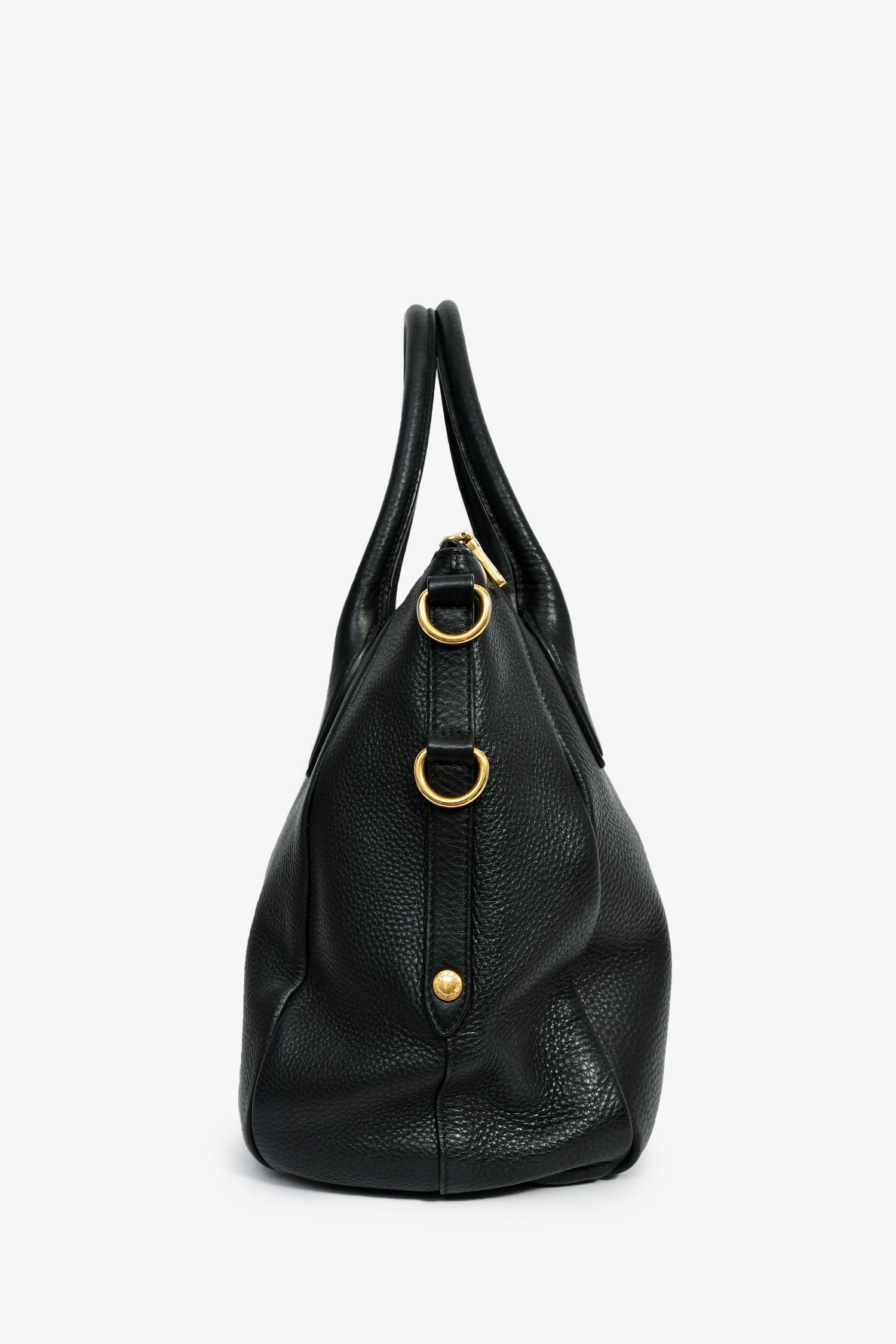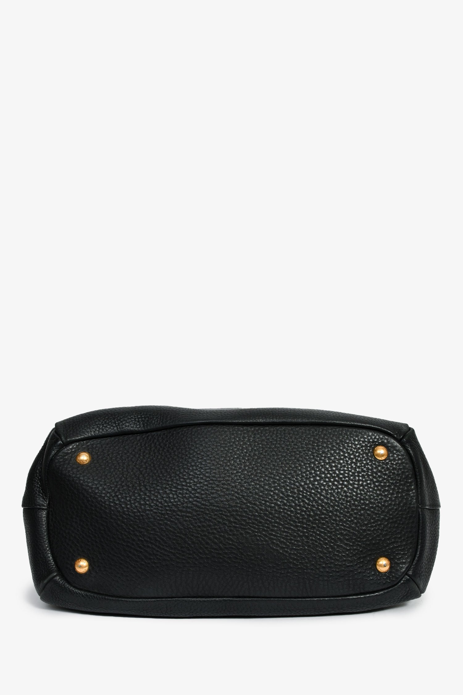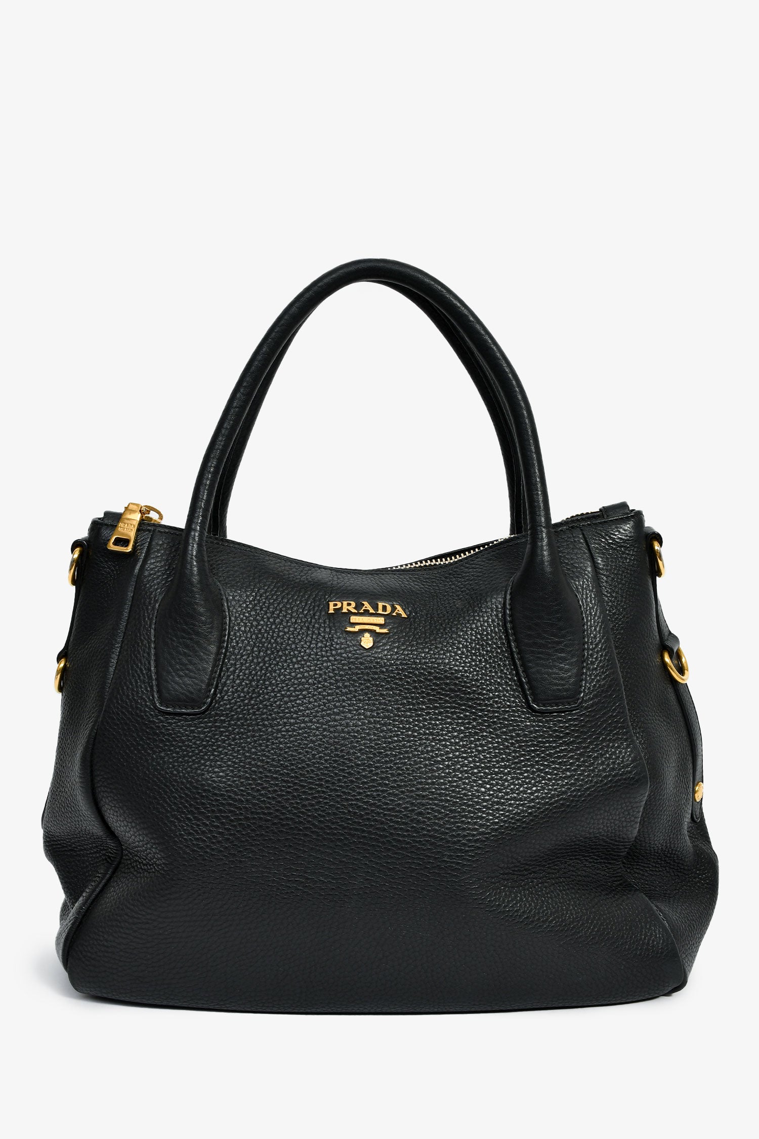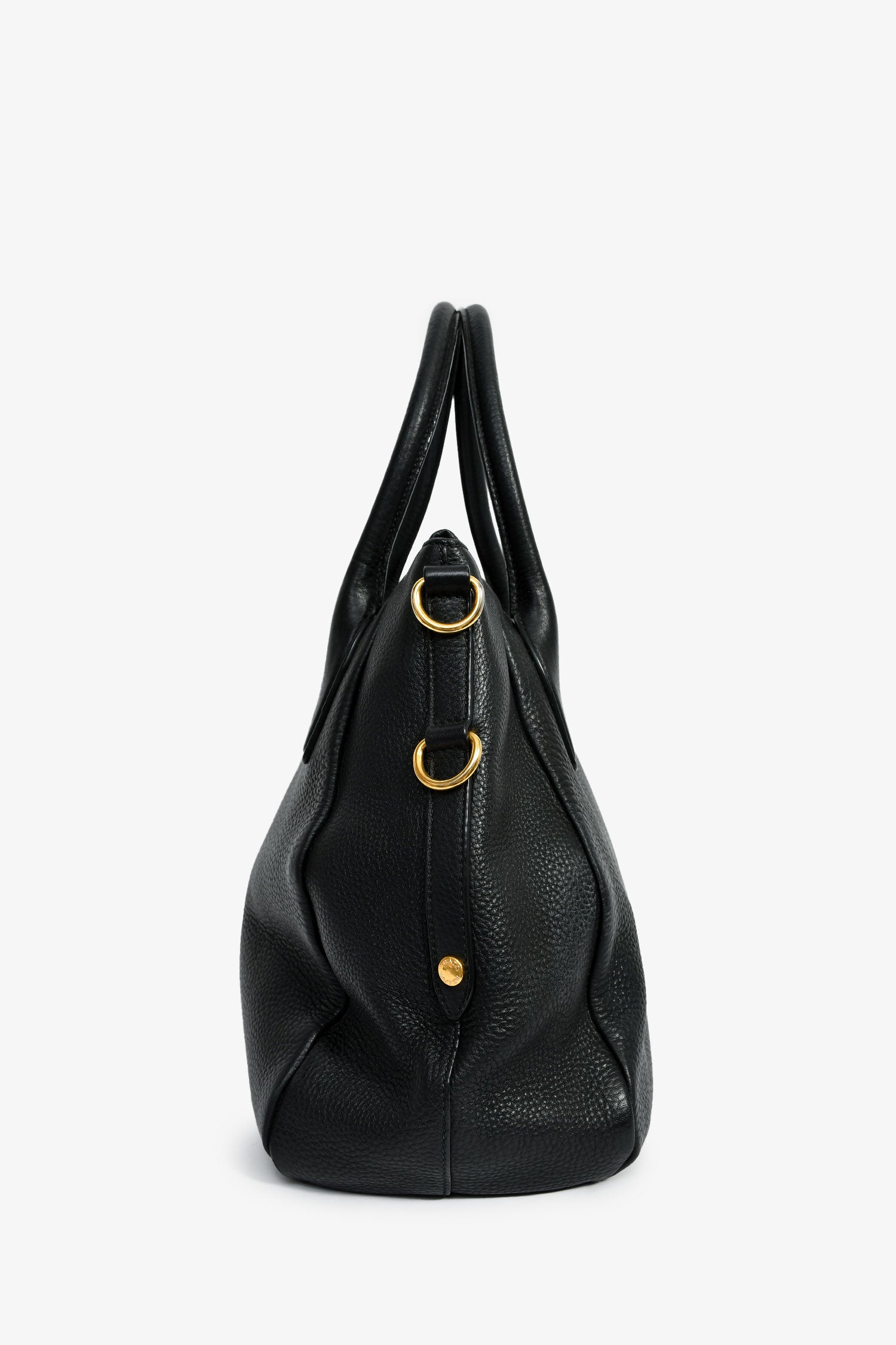 Refresh availabilityPrada Black Grained Leather Logo Top Handle Bag. Top zip closure. Twin top handles. Protective base studs. Lined interior. 2 interior wall pockets; 1 slip, 1 with zip closure. Gold-tone hardware. Tonal stitching.