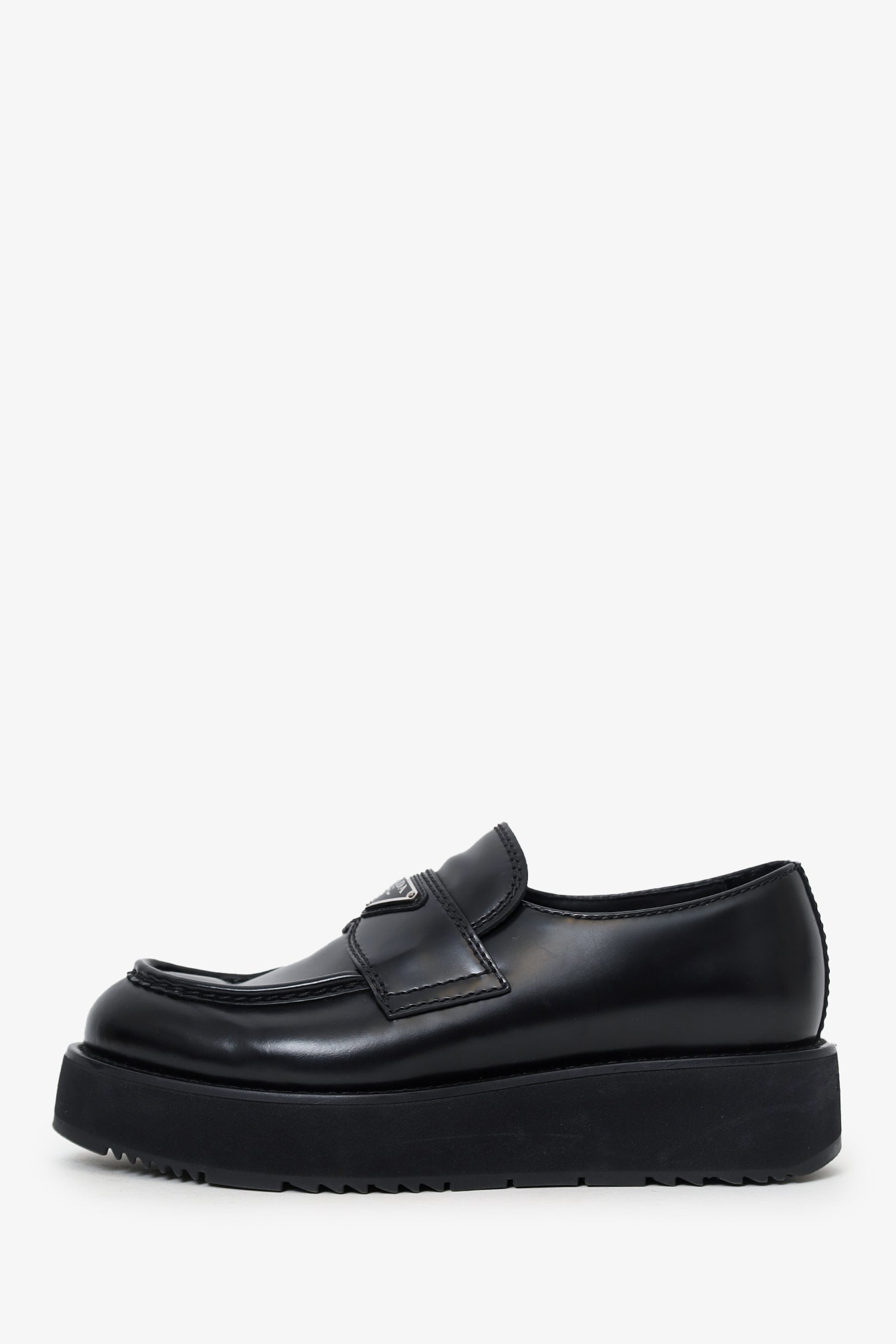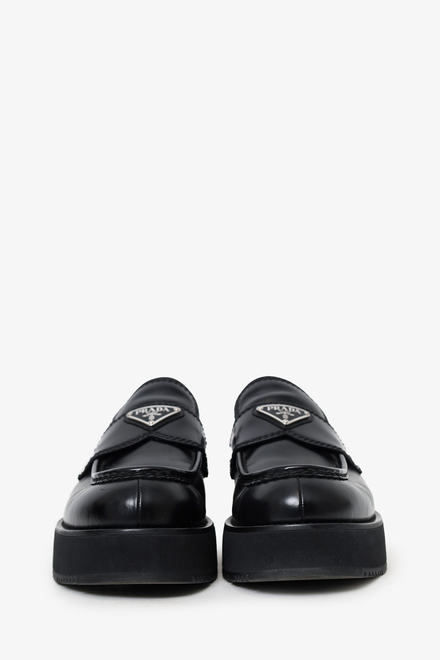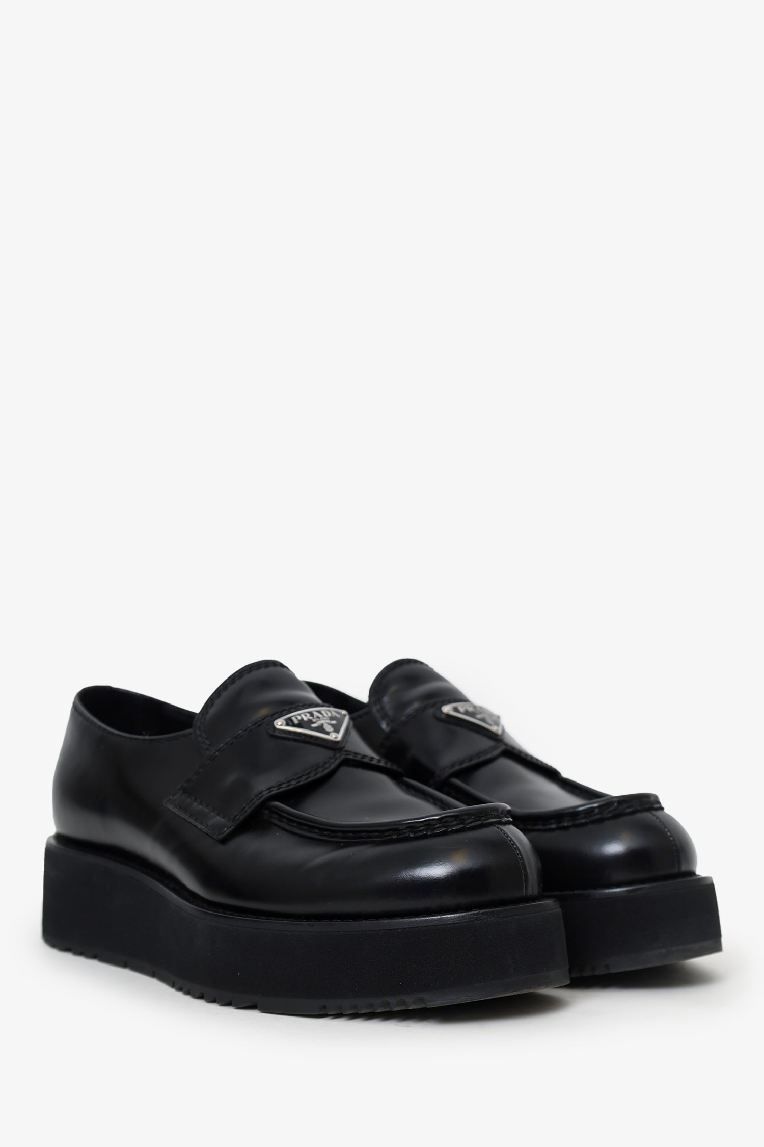 Refresh availabilityPrada Black Leather Brushed Loafers. Slip-on. Round toe. Silver-tone hardware. Tonal stitching.