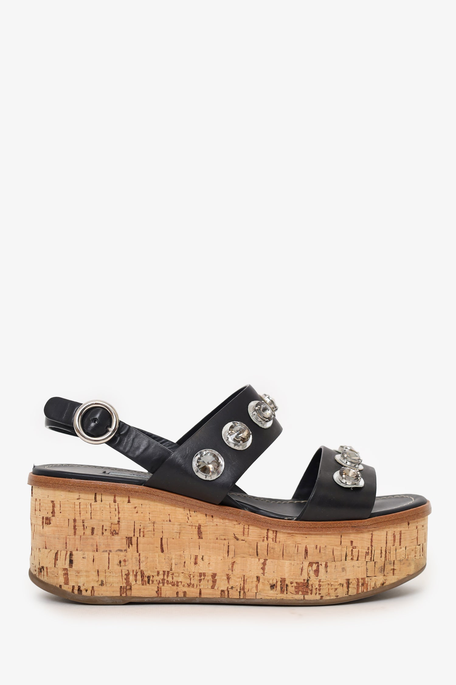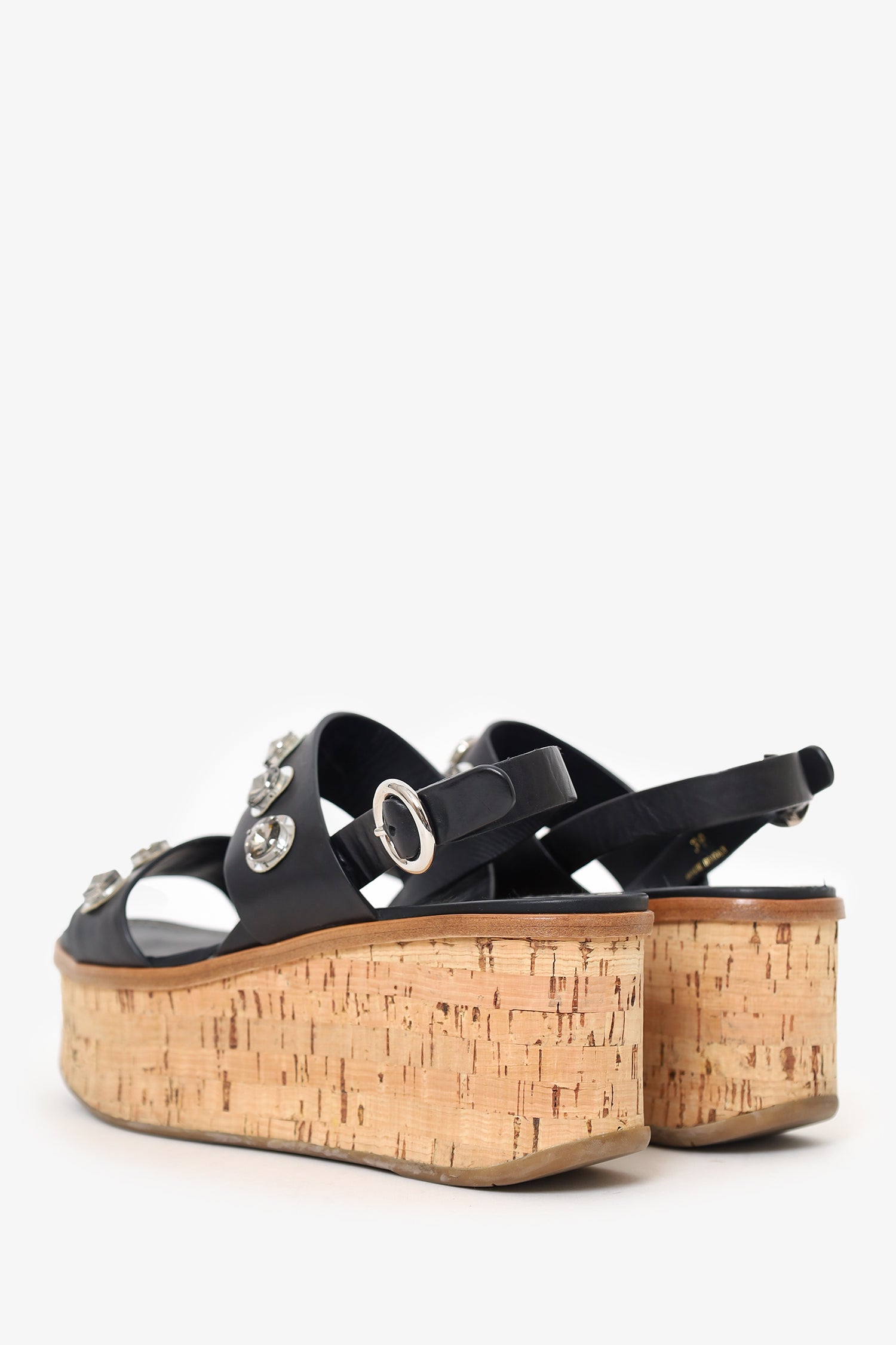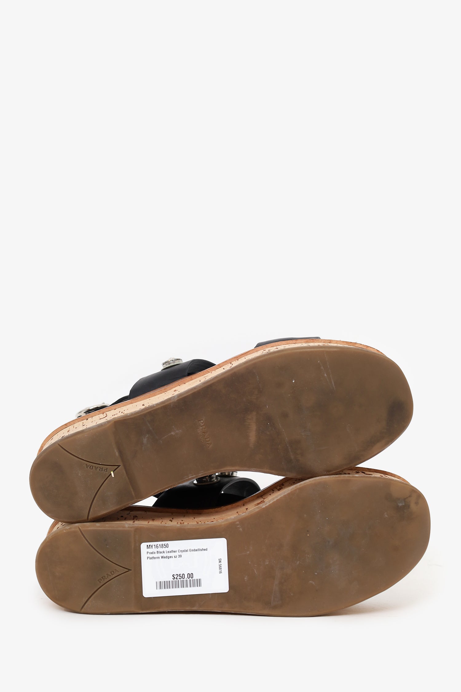 Refresh availabilityPrada Black Leather Crystal Embellished Platform Wedges. Slip-on. Open-round toe. Slingback with adjustable buckle closure. Silver-tone hardware. Tonal and contrast stitching.