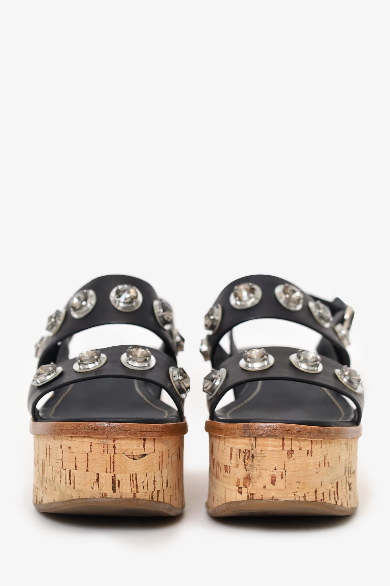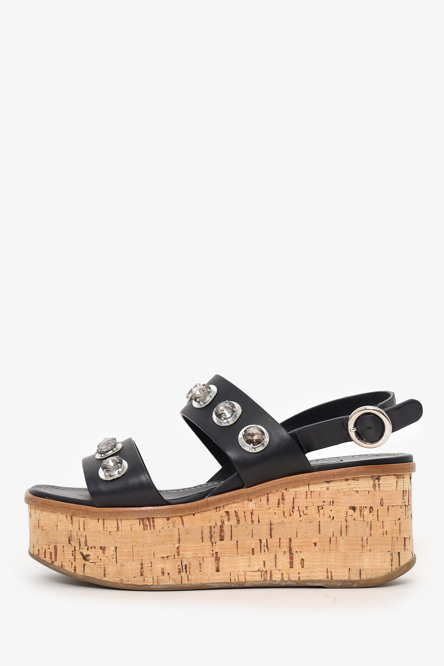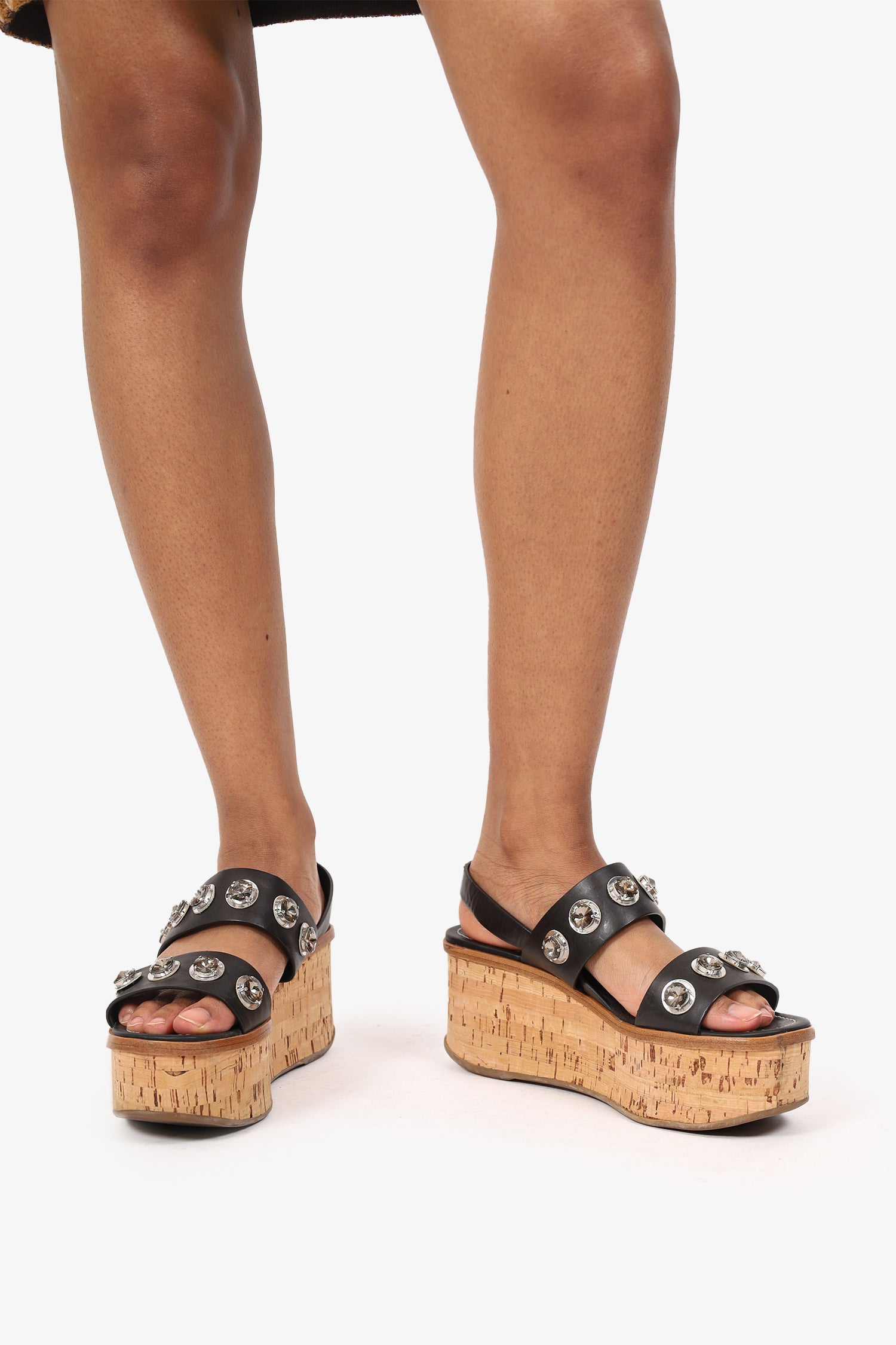Refresh availabilityPrada Black Leather Crystal Embellished Platform Wedges. Slip-on. Open-round toe. Slingback with adjustable buckle closure. Silver-tone hardware. Tonal and contrast stitching.