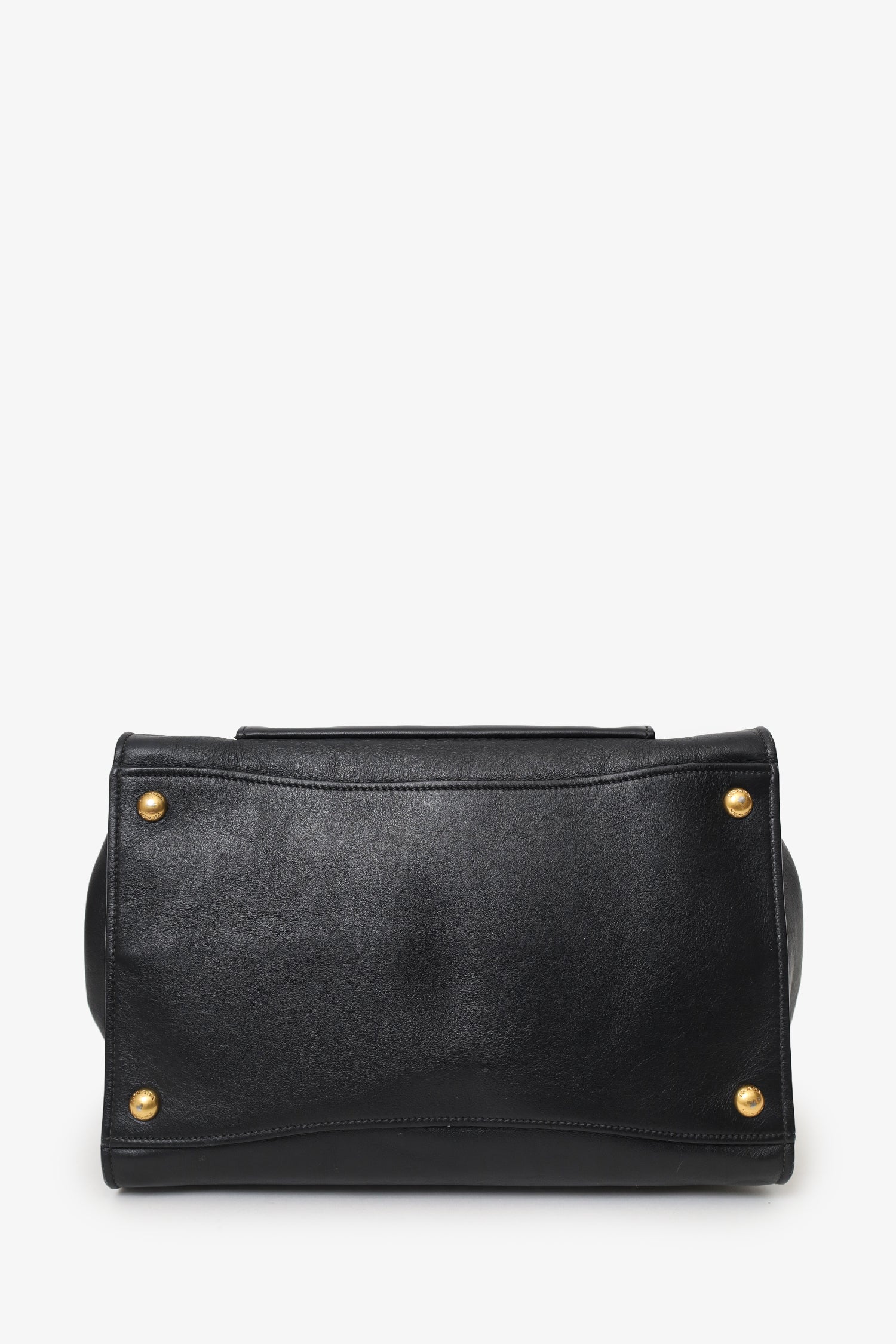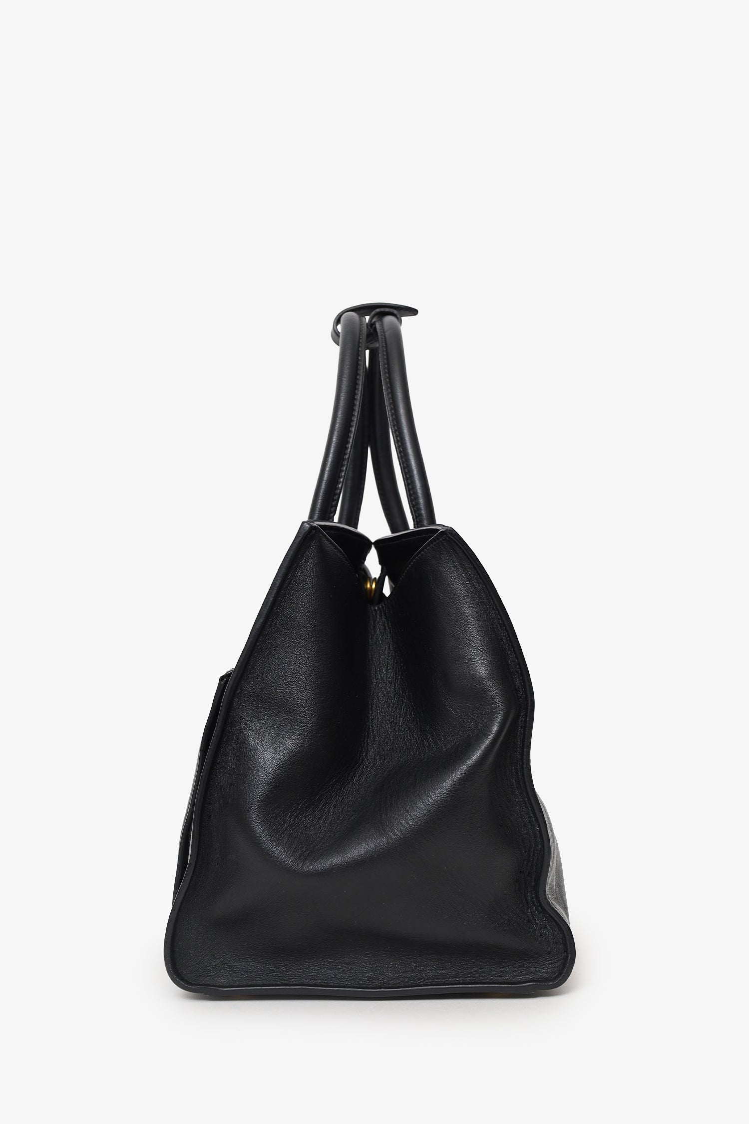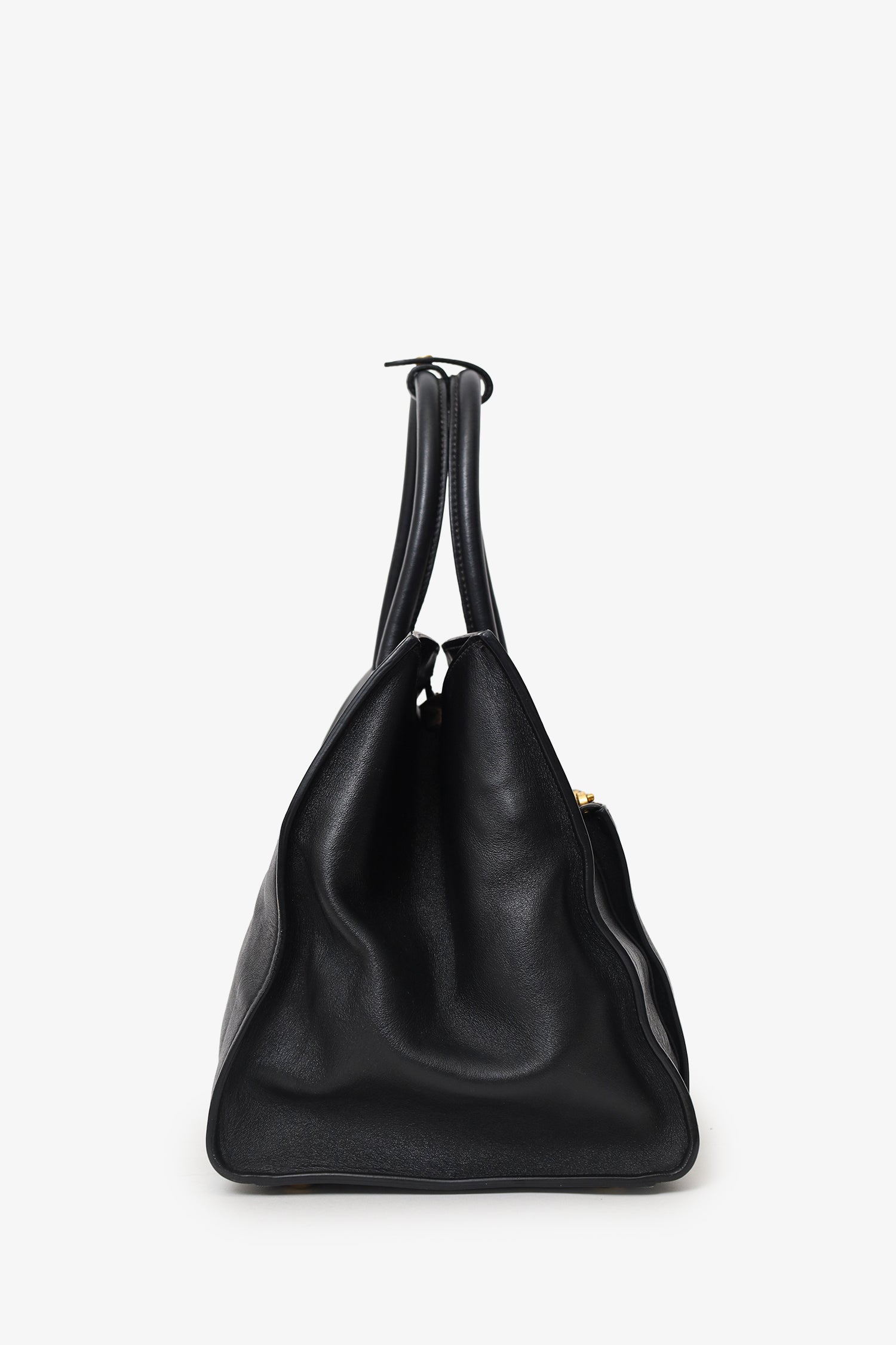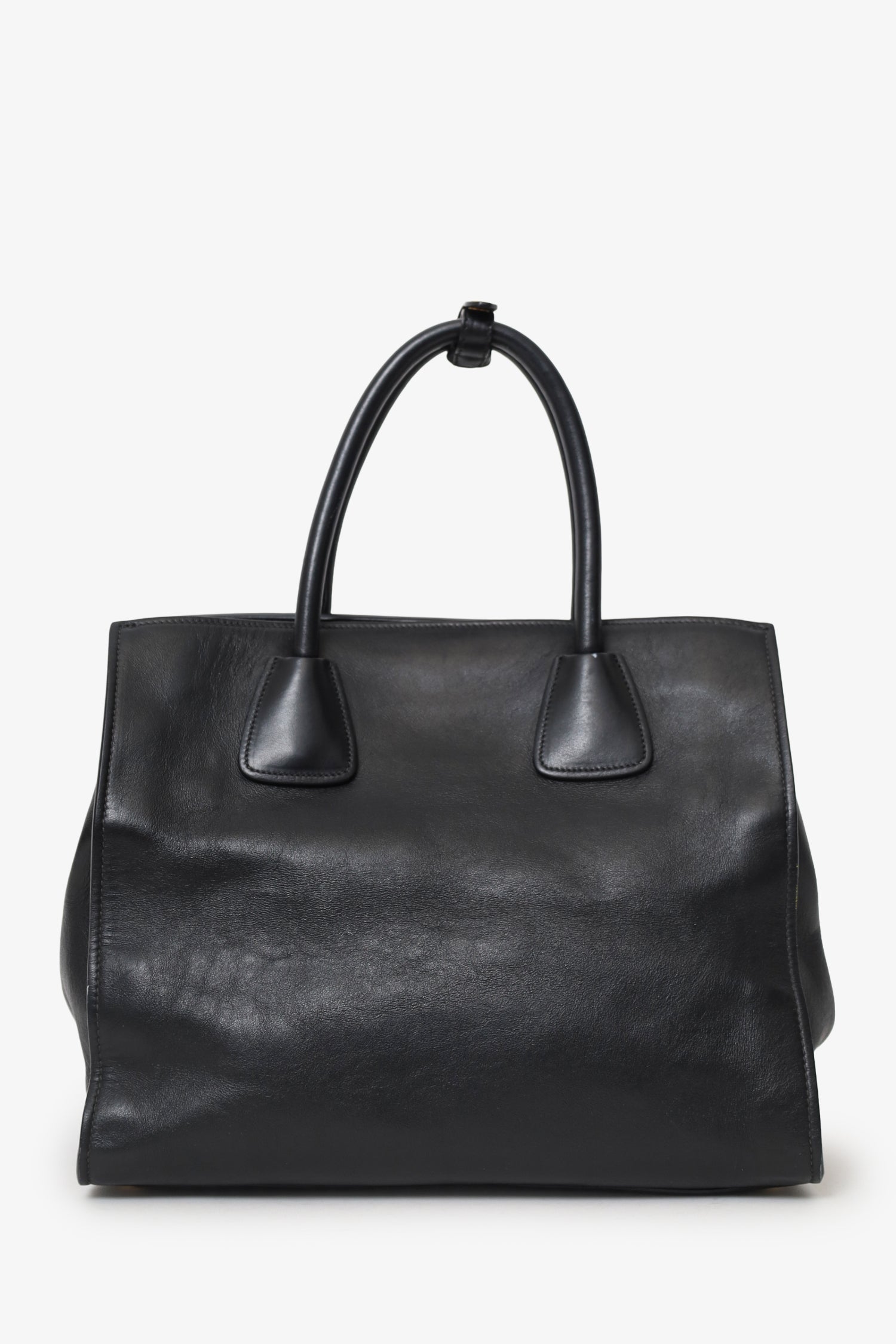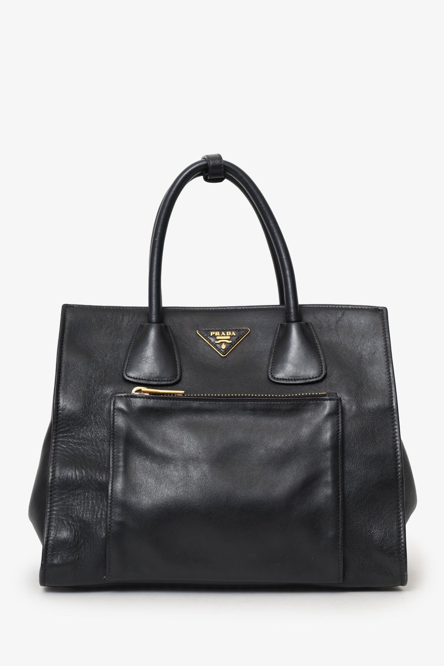 Refresh availabilityPrada Black Leather Front Pocket Wing Convertible Tote. Interior snap button-up closure. Twin top handles. Single exterior front zip pocket. Protective base studs. Lined interior with 3 pockets; 2 zip, and 1 slip. Gold-tone hardware. Tonal stitching.