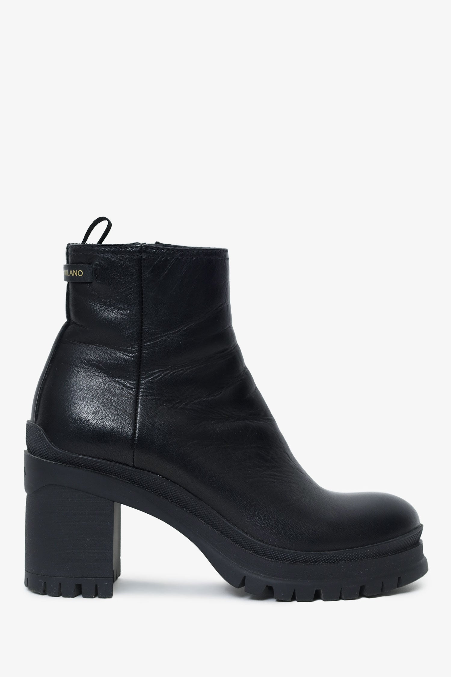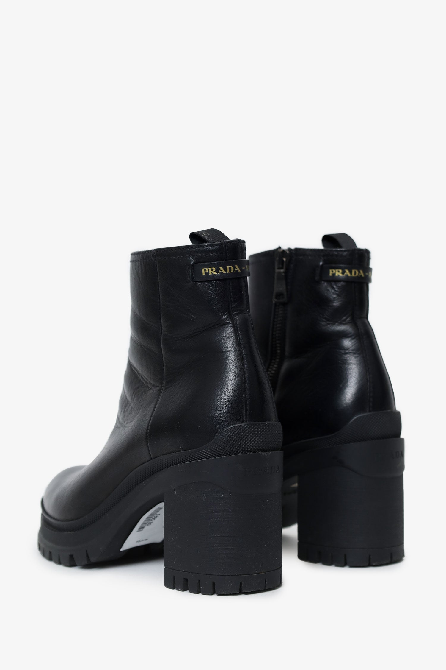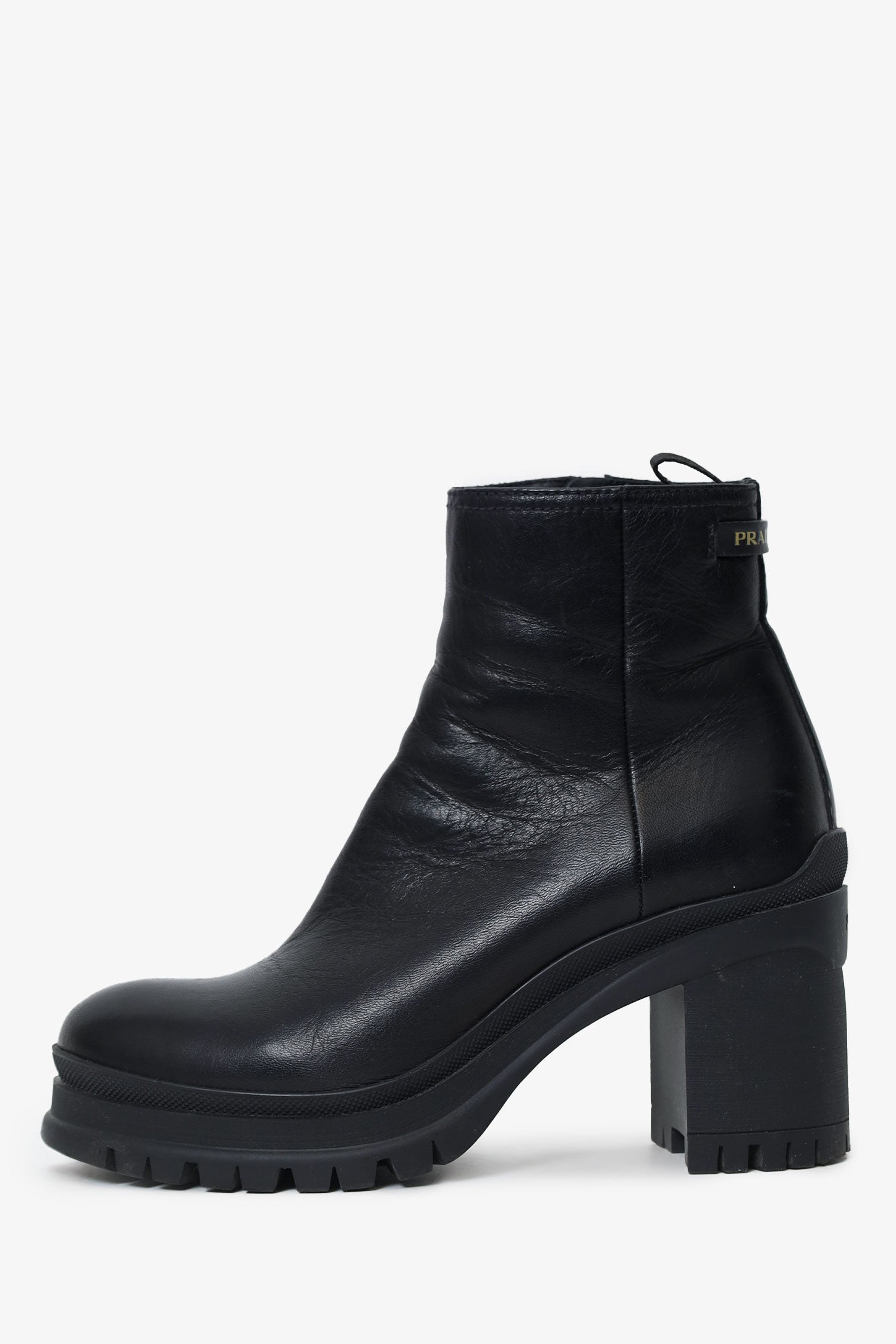 Refresh availabilityPrada Black Leather Heeled Chelsea Boots. Pull-on. Round toe. Side zip closure. Rear pull tabs. Block heel. Leather lined interior. Gunmetal-hardware. Tonal stitching.