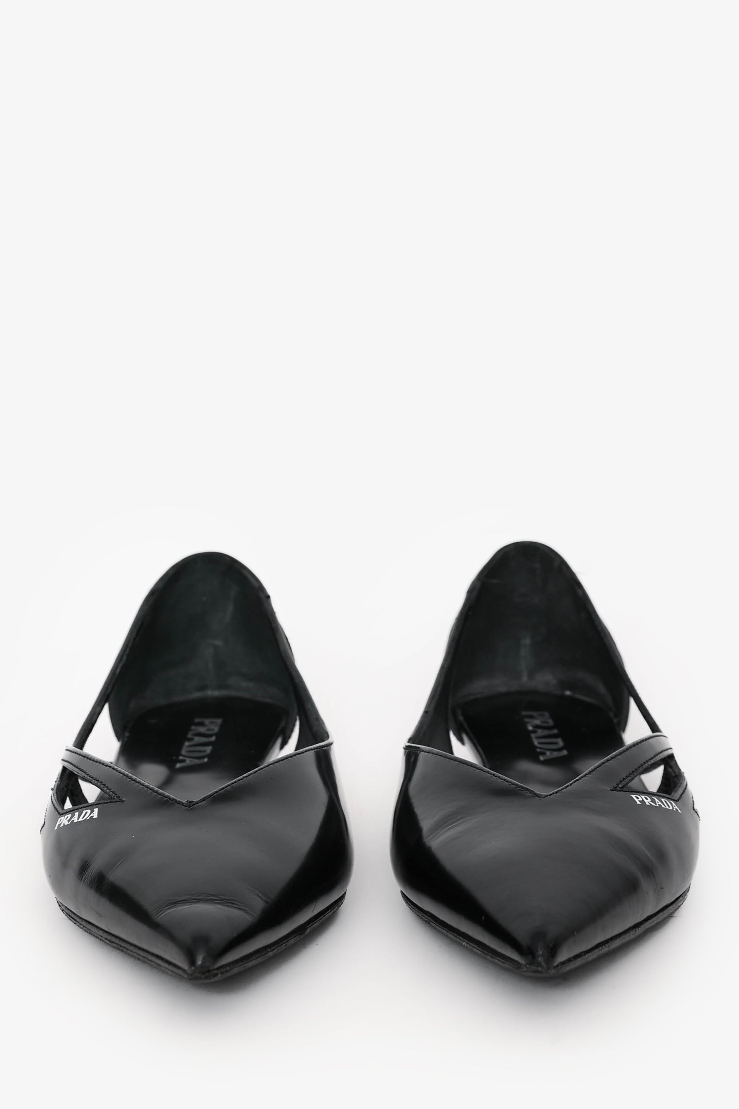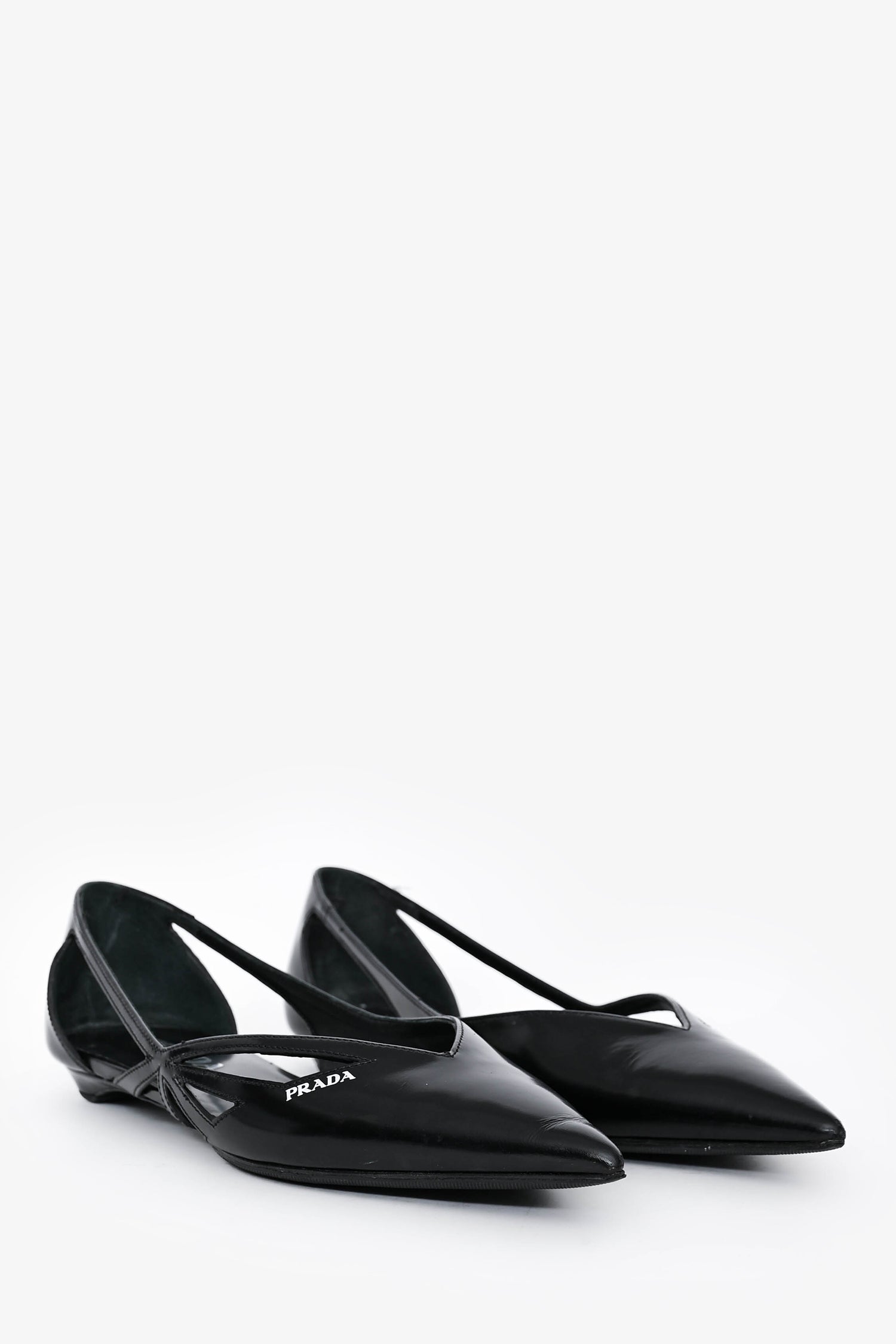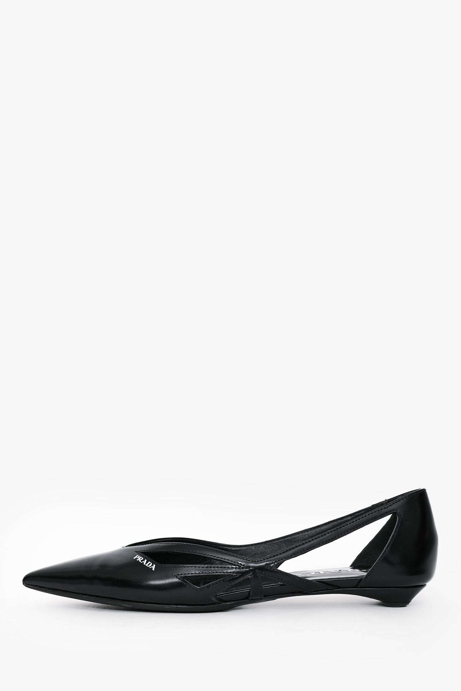 Refresh availabilityPrada Black Leather Logo Pointed Flats. Slip-on. Cut-out detailing on the sides. Logo on the exterior upper. Topy'd soles.