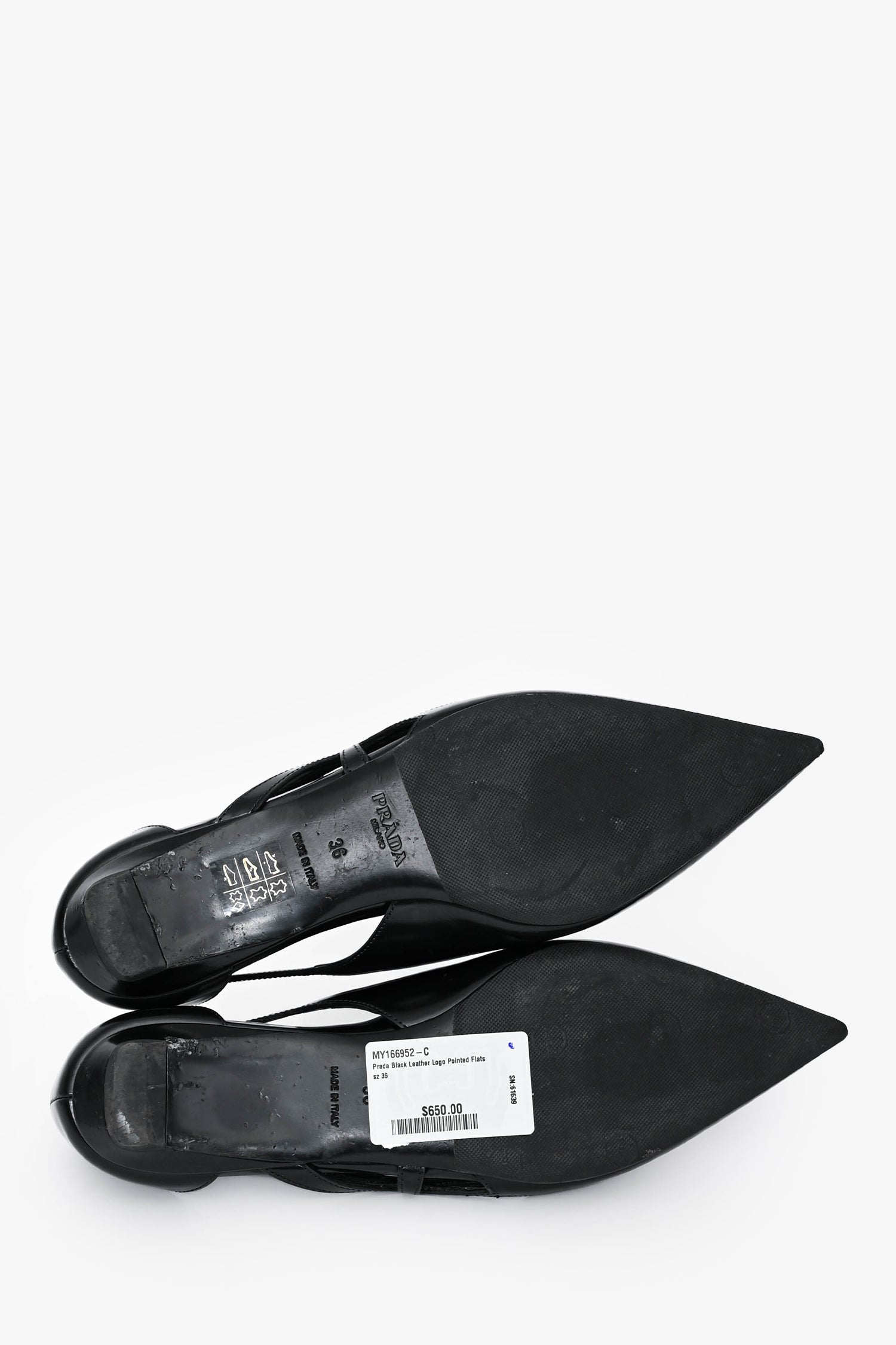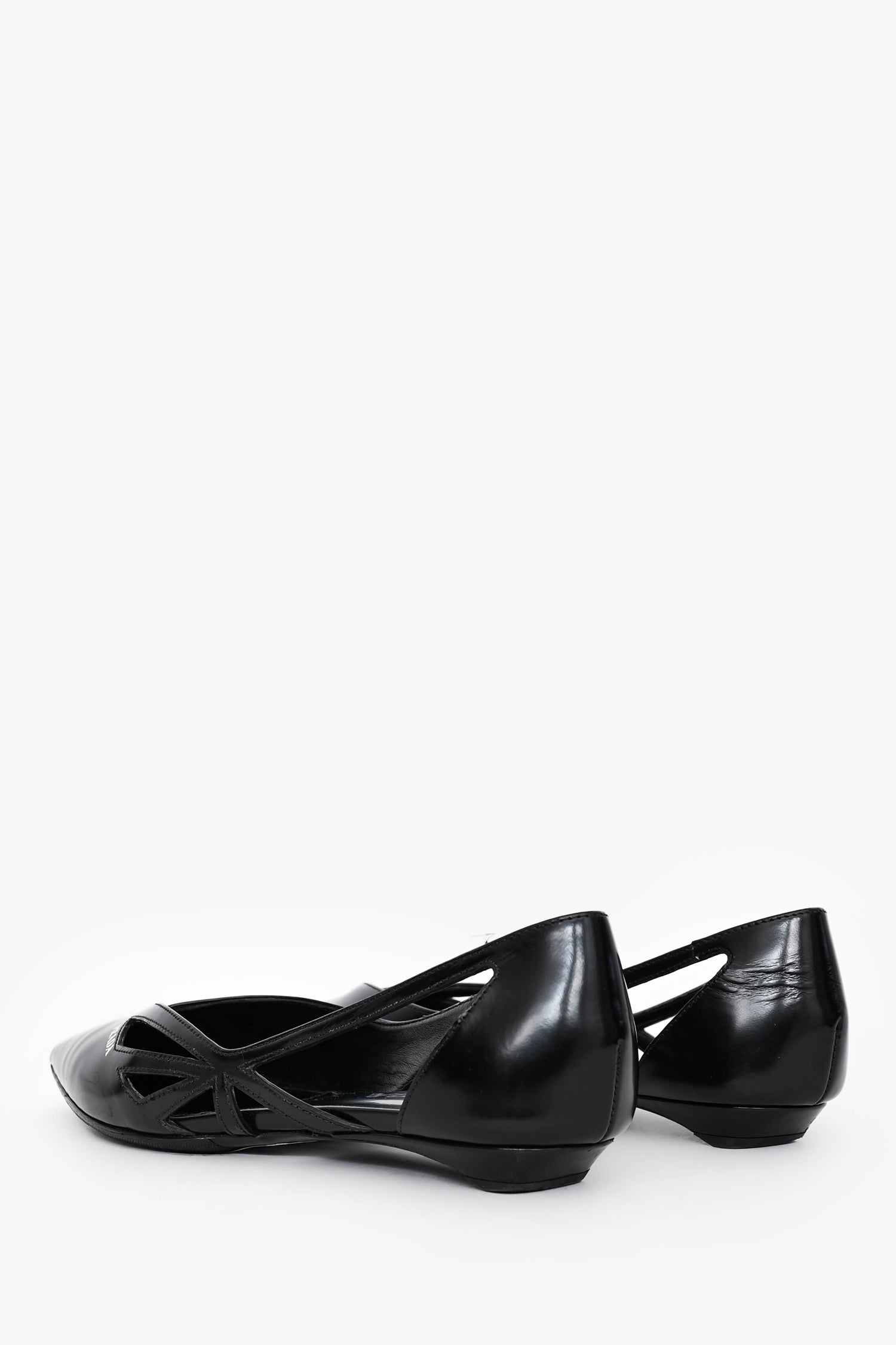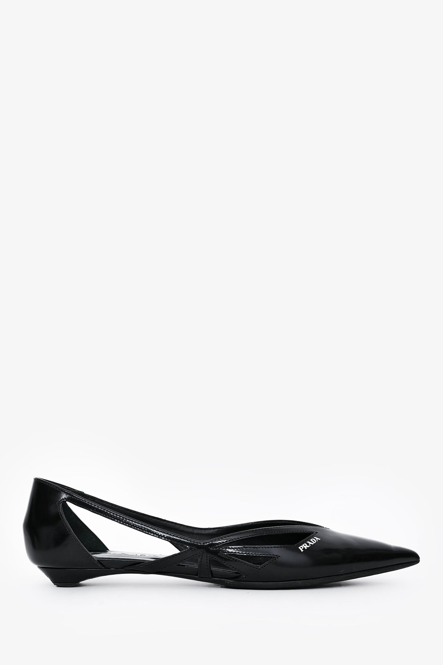 Refresh availabilityPrada Black Leather Logo Pointed Flats. Slip-on. Cut-out detailing on the sides. Logo on the exterior upper. Topy'd soles.