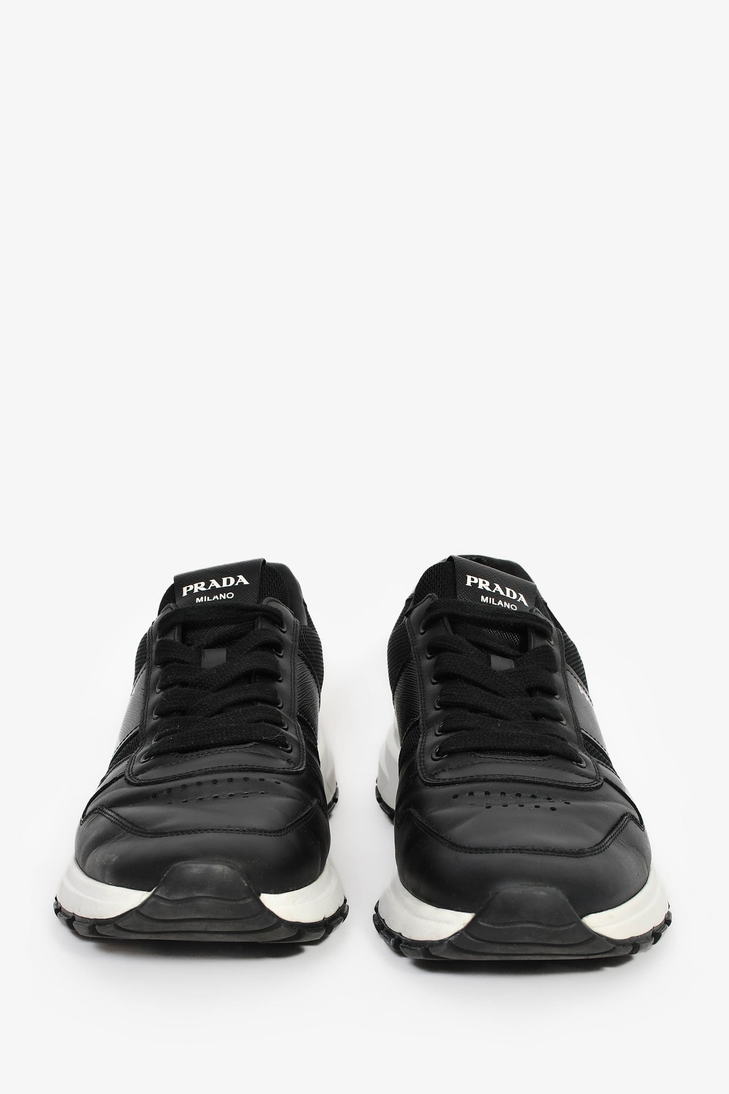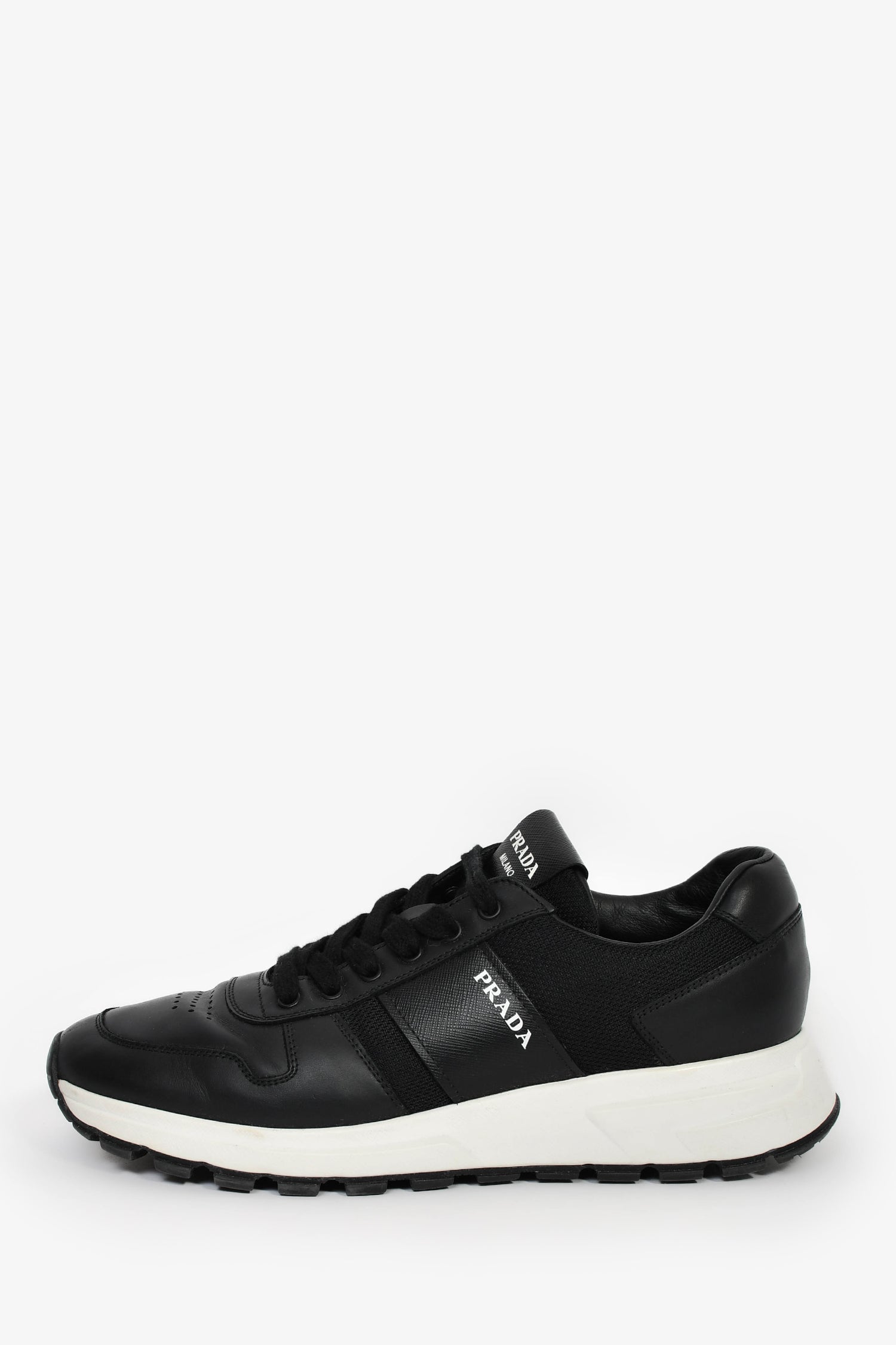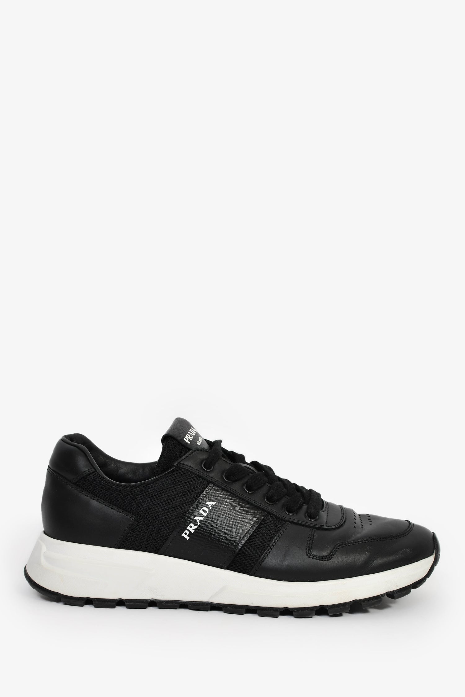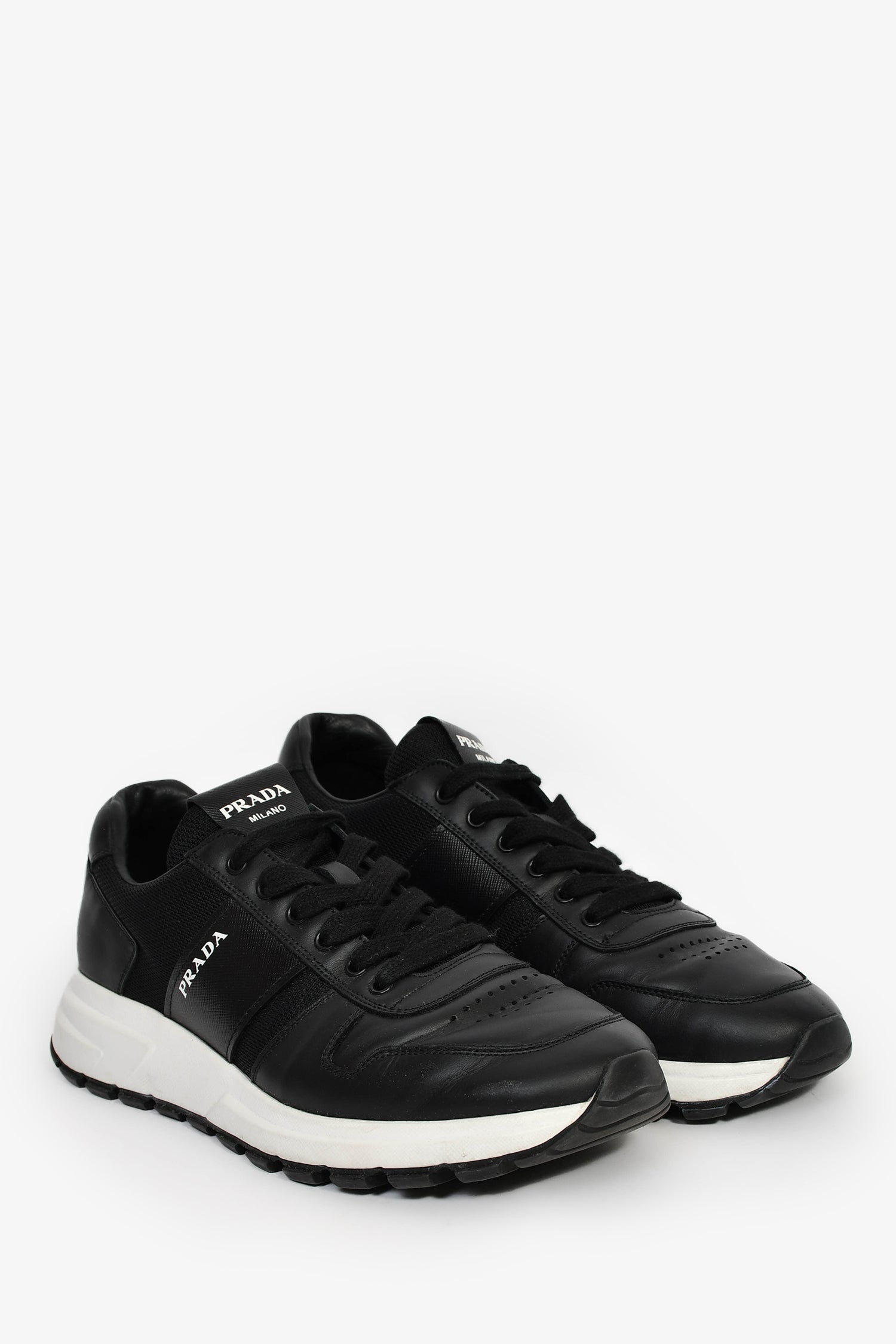 Refresh availabilityPrada Black Leather Logo Sneakers. Slip-on. Round toe. Lace-up closure. Leather insoles. Rubber soles.