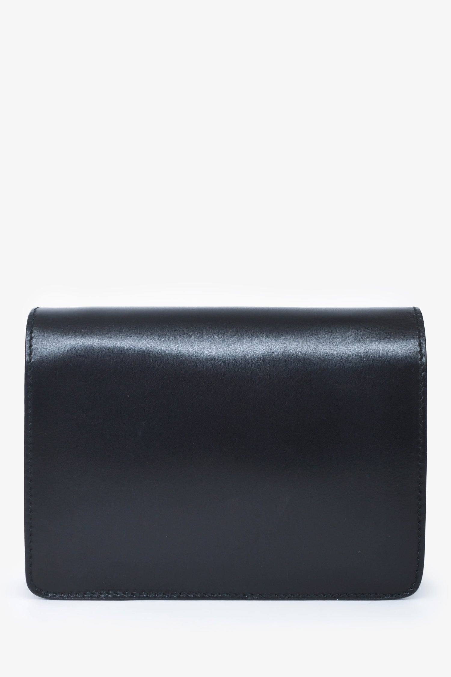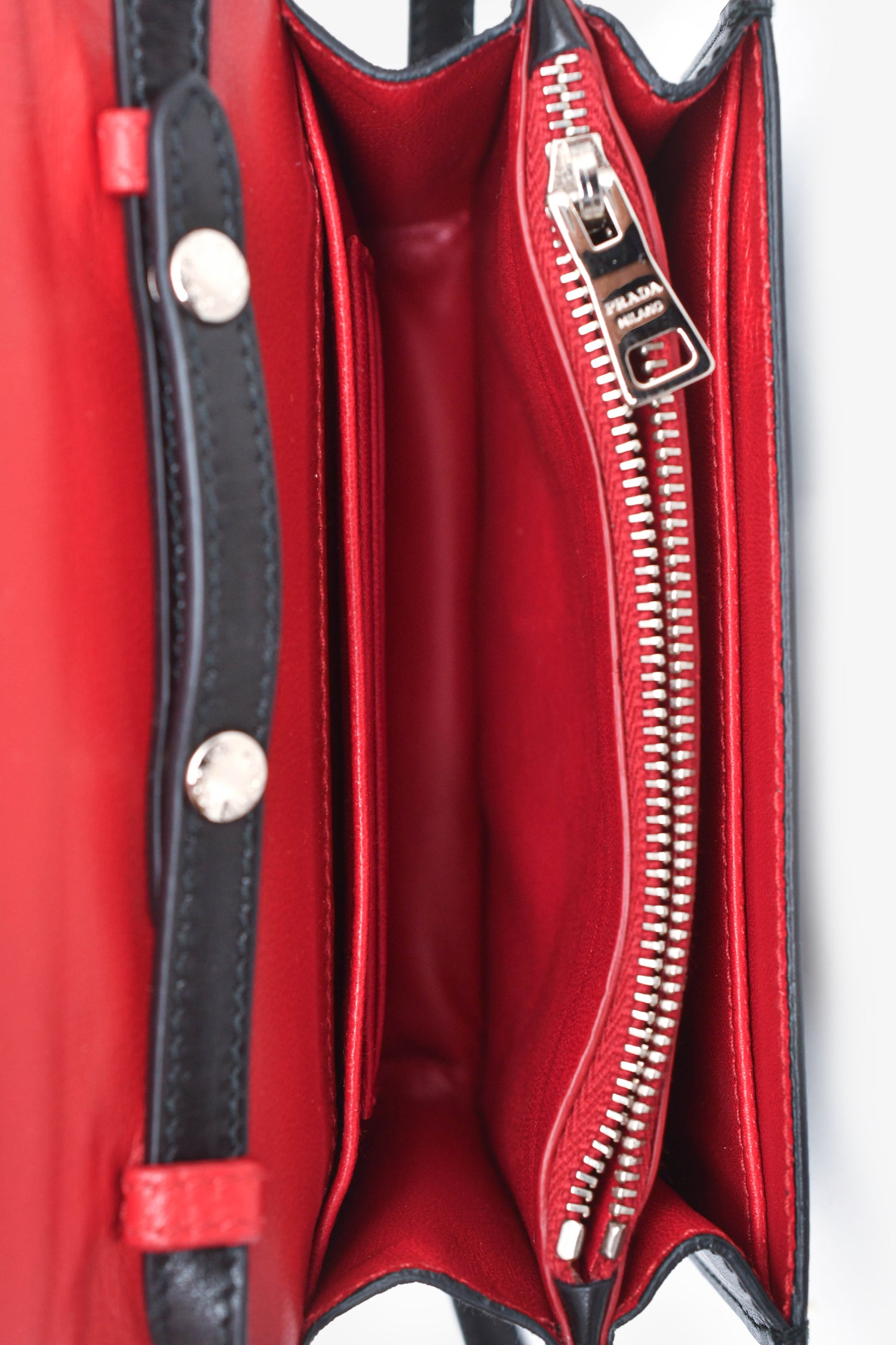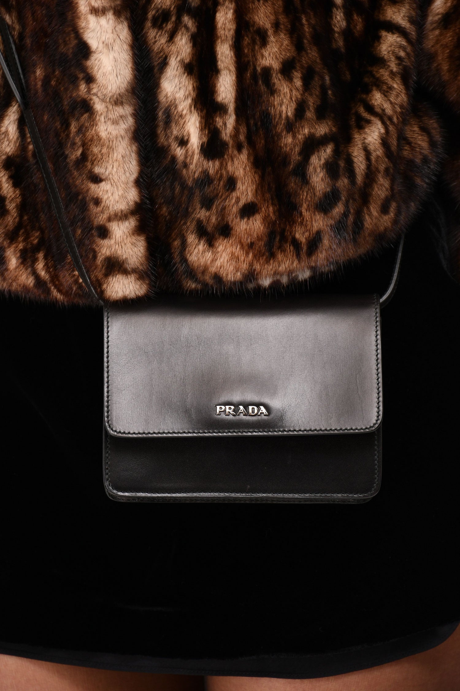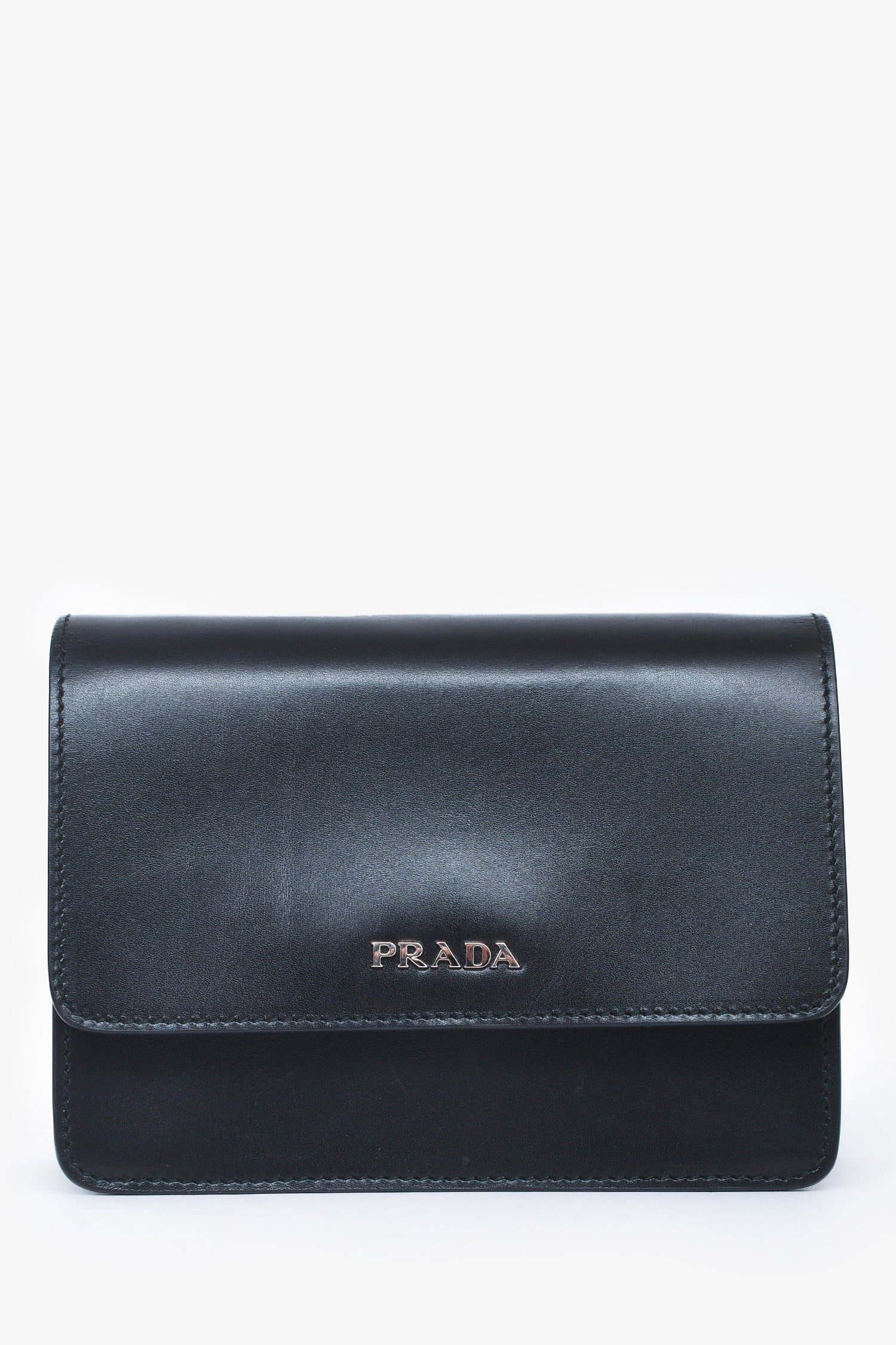 Refresh availabilityPrada Black Leather Mini Crossbody. Top magnetic button closure. Three compartments, one with zipper closure. Two interior pockets. Three card holders. Silver-tone hardware. Tonal stitching.