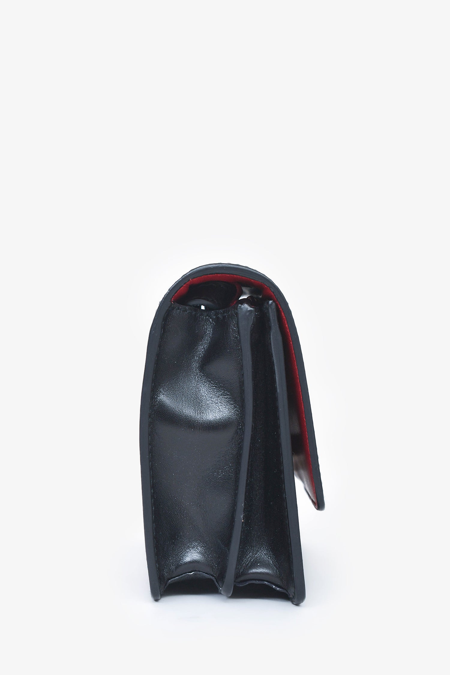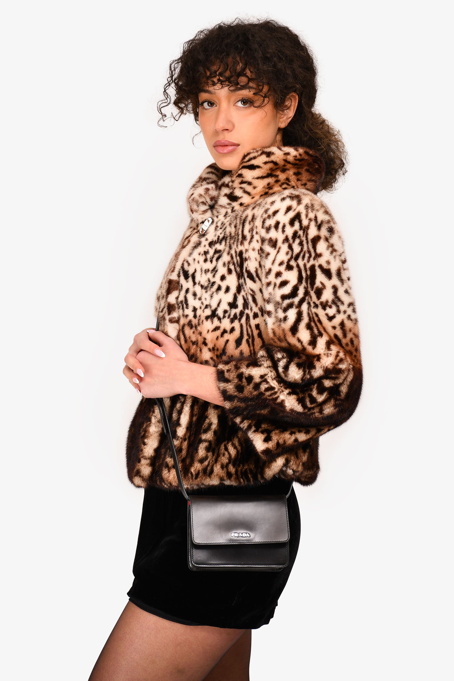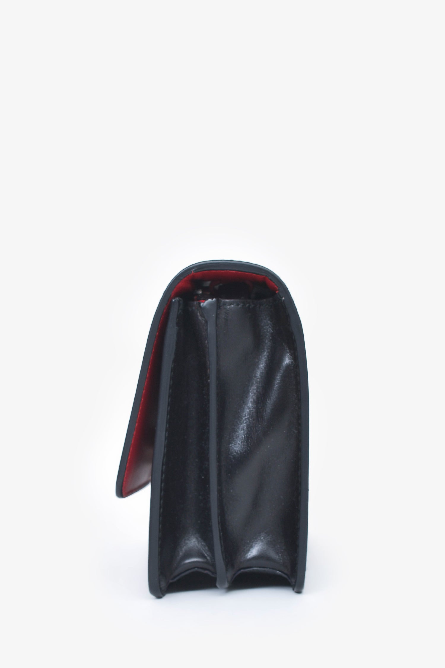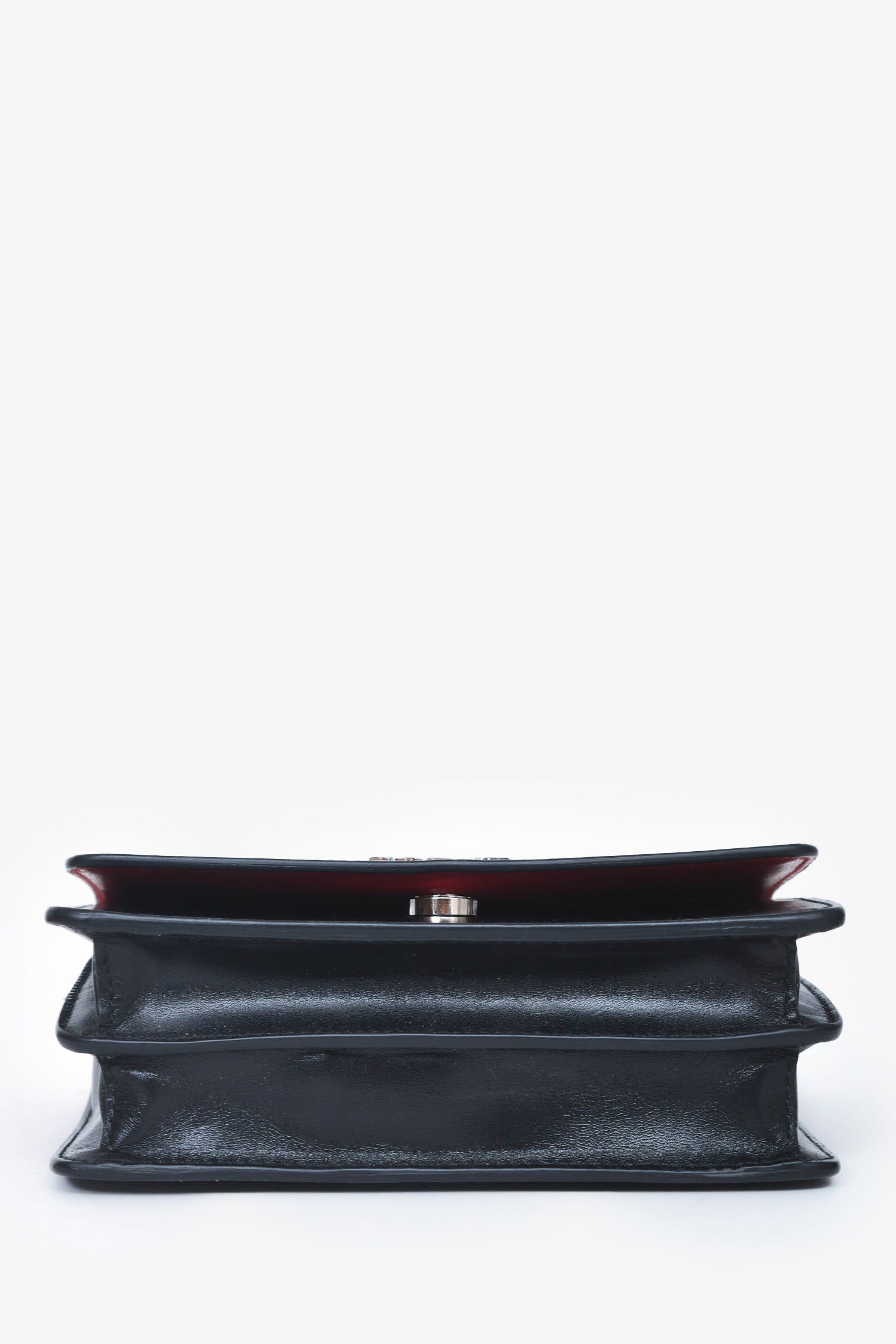 Refresh availabilityPrada Black Leather Mini Crossbody. Top magnetic button closure. Three compartments, one with zipper closure. Two interior pockets. Three card holders. Silver-tone hardware. Tonal stitching.