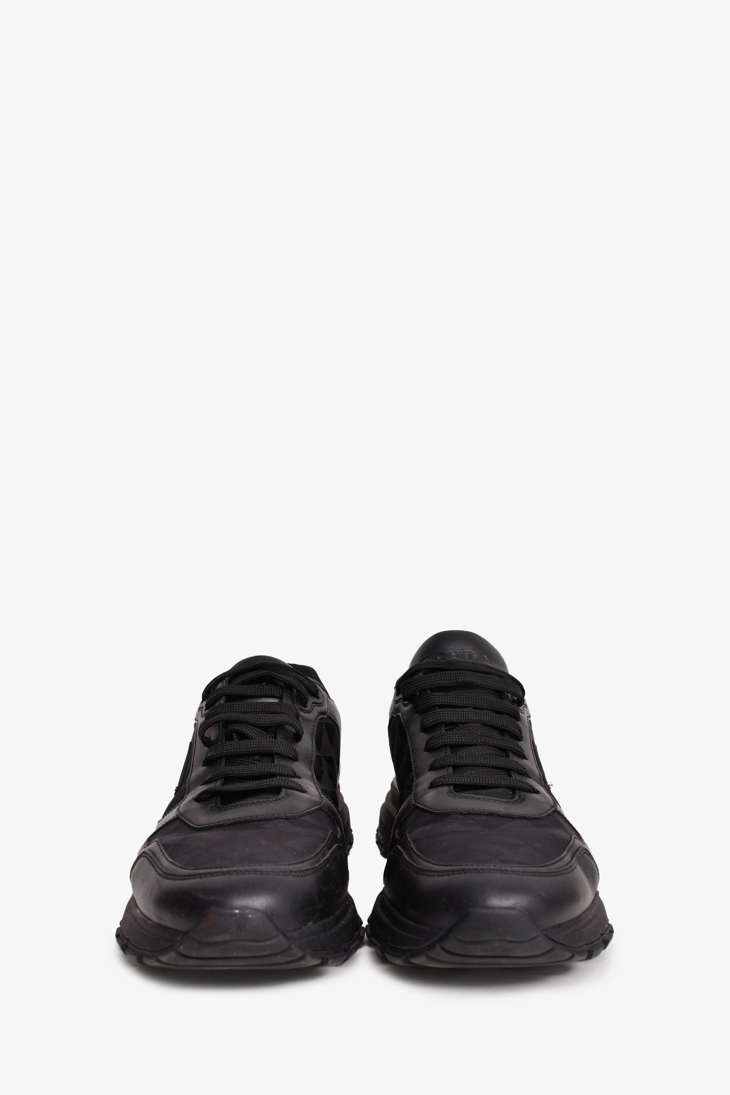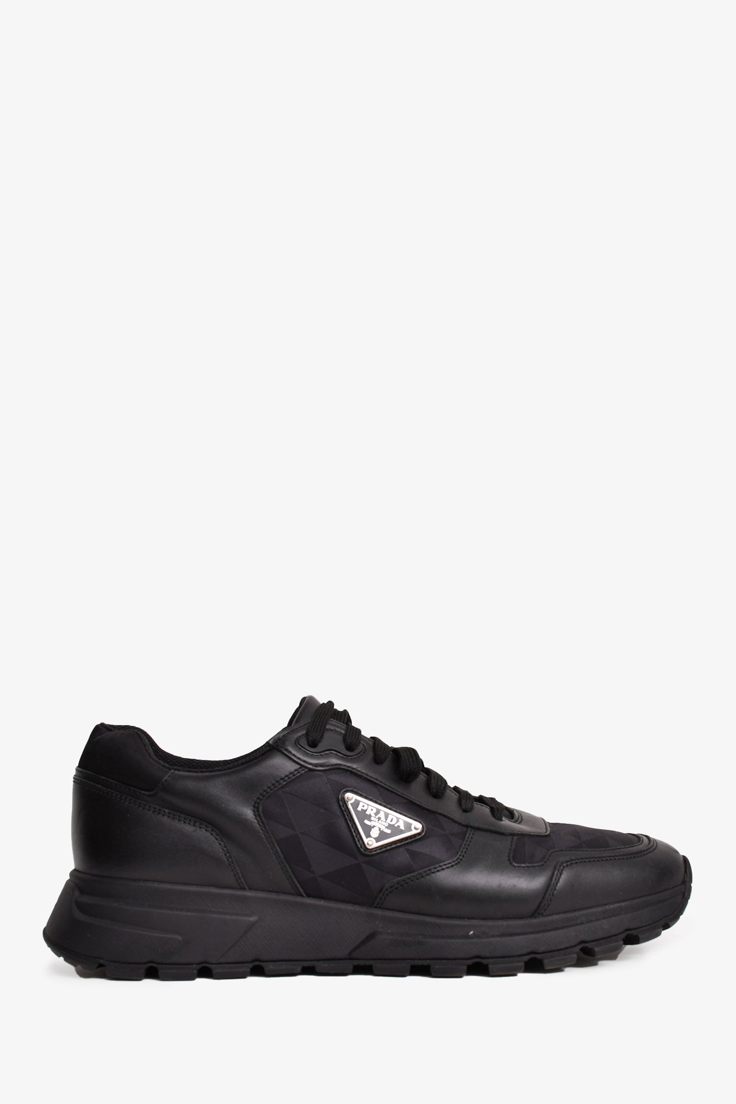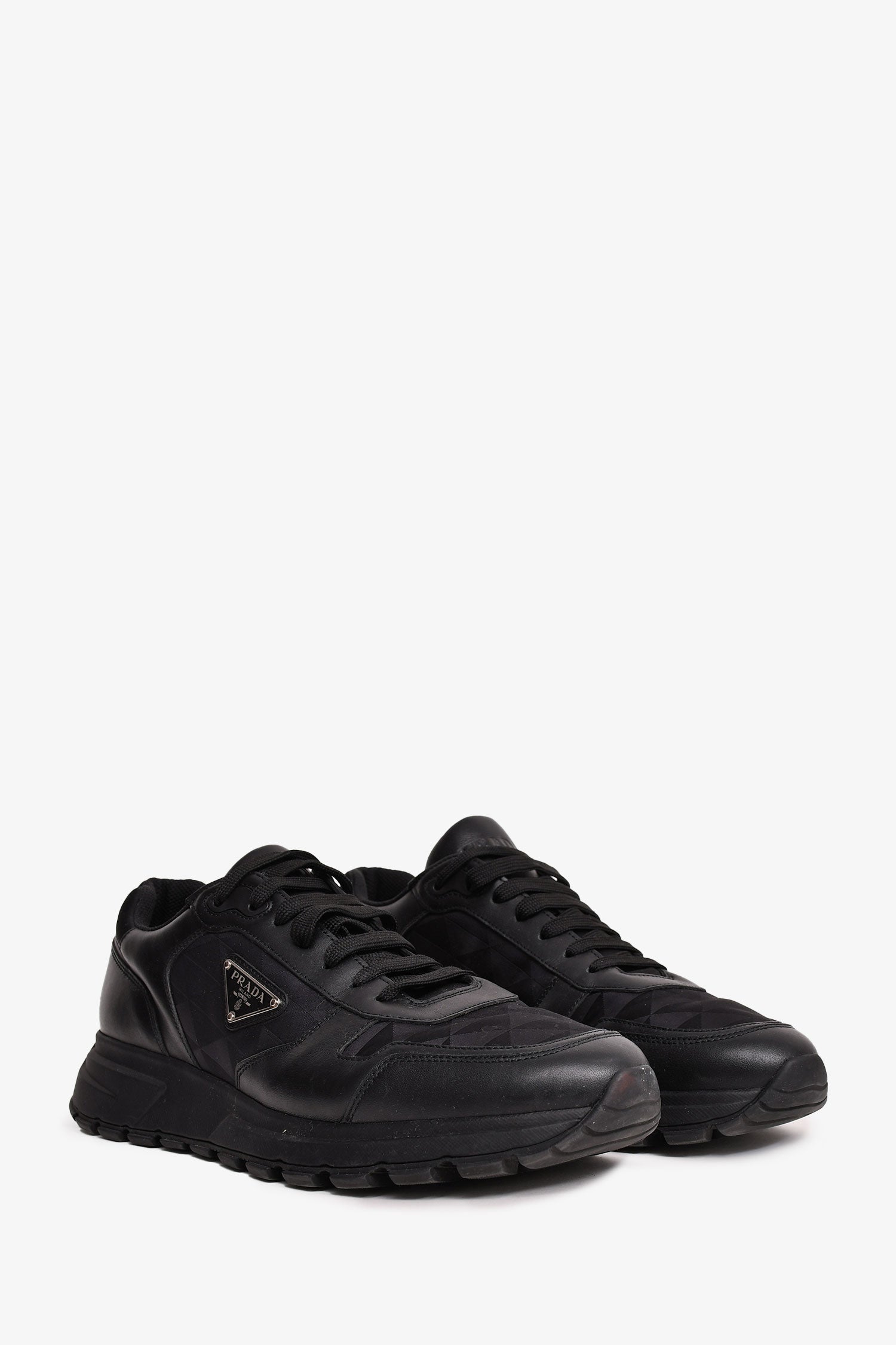 Refresh availabilityPrada Black Leather/Nylon Triangle Logo 'Prax' Sneakers. Round toe. Lace-up closure.