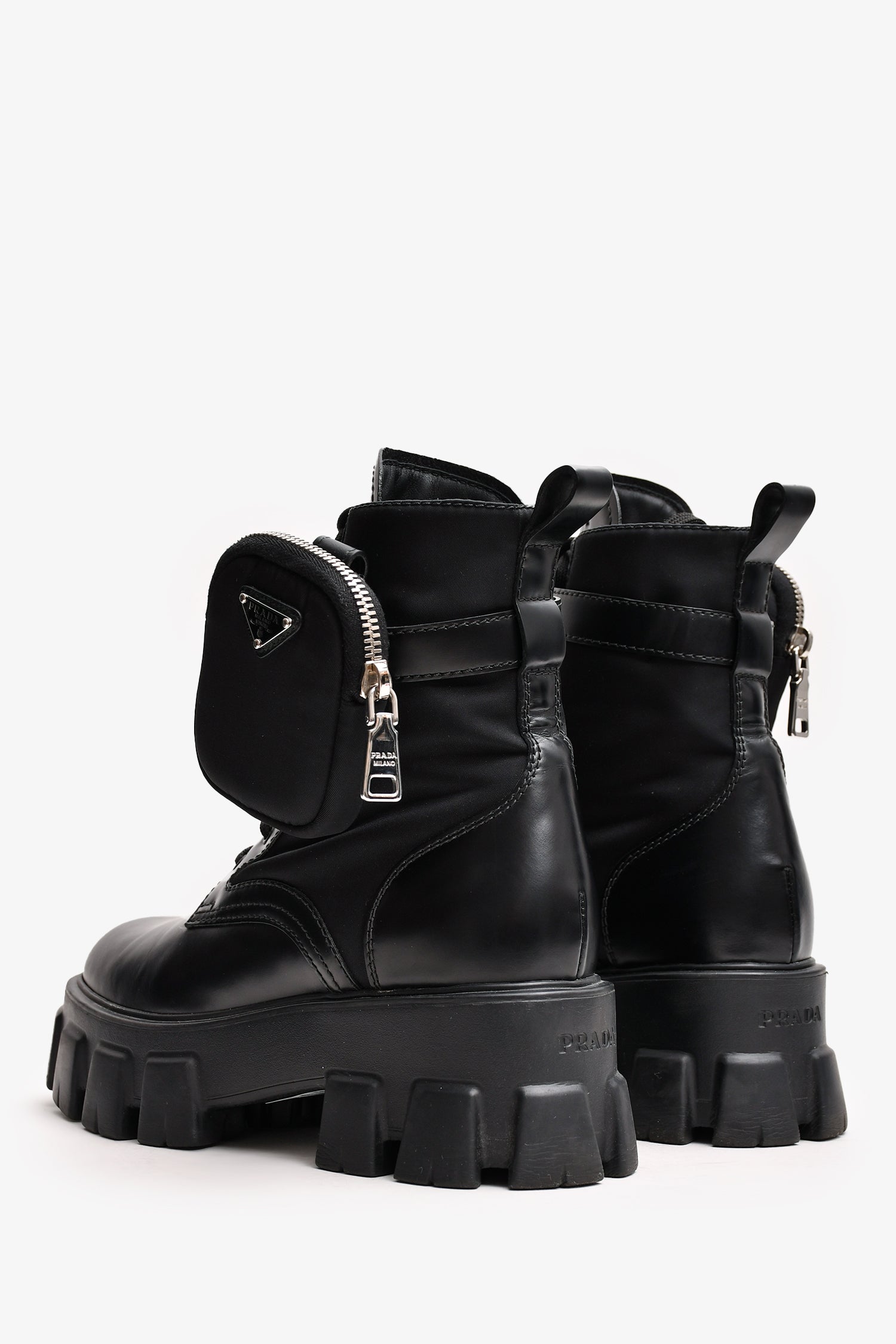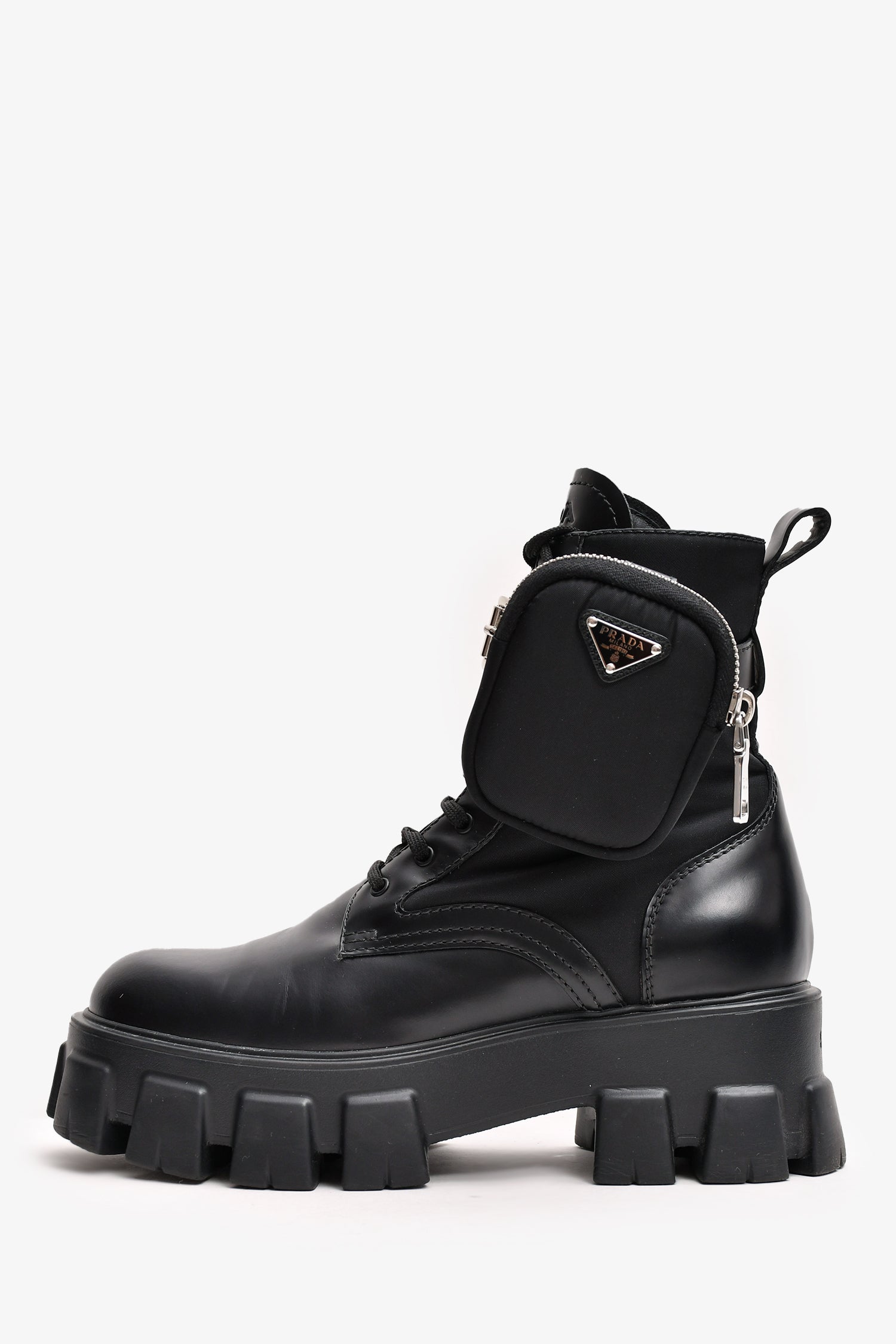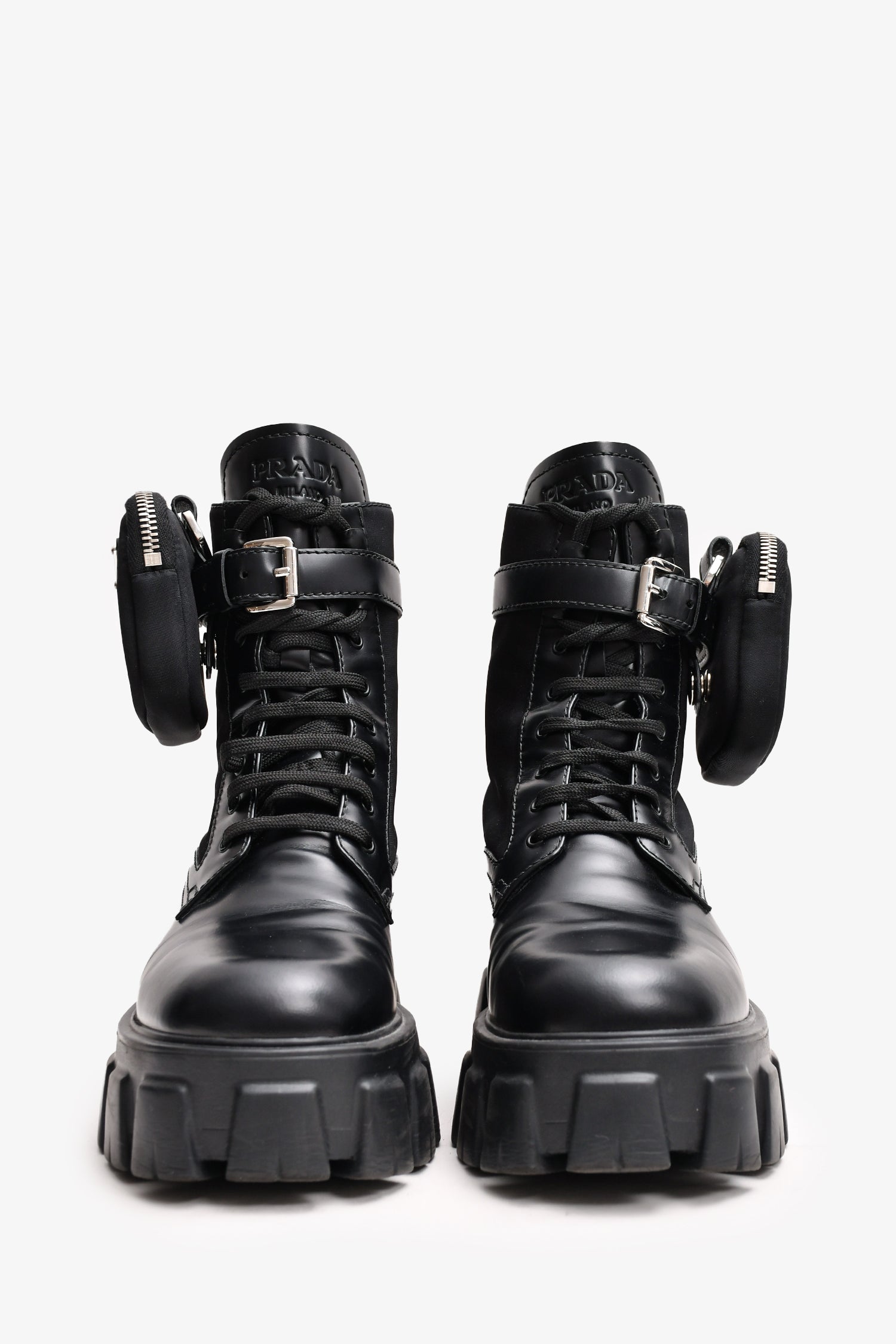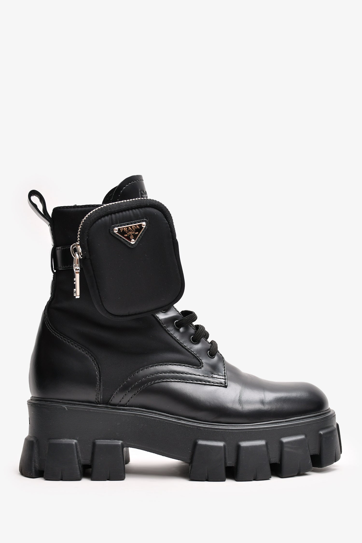 Refresh availabilityPrada Black Leather/Re-Nylon Monolith Platform Boots with Pouch. Tonal stitching. Round toe. Lace-up closure. Silver-tone hardware.