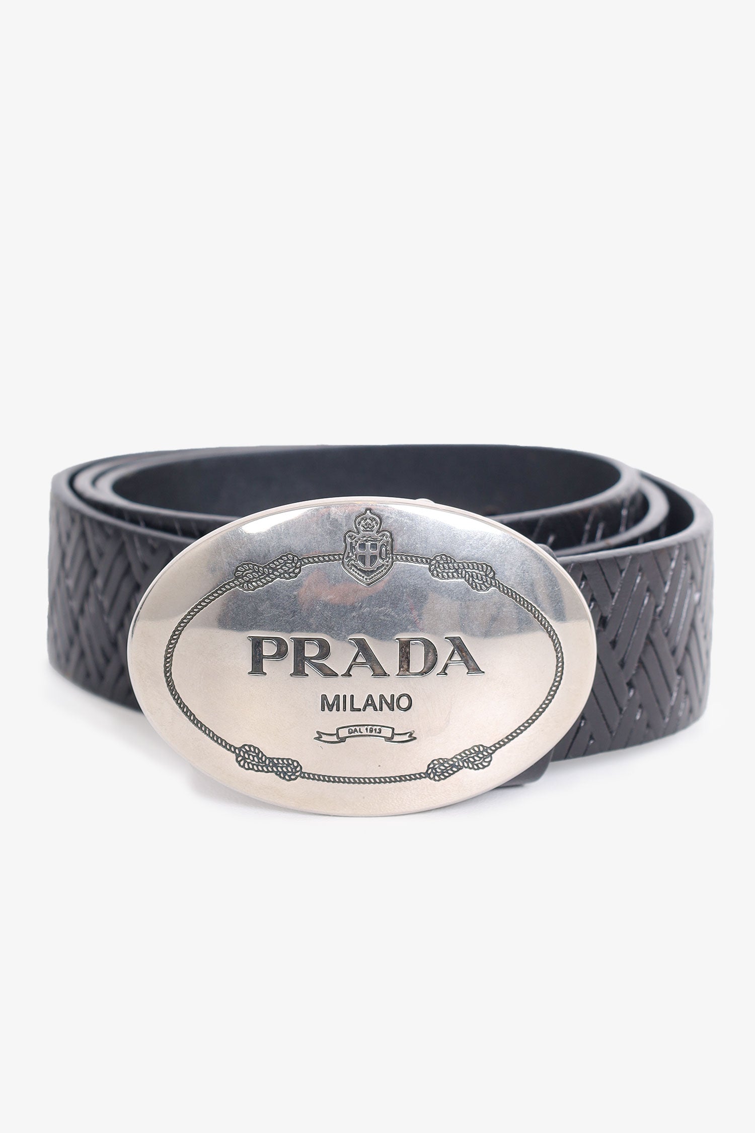 Refresh availabilityPrada Black Leather Round Buckle Belt. Silver-tone hardware. Tonal stitching.