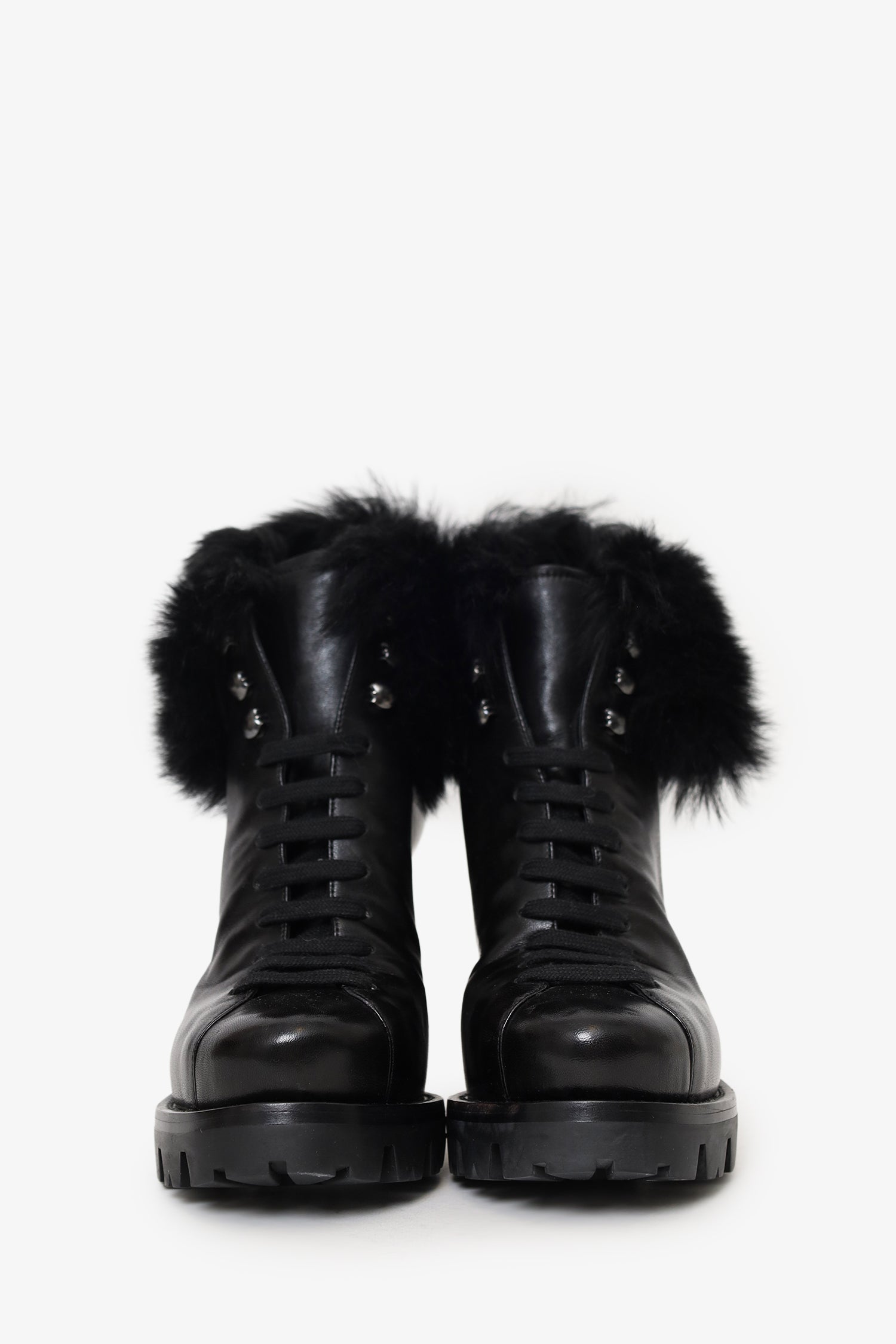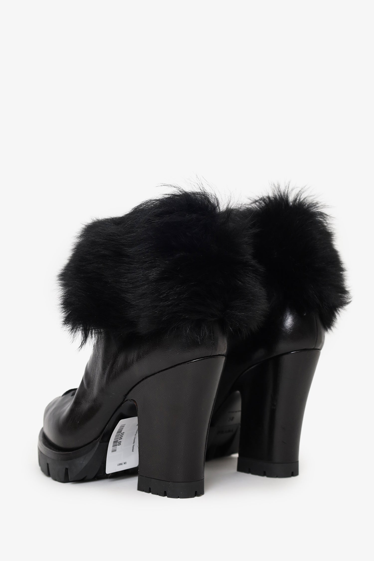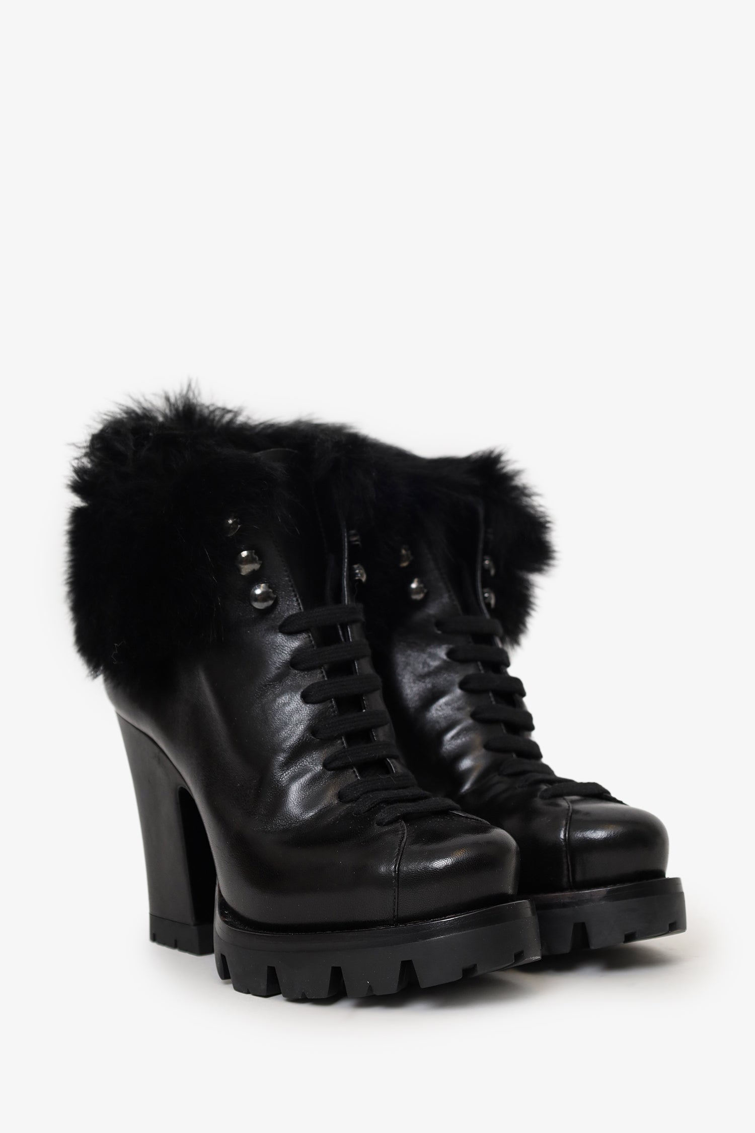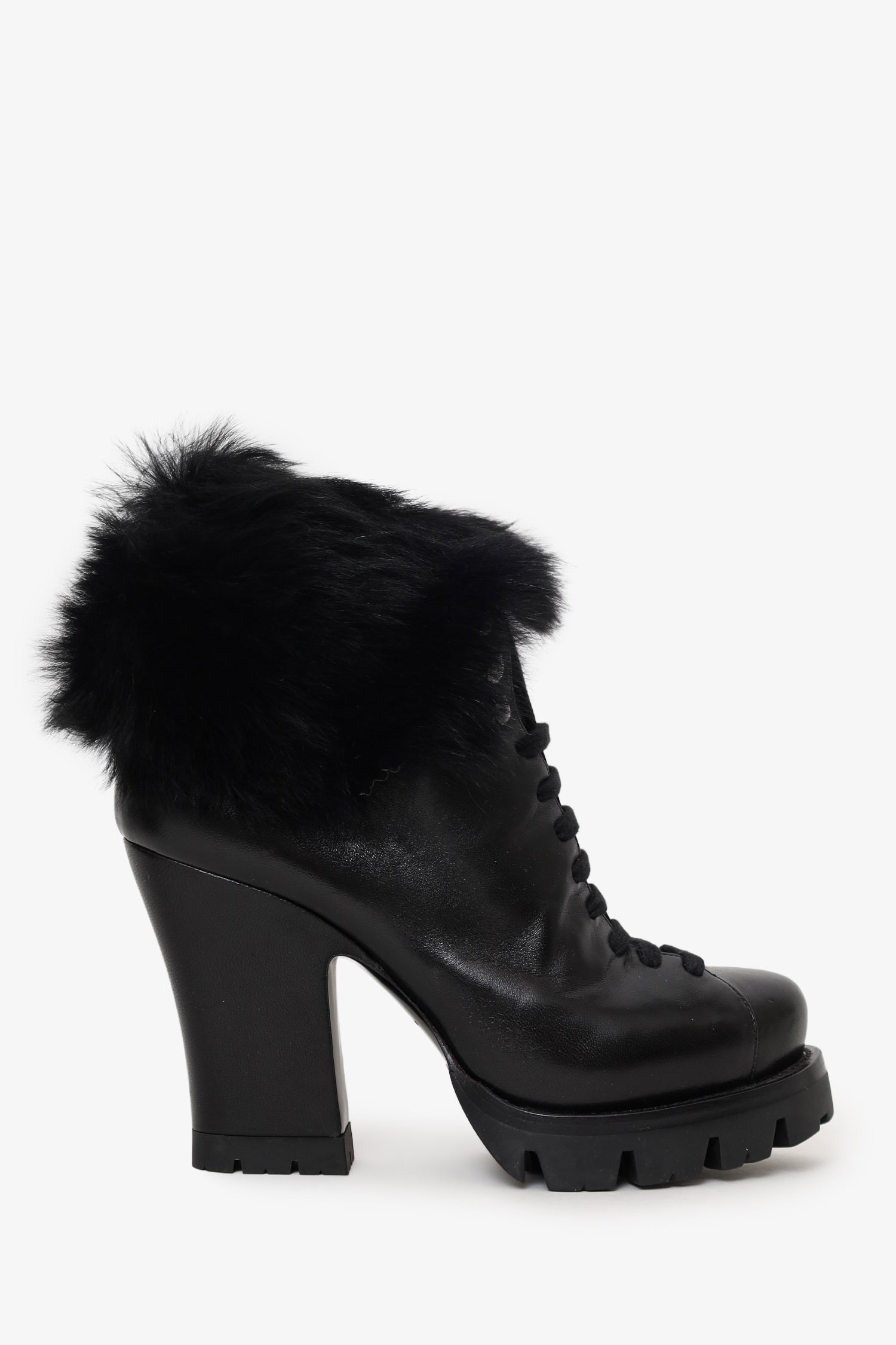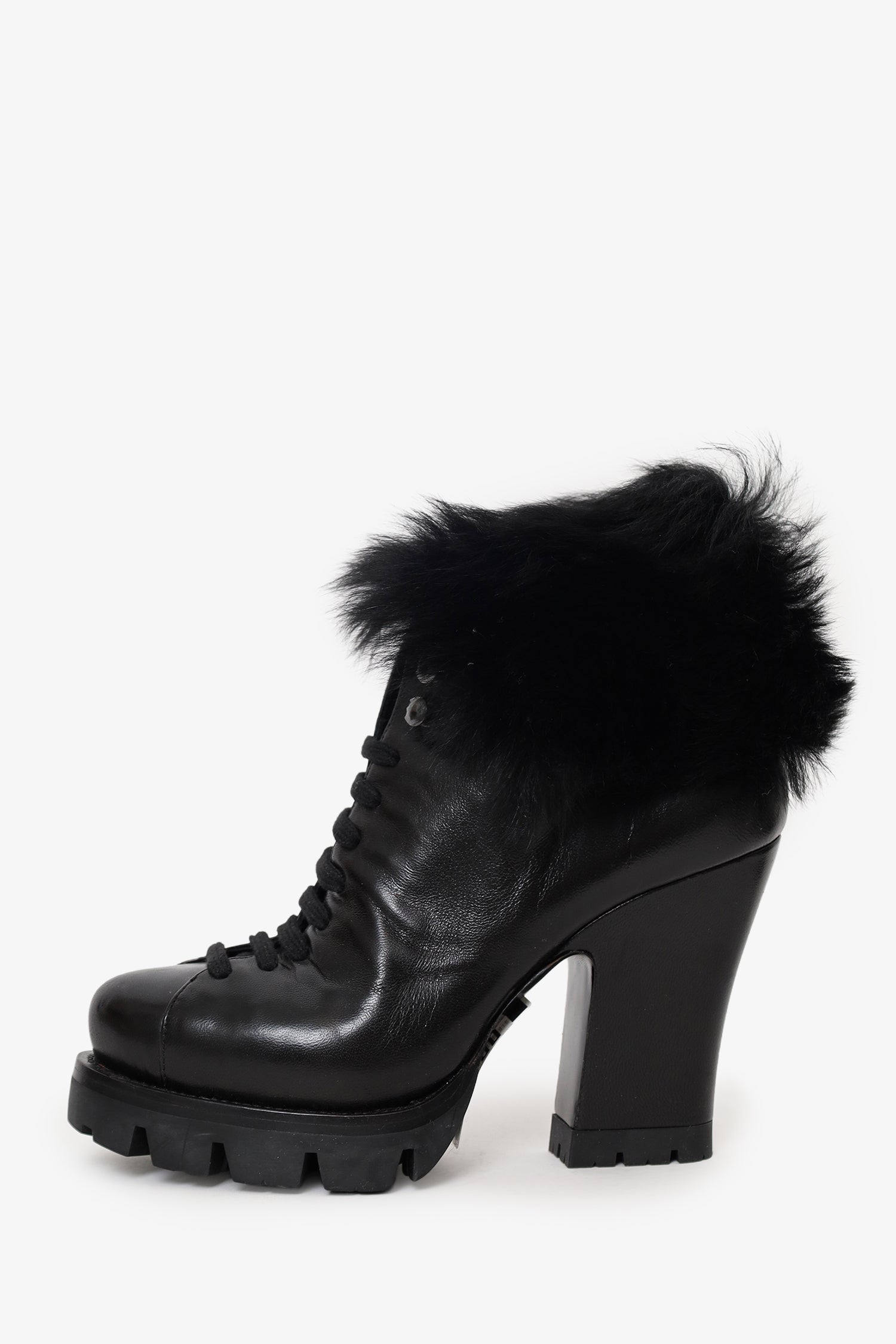 Refresh availabilityPrada Black Leather/Fur Chunky Heeled Boots. Pull-on. Front lace-up closure. Block heel. Leather-lined interior. Tonal stitching.