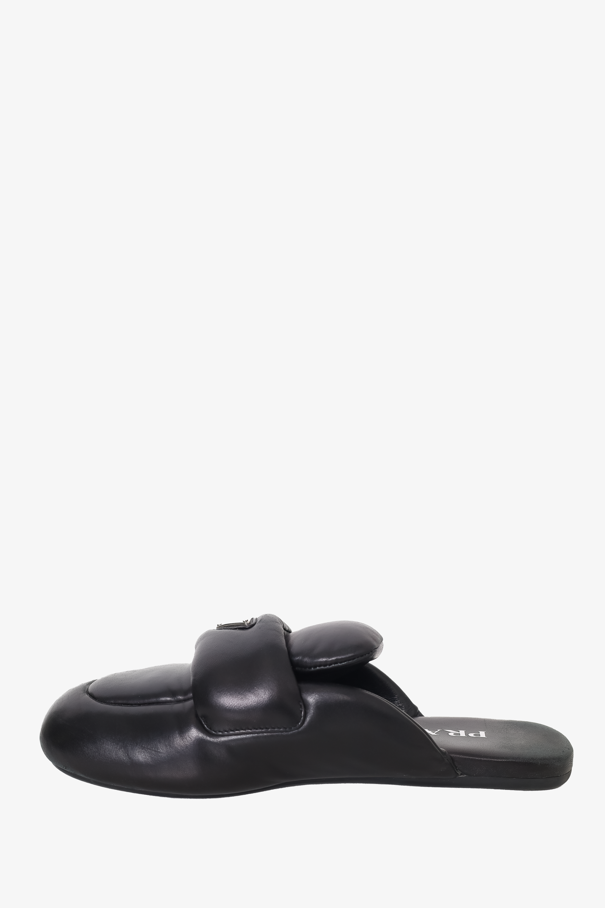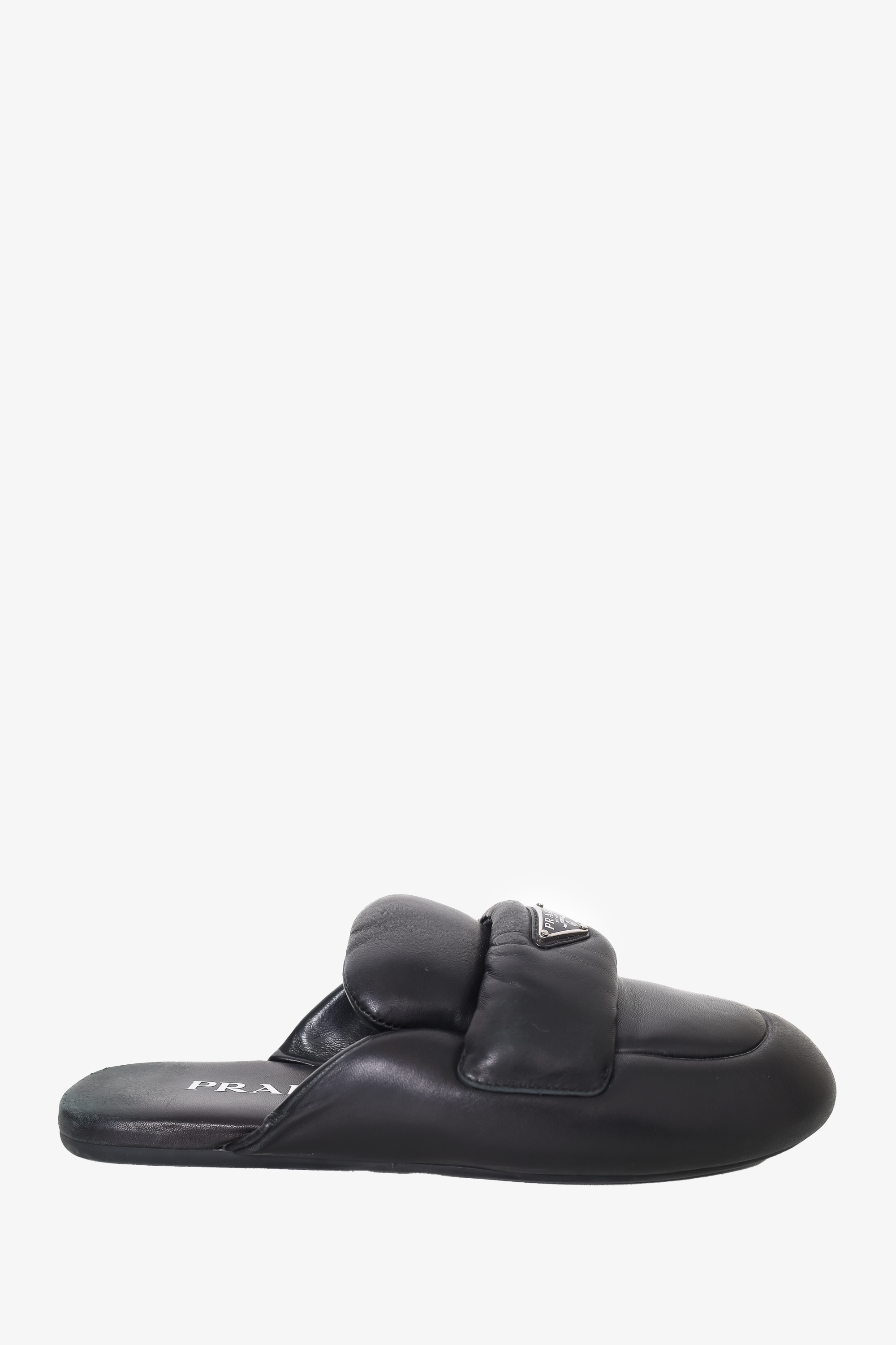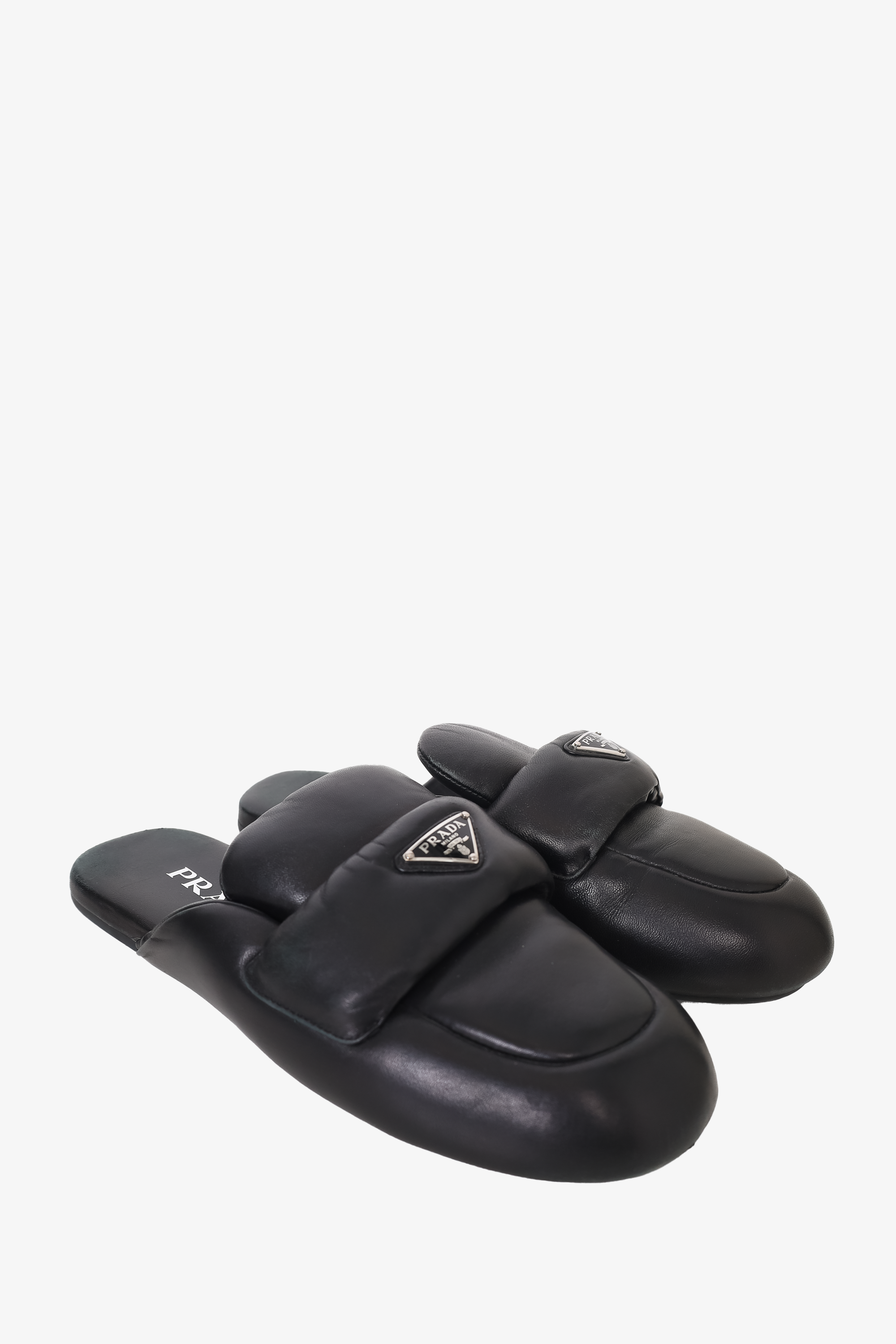 Refresh availabilityPrada Black Napa Leather Padded Sabots Mules. Round toe. Prada metal triangle logo on top.