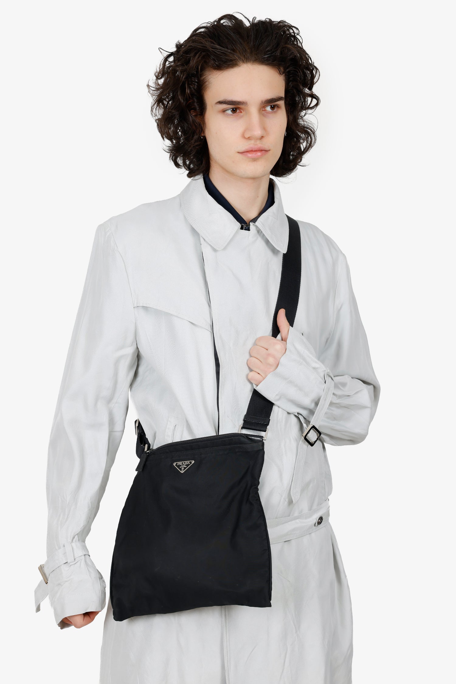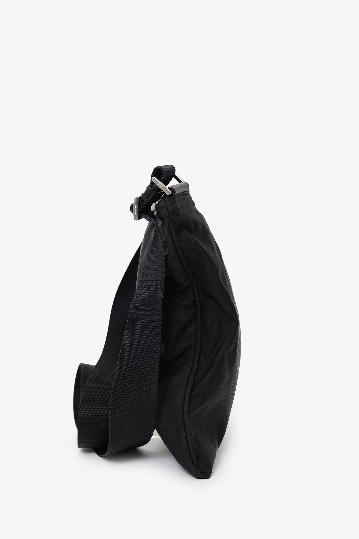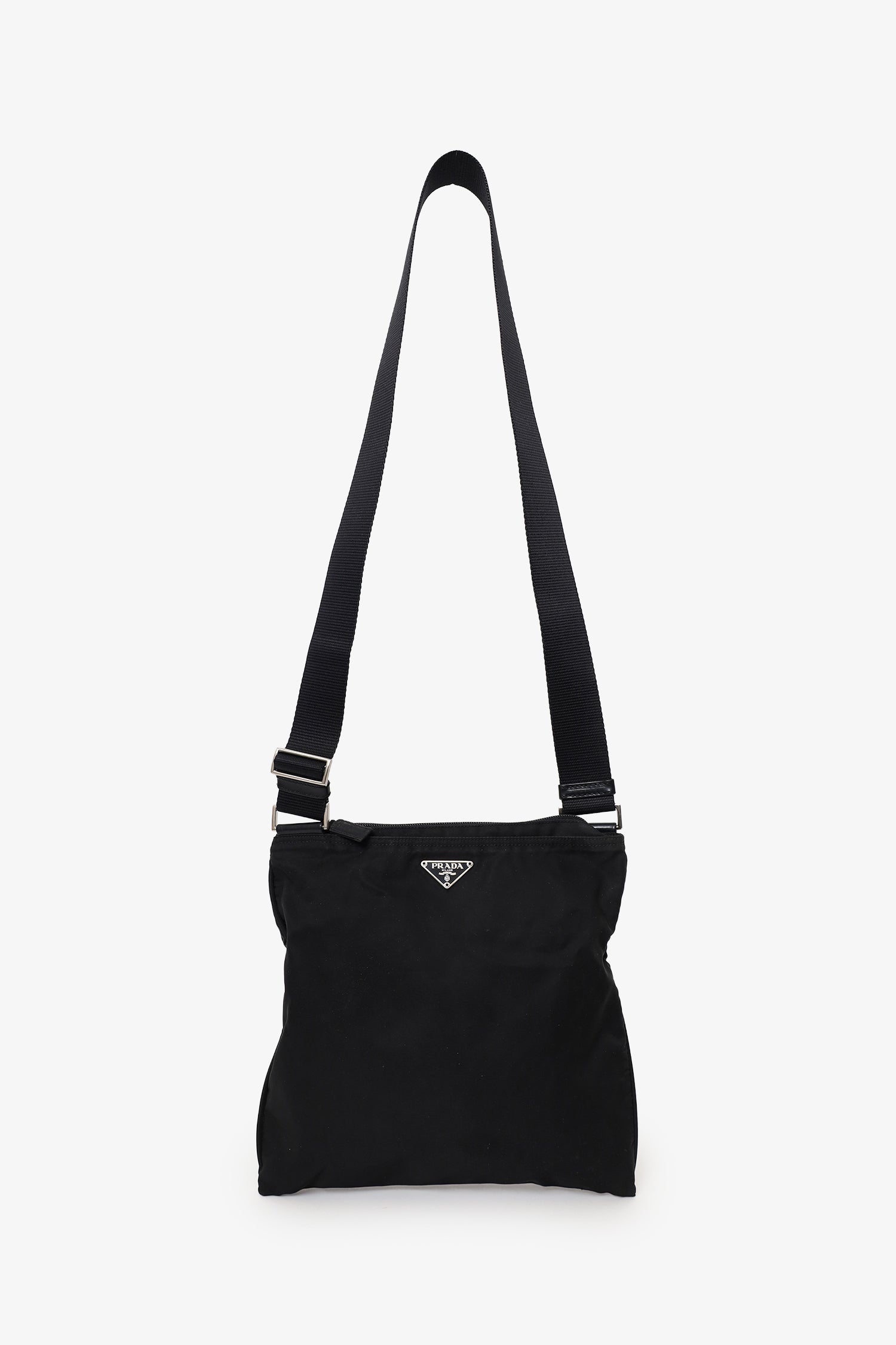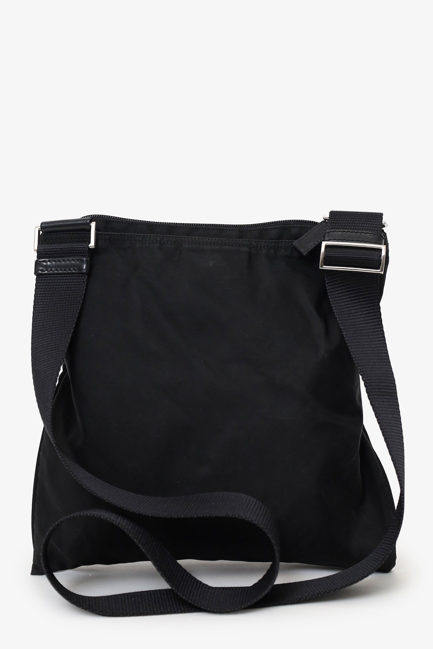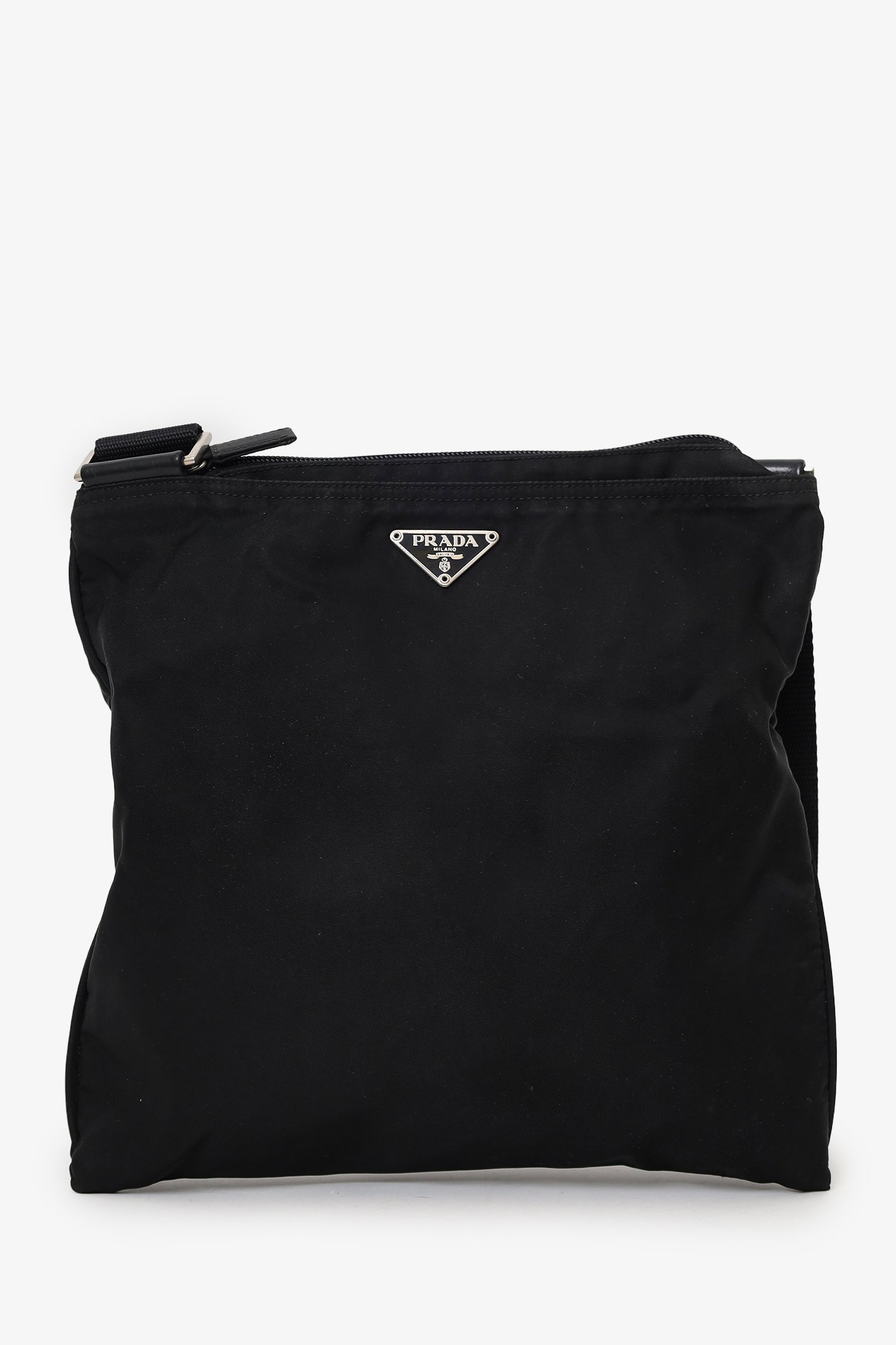 Refresh availabilityPrada Black Nylon Messenger Bag. Top zip-up closure. Adjustable crossbody strap. Lined interior. Silver-tone hardware. Tonal stitching.