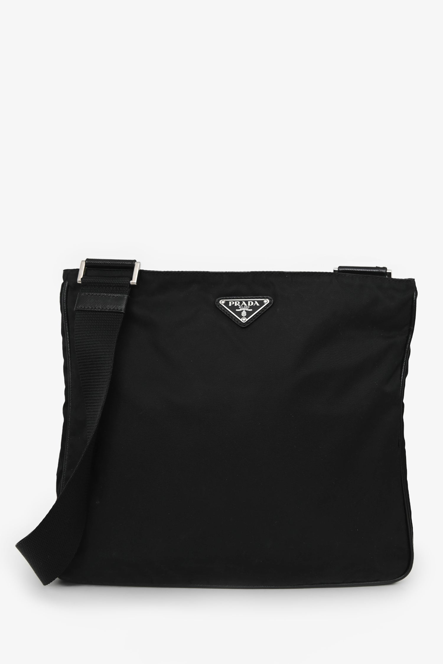 Refresh availabilityPrada Black Nylon Messenger Bag. Concealed zipper. Webbed crossbody strap. Lined interior with a zip pocket. Silver-tone hardware. Tonal stitching.