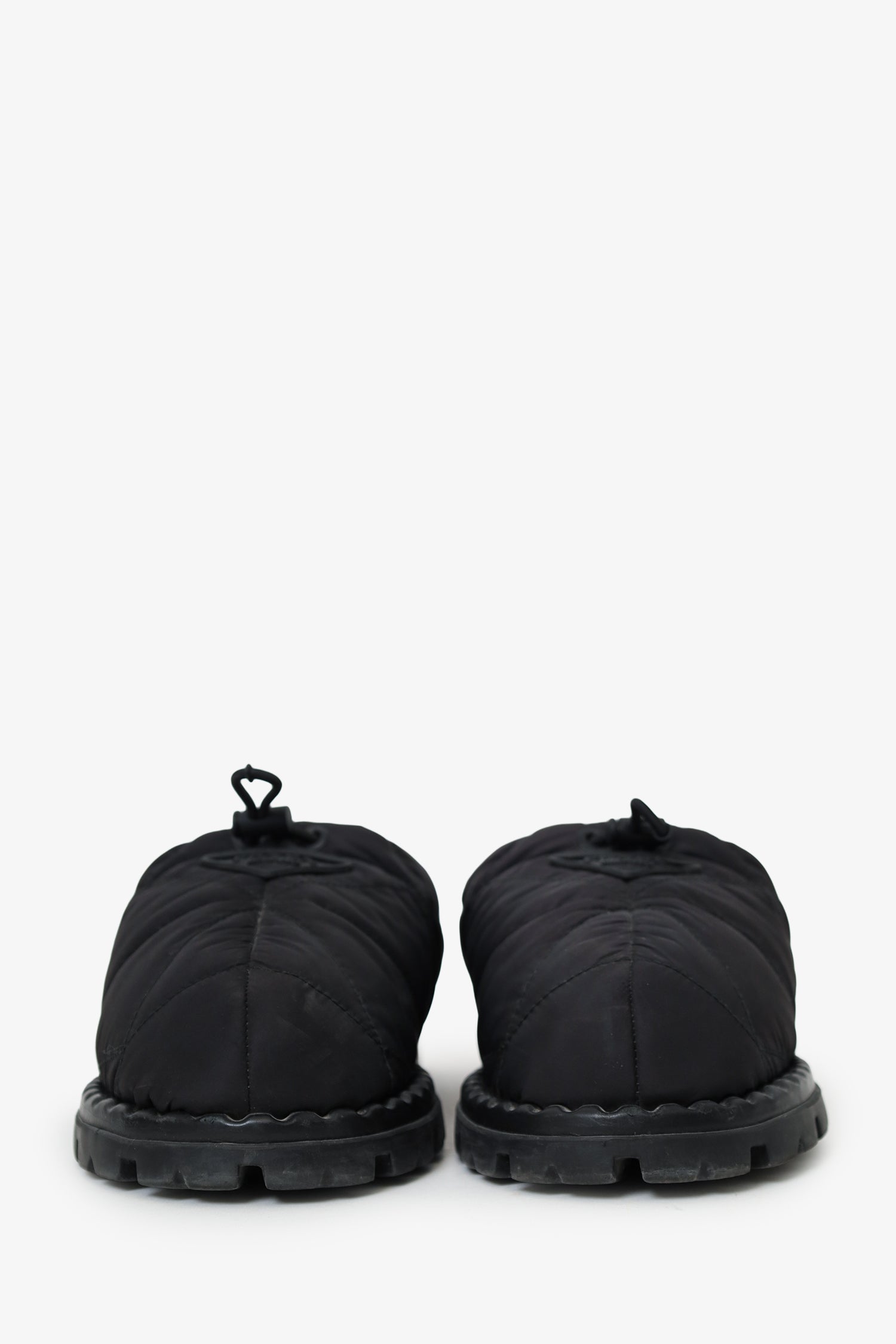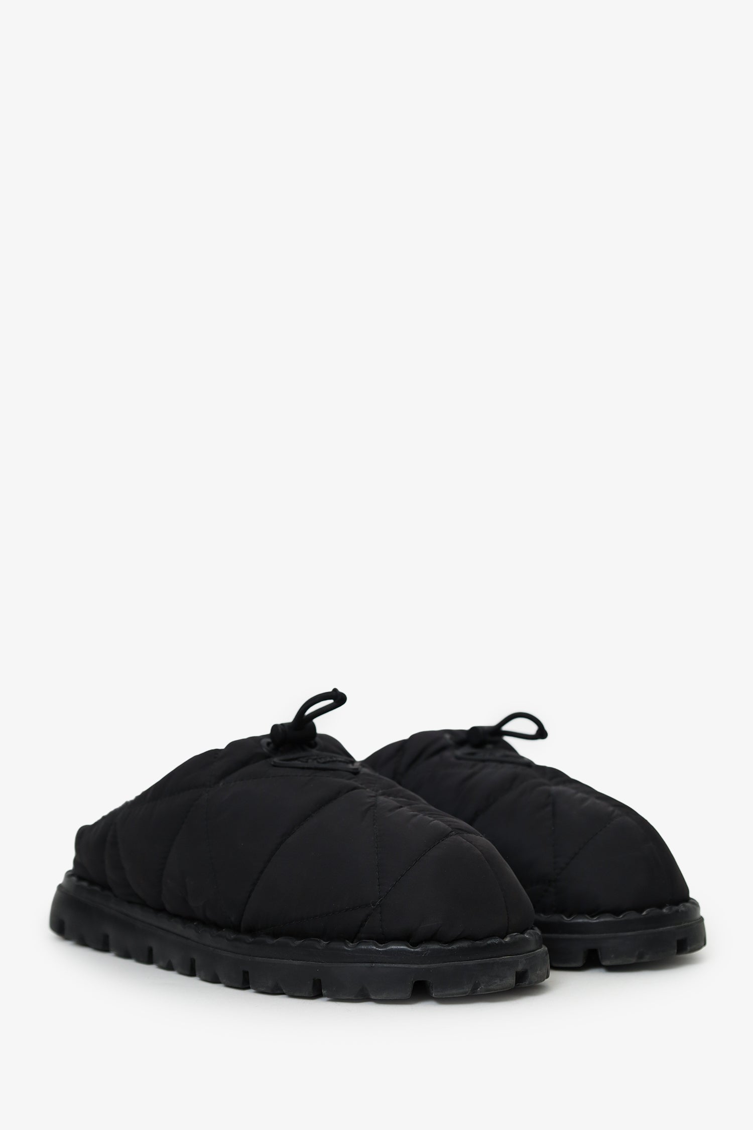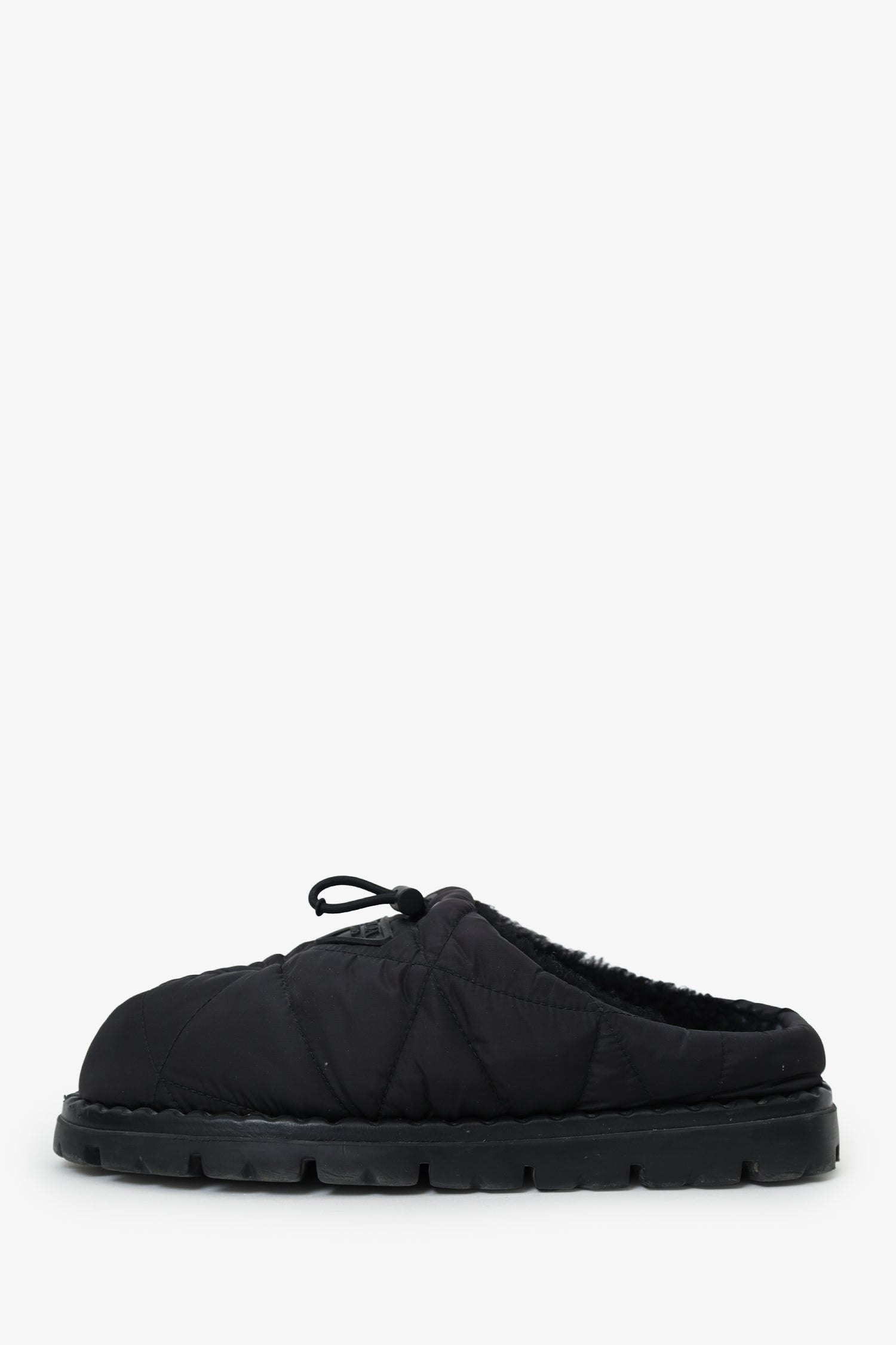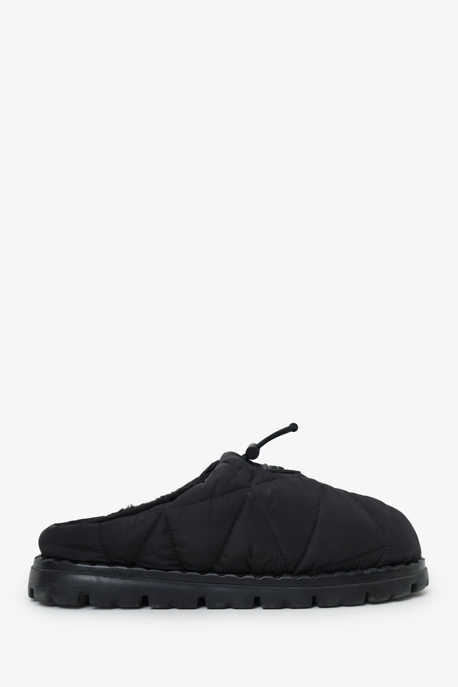 Refresh availabilityPrada Black Nylon Quilted Slipper Mule. Slip-on. Round toe. Front cinch-cord closure. Lined interior. Tonal stitching.