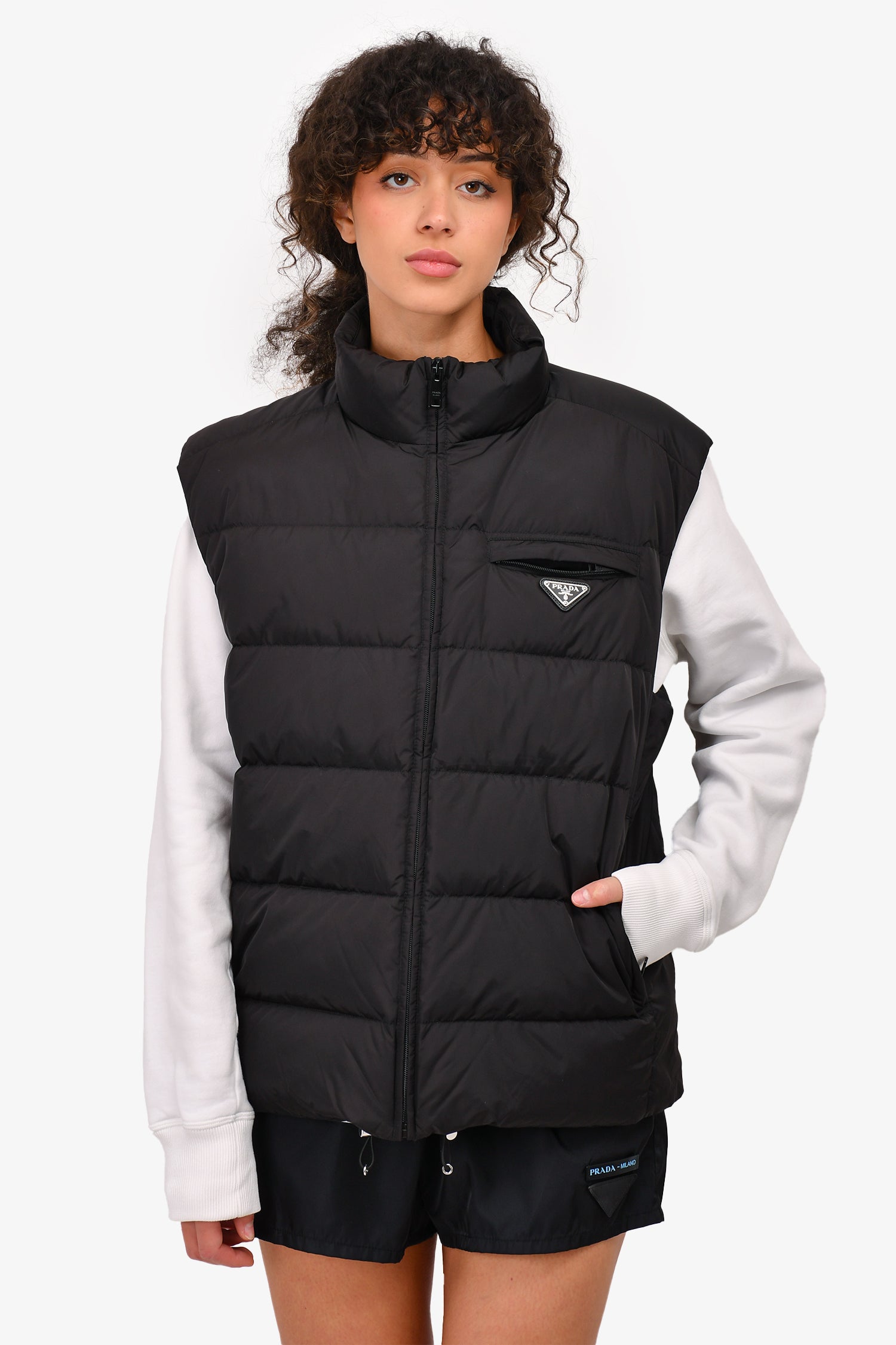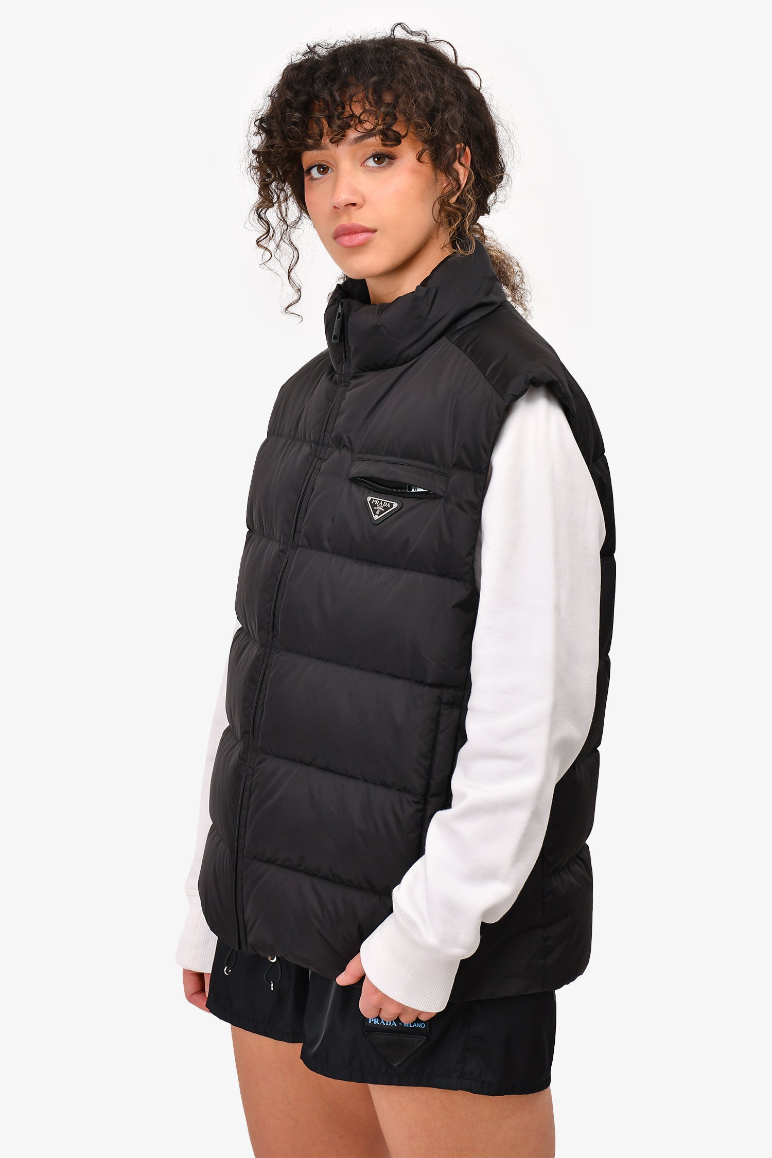 Refresh availabilityPrada 2022 Black Padded Re-Nylon Logo Vest Mens. Front zip-up closure. Adjustable at the waist. One front breast pocket. Two side pockets with zipper closure. Tonal stitching.
