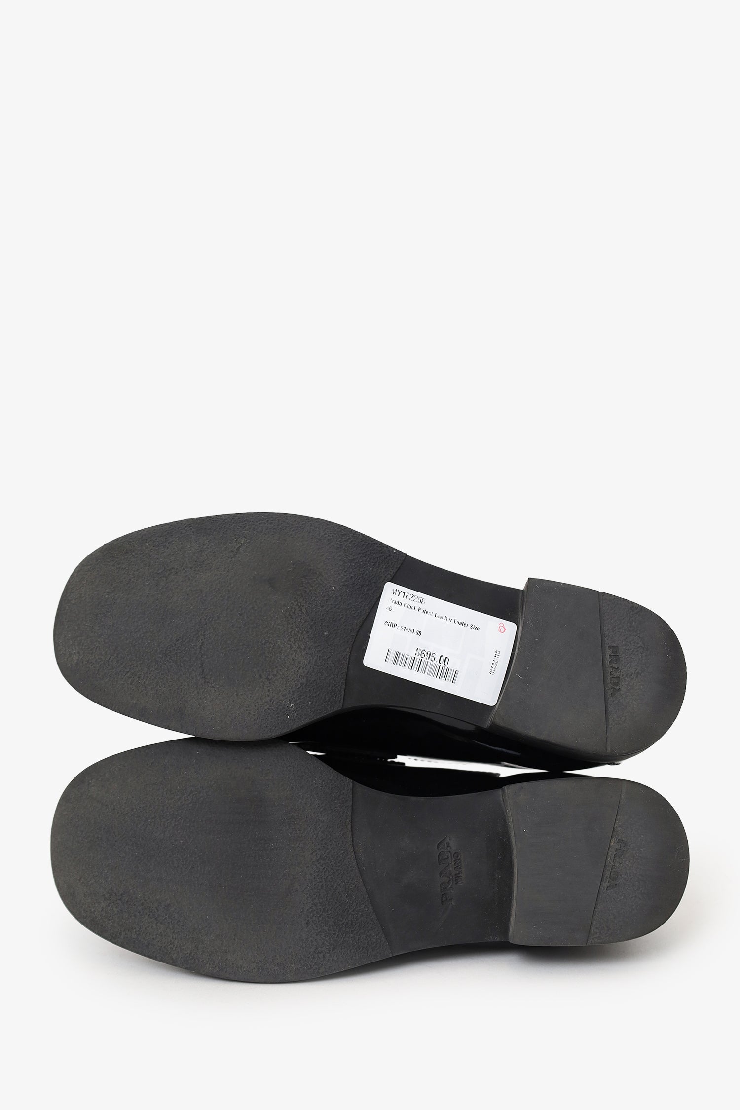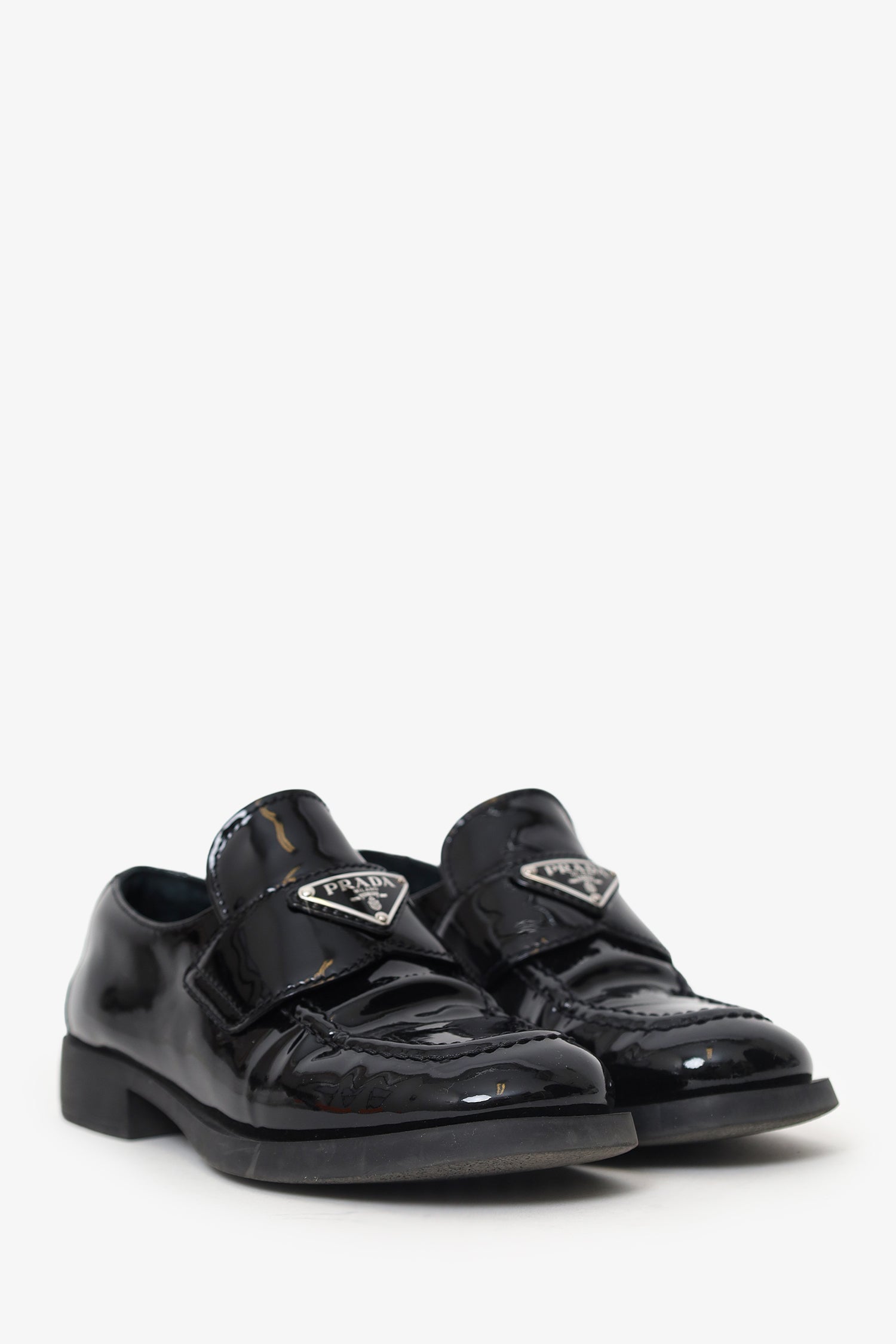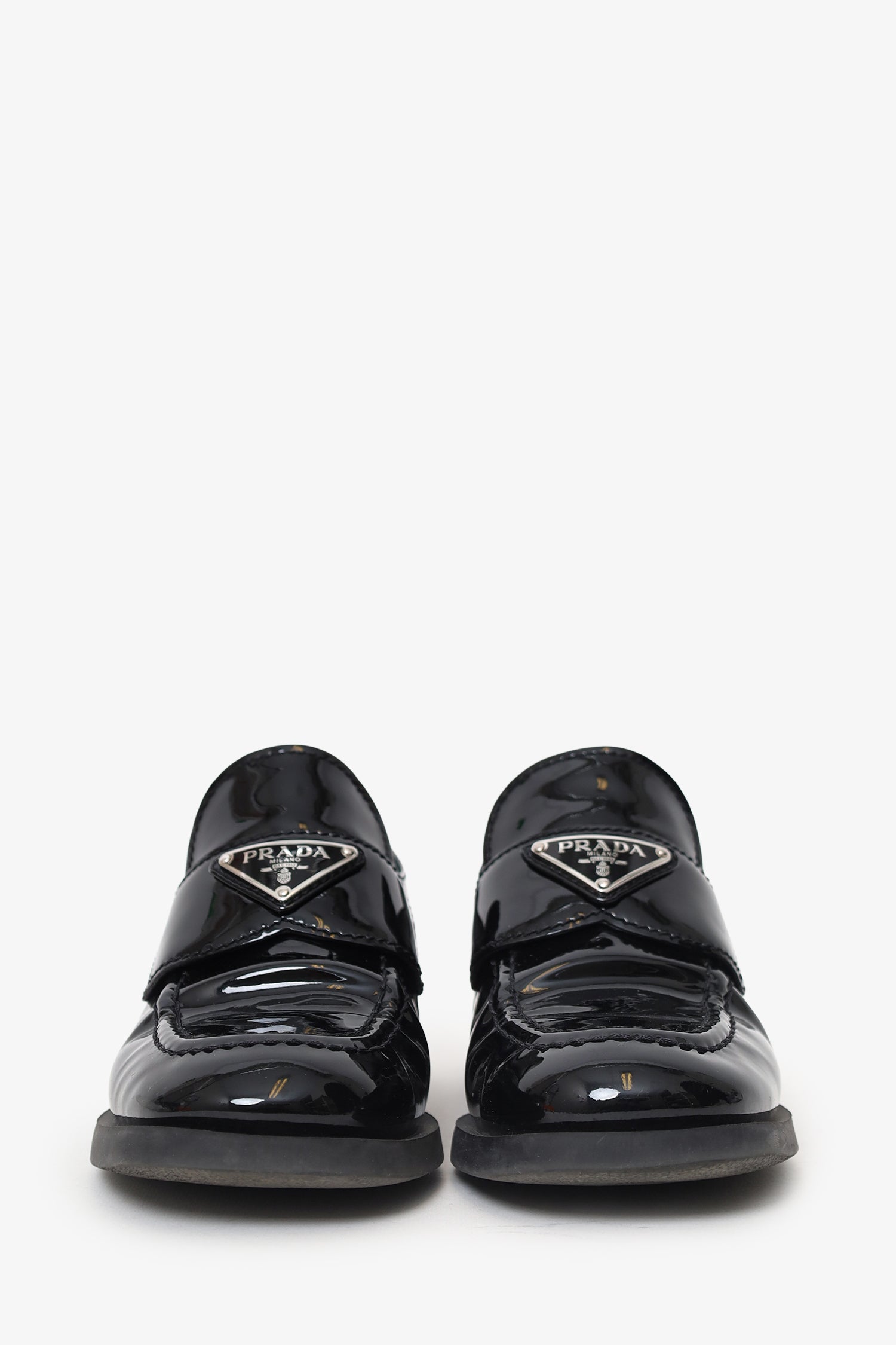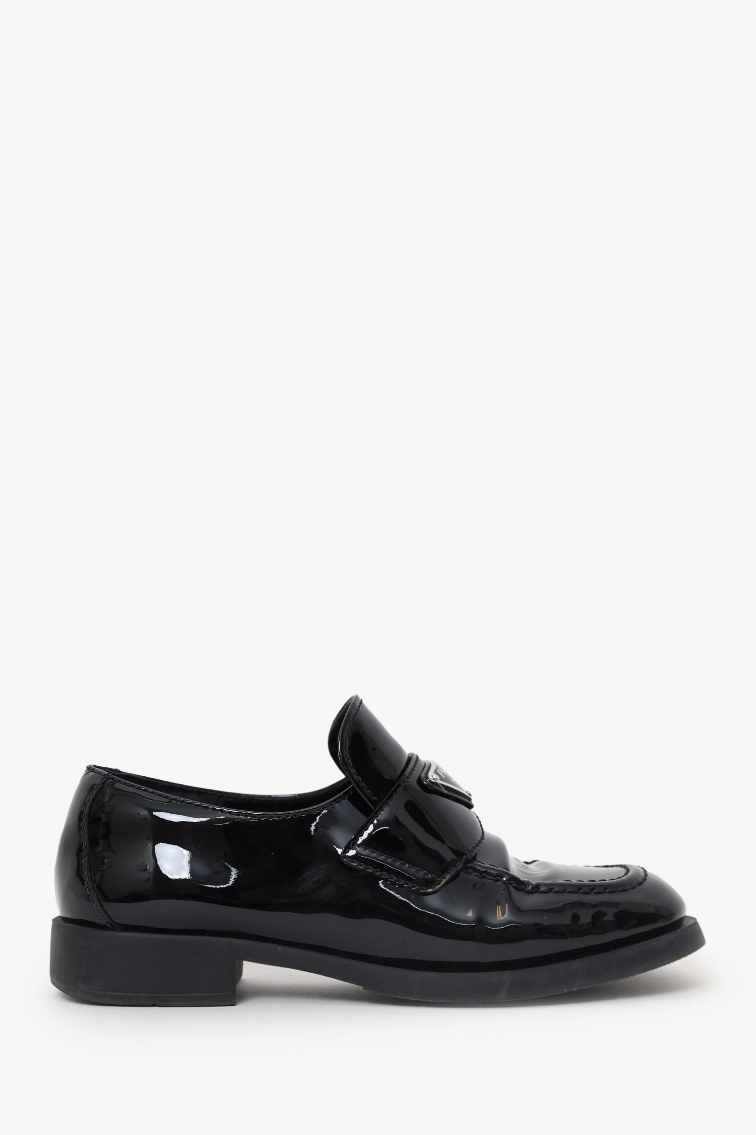 Refresh availabilityPrada Black Patent Leather Loafer. Slip-on. Rounded-square toe. Block heel. Lined interior. Silver-tone hardware. Tonal stitching.