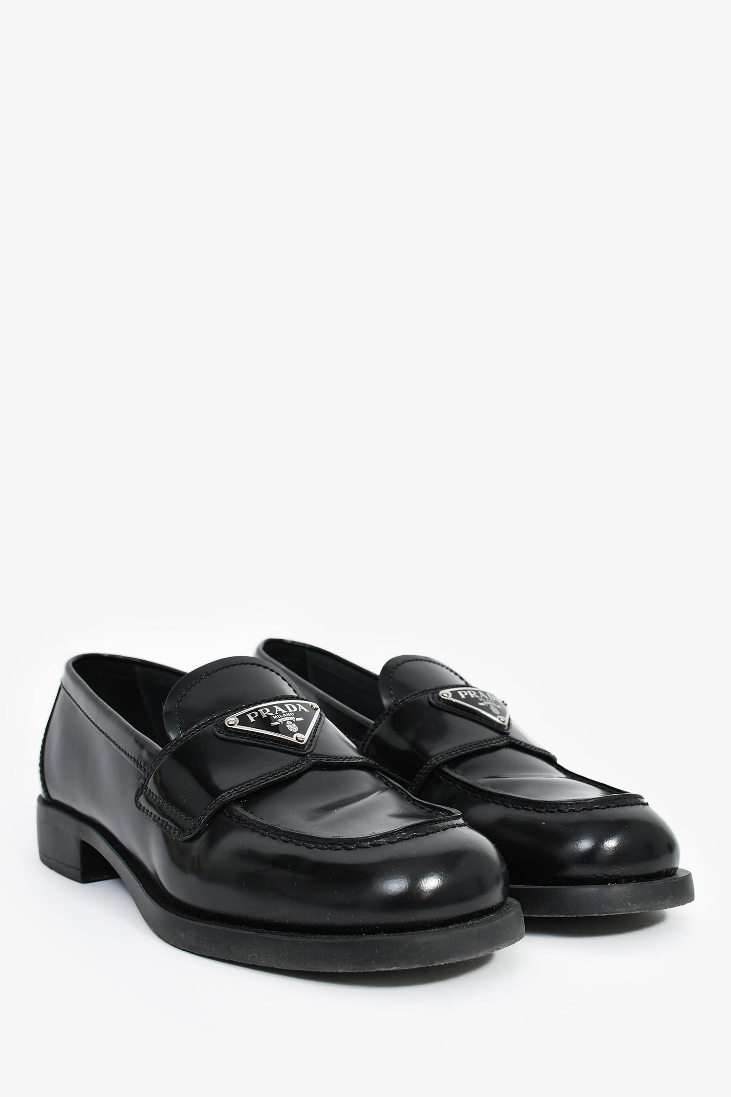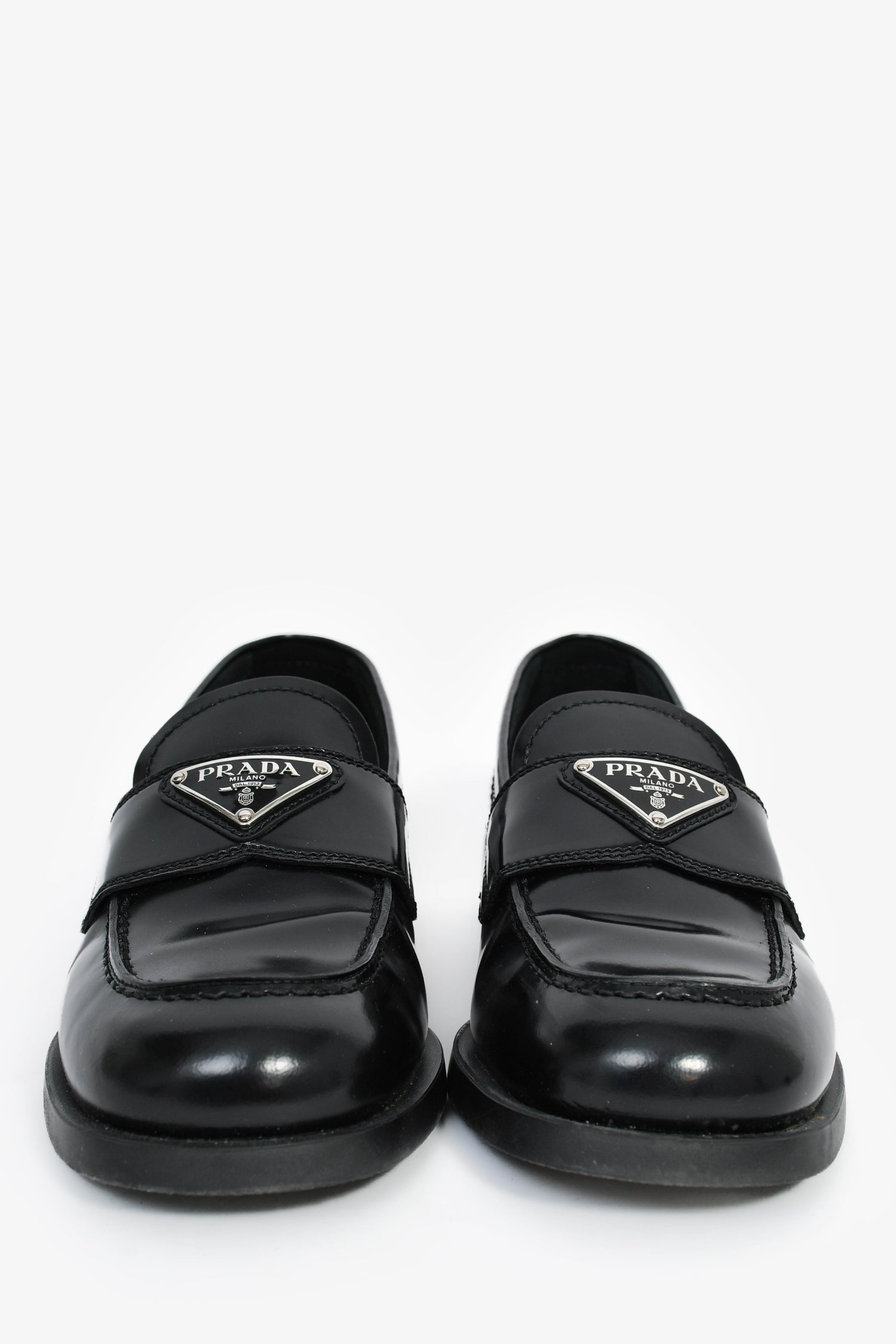 Refresh availabilityPrada Black Patent Logo 'Donna' Loafer. Square toe. Slip-on. Silver-tone hardware.