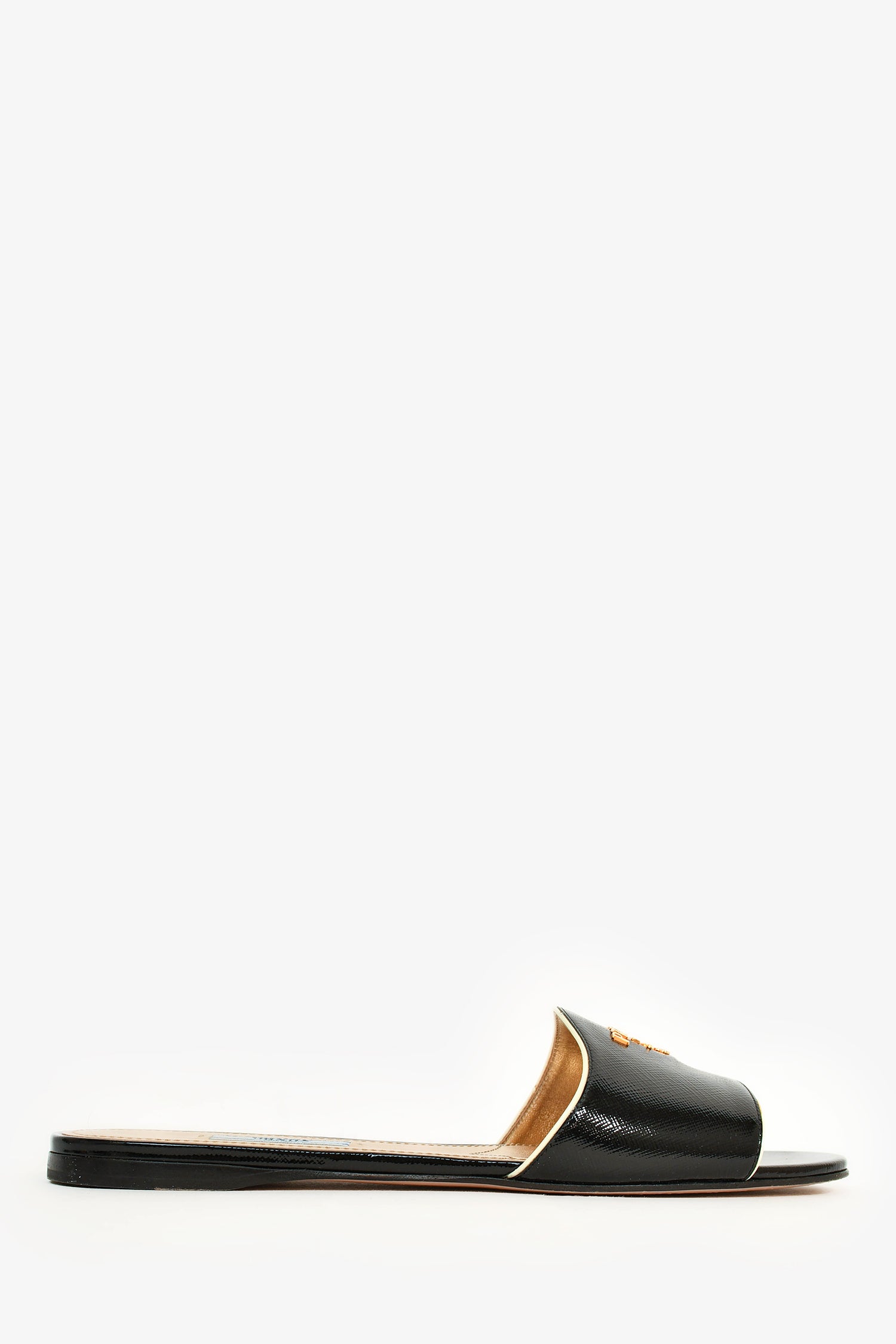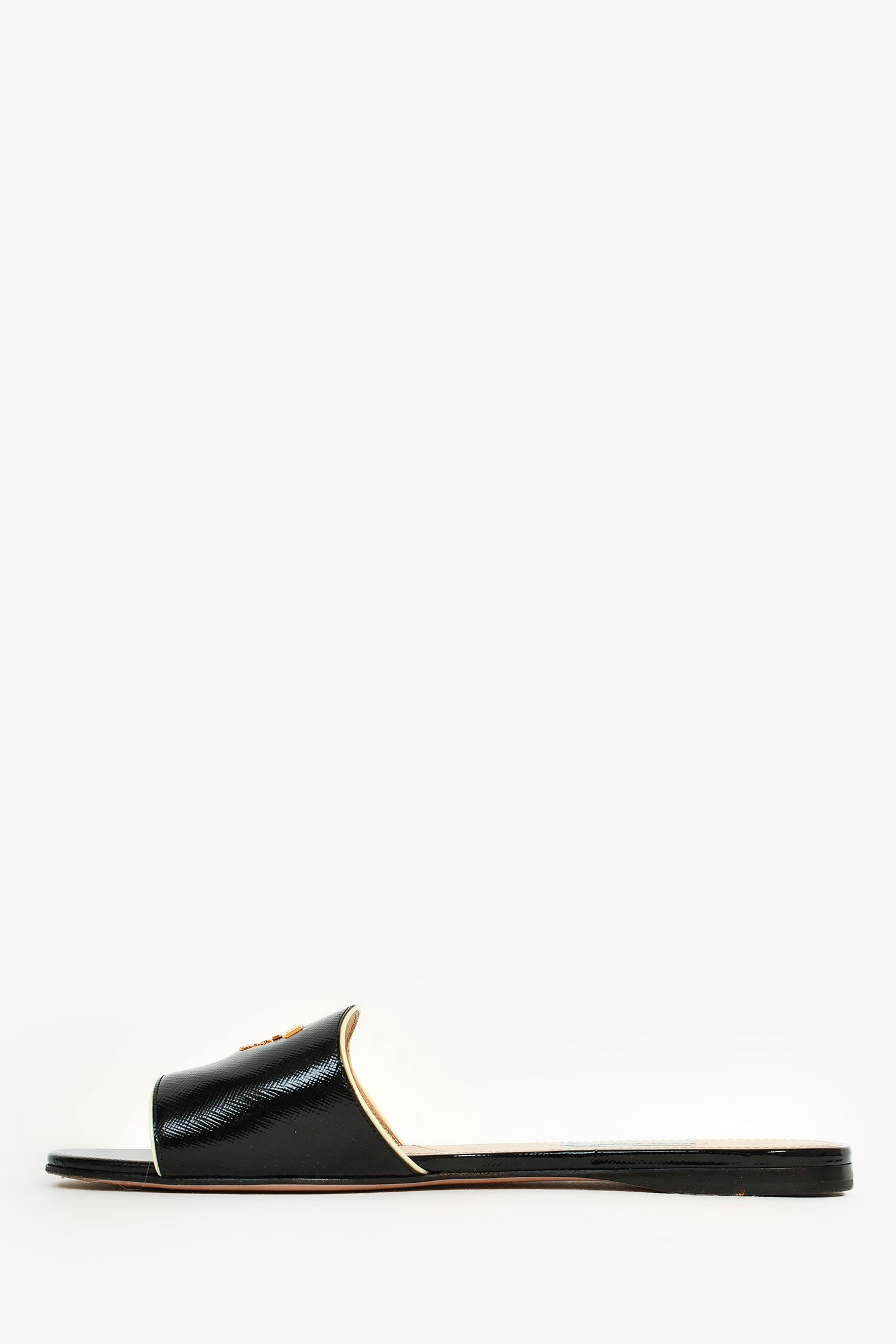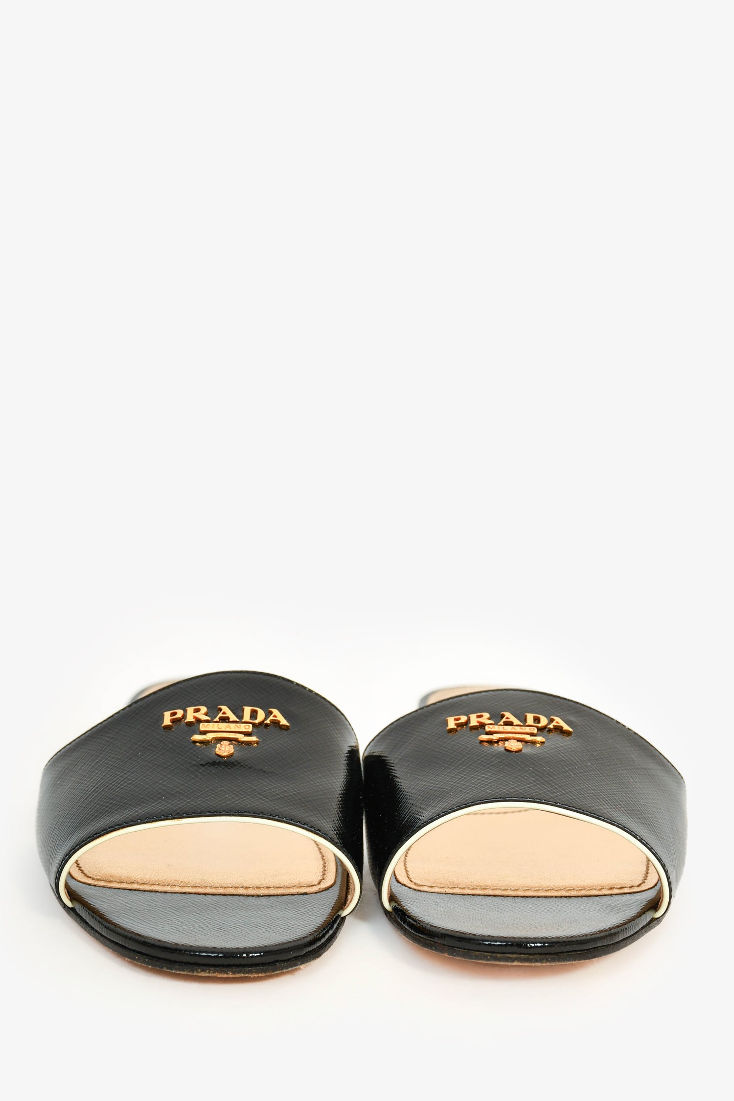 Refresh availabilityPrada Black Patent Logo Sandals. Round toe. Patent trim. Gold-tone hardware and insoles. White-tone trim. Tonal stitching.