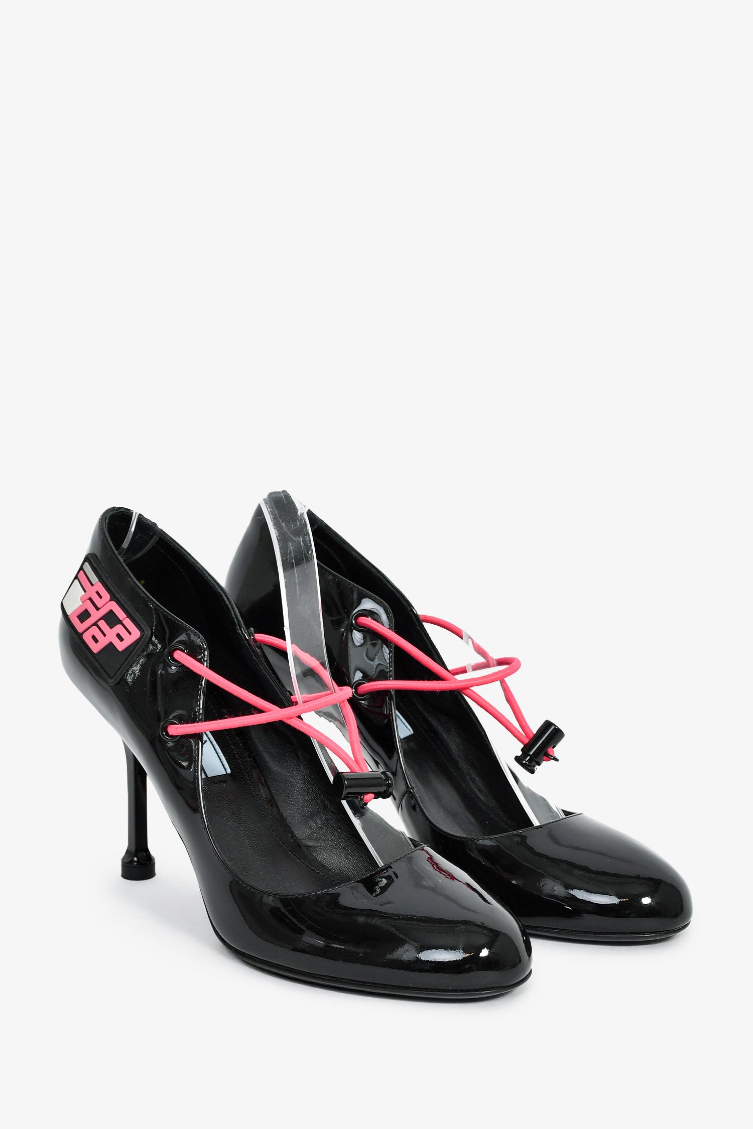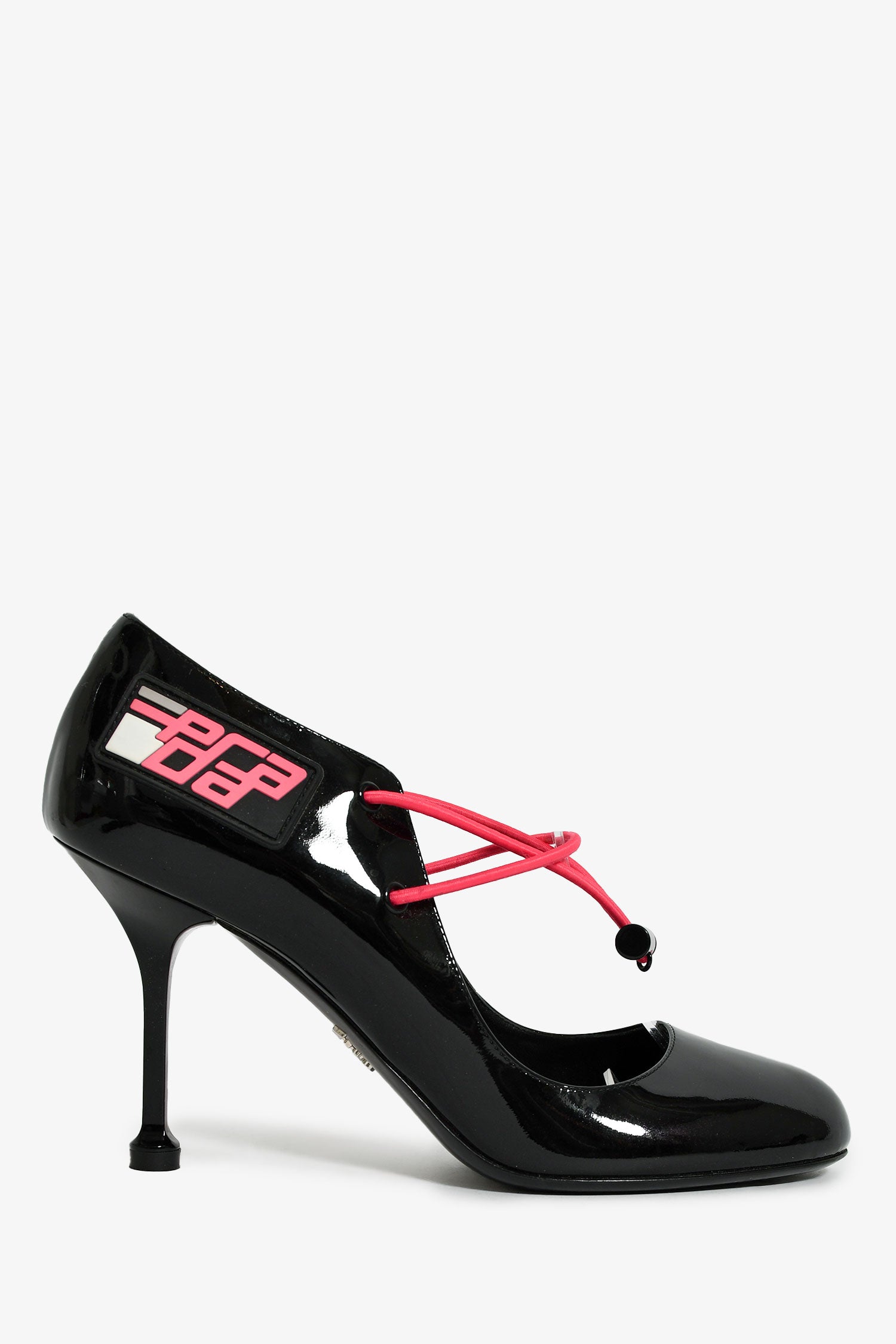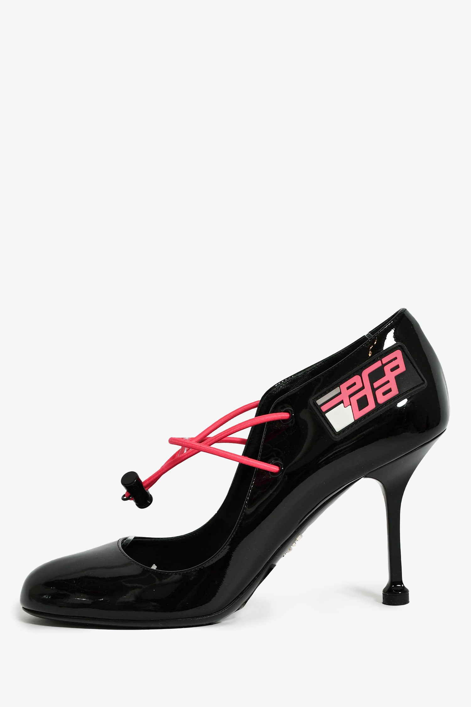Refresh availabilityPrada Black Patent Pink Cord Mary Jane Heels. Slip-on. Round toe. Front elasticized drawstring closure. Tonal stitching.
