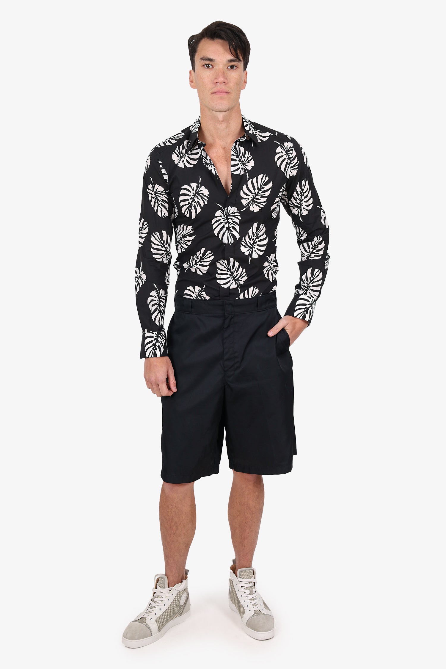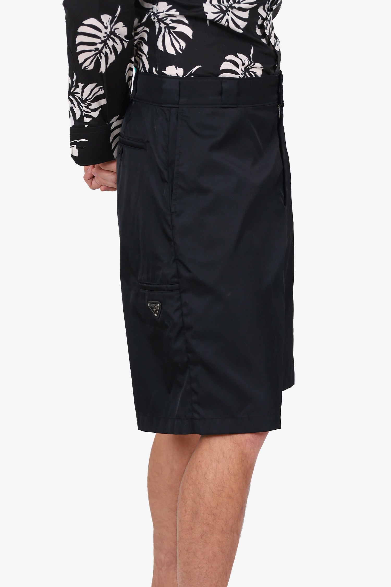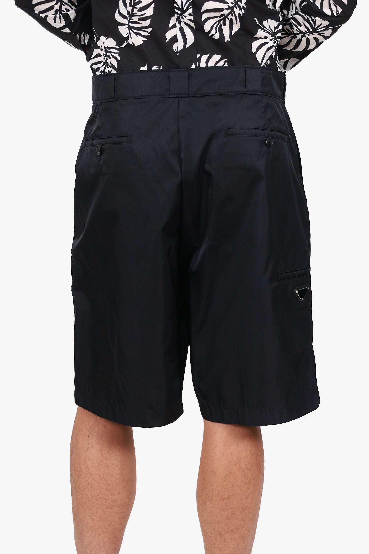 Refresh availabilityPrada Black Re-nylon Triangle Logo Shorts. Pul-on. Front zip with hook closure. Waistband belt loops. 2 front exterior side slip pockets; 2 rear exterior pockets with button closure. Silver-tone hardware. Tonal stitching.