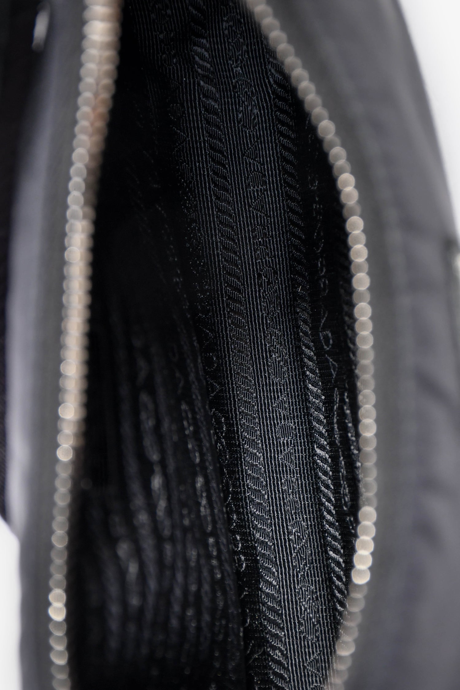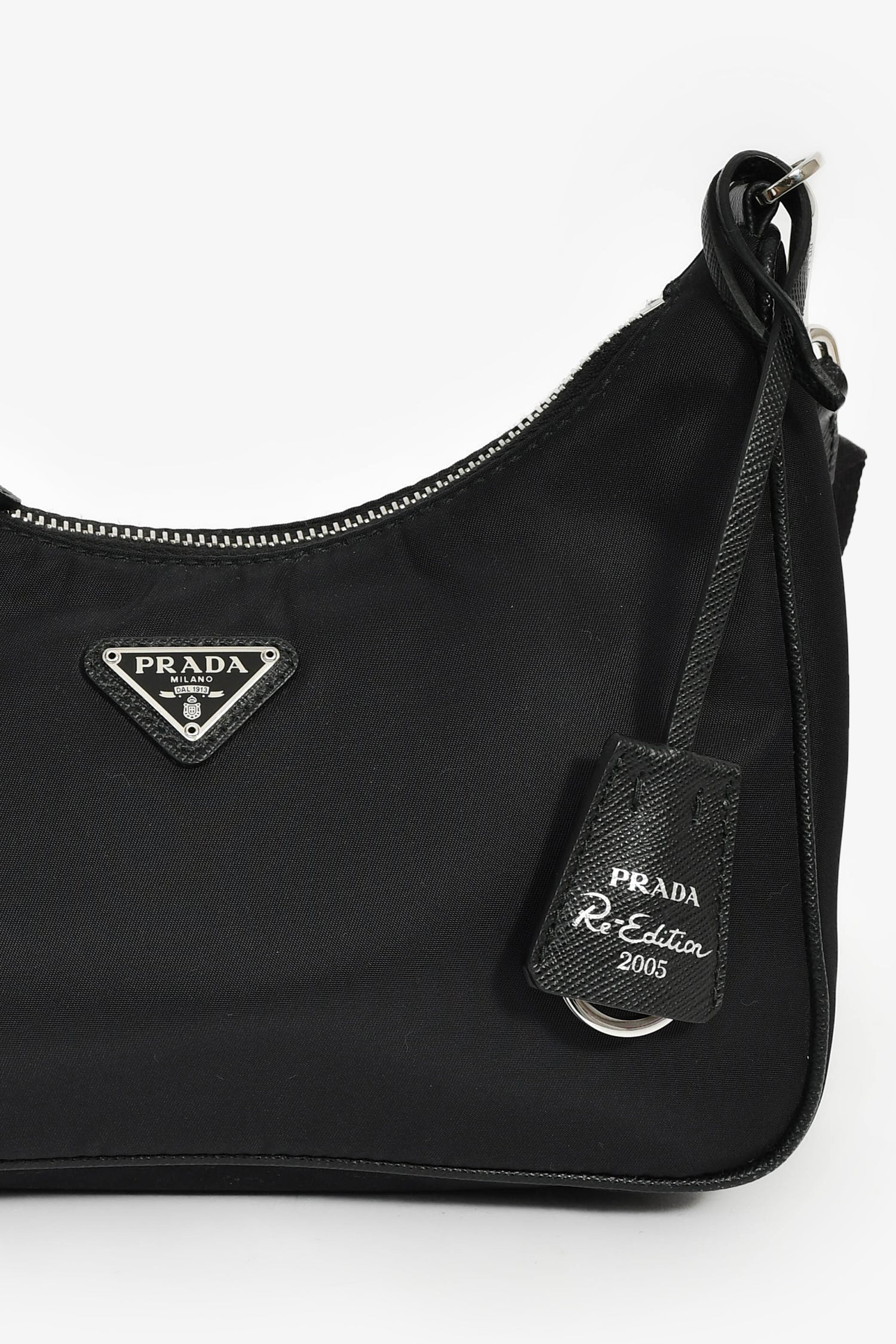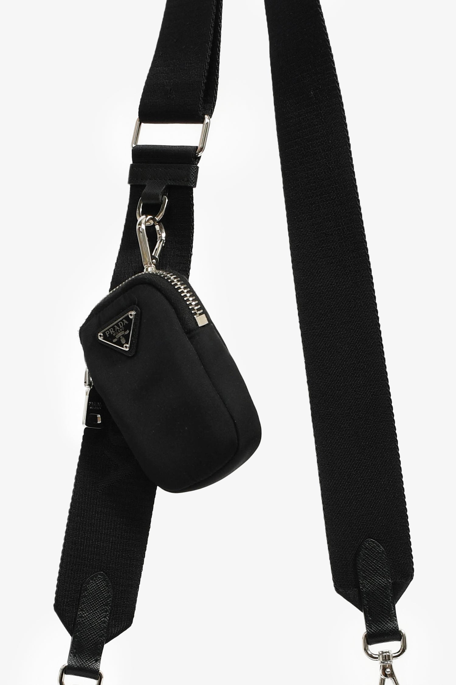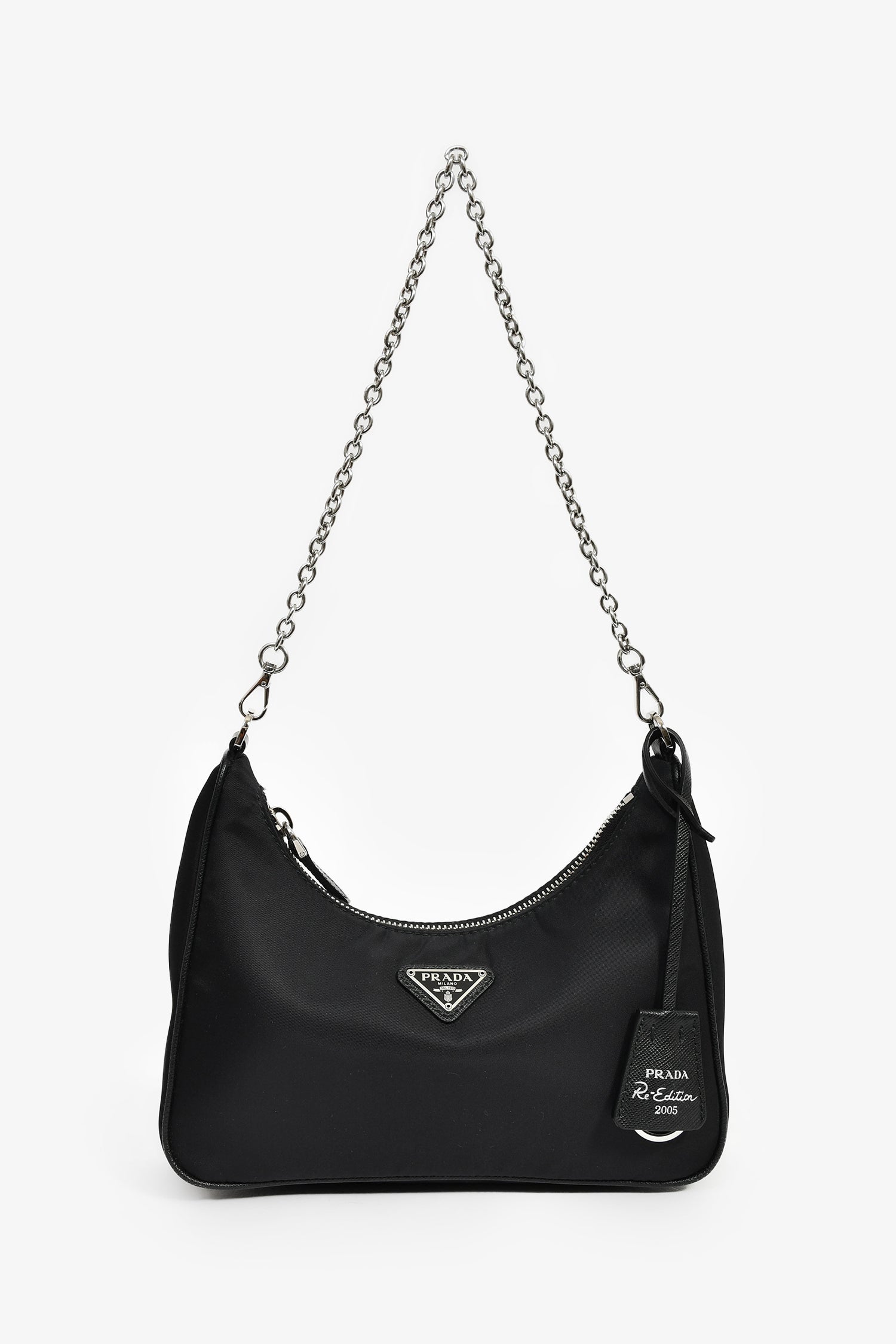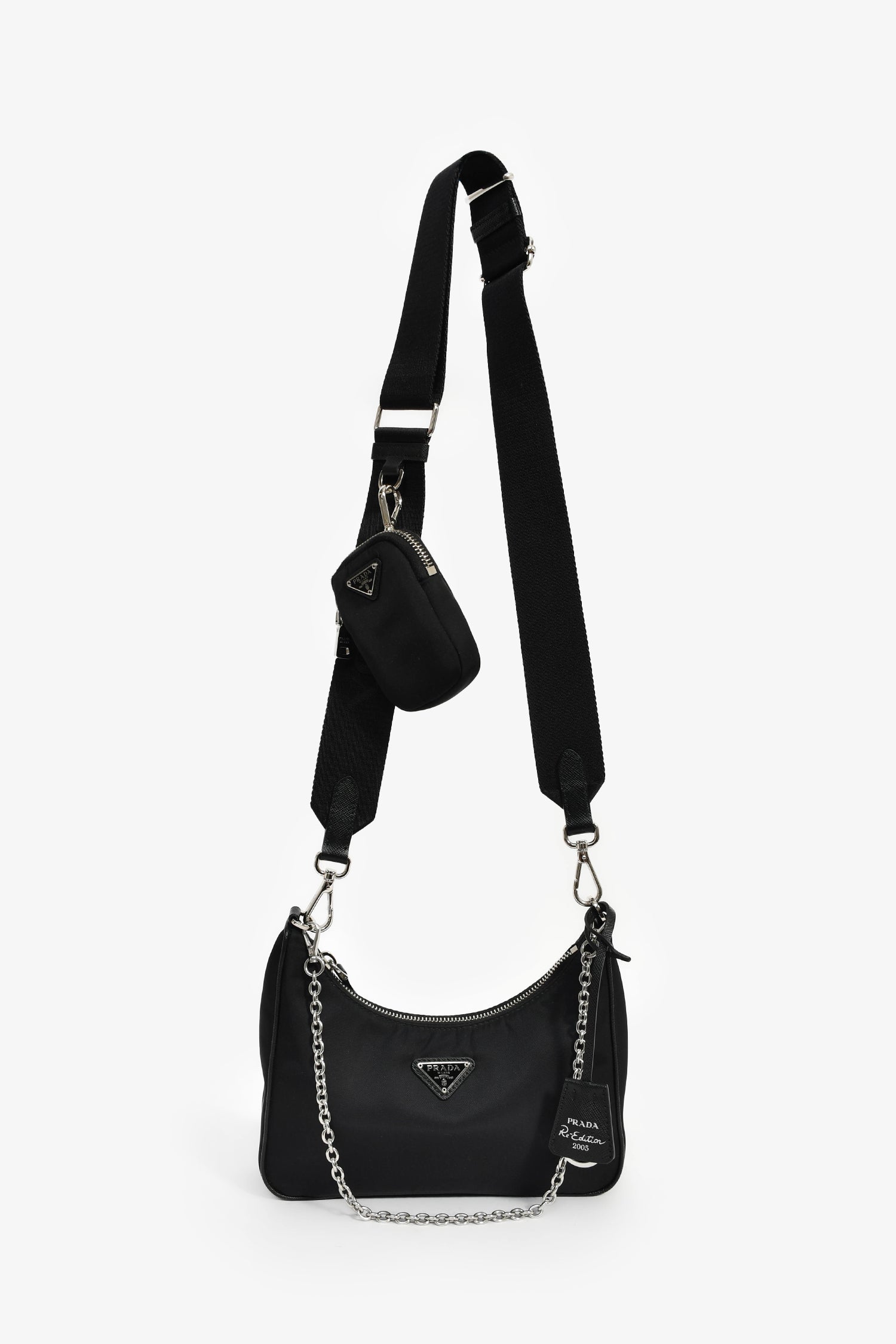 Refresh availabilityPrada Black Re-Nylon Re-Edition 2005 Crossbody Bag with Chain & Pouch. Top zip closure. Detachable and interchangeable chain and fabric strap. Lined interior. Open interior. Detachable clochette. Silver-tone hardware. Tonal stitching.