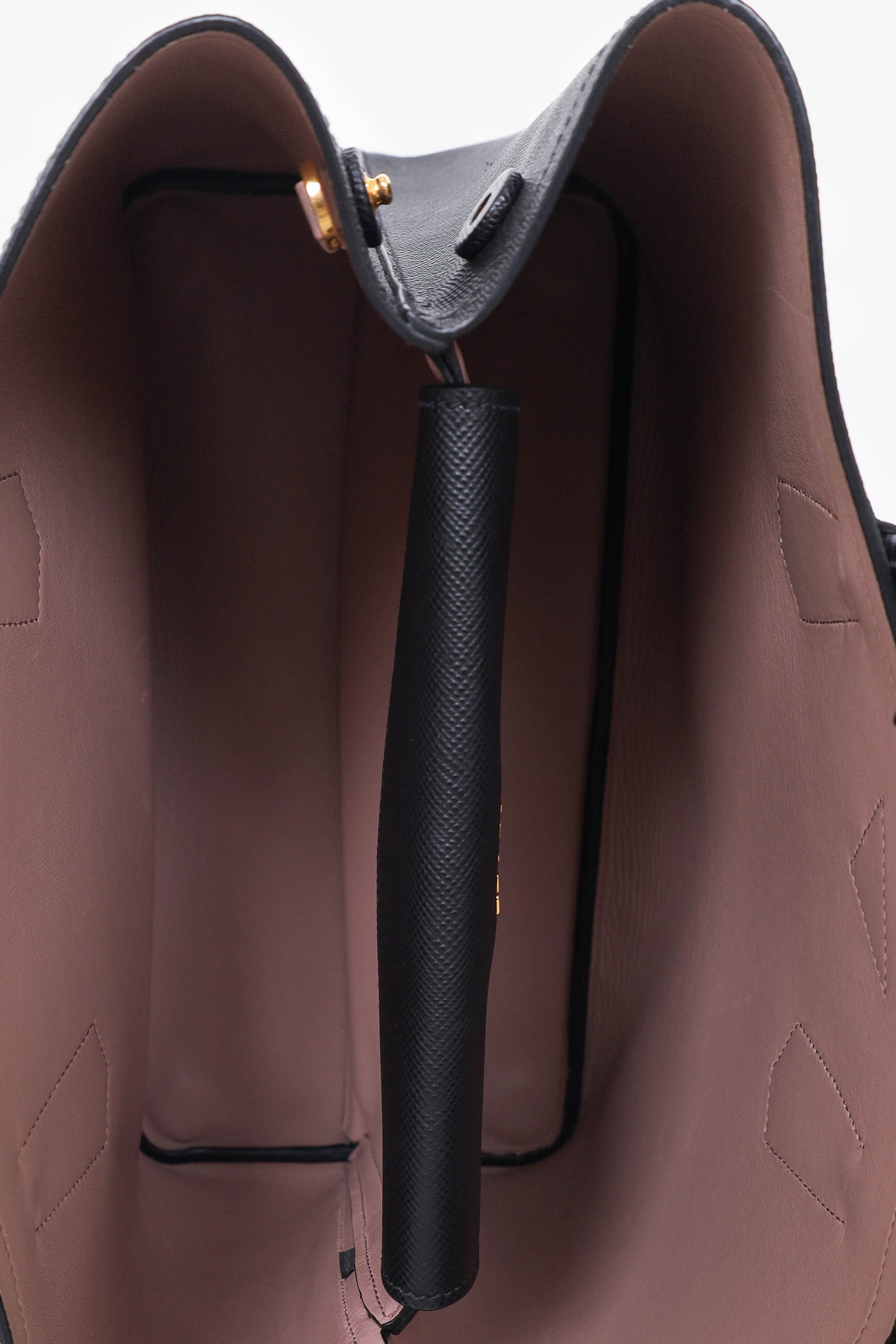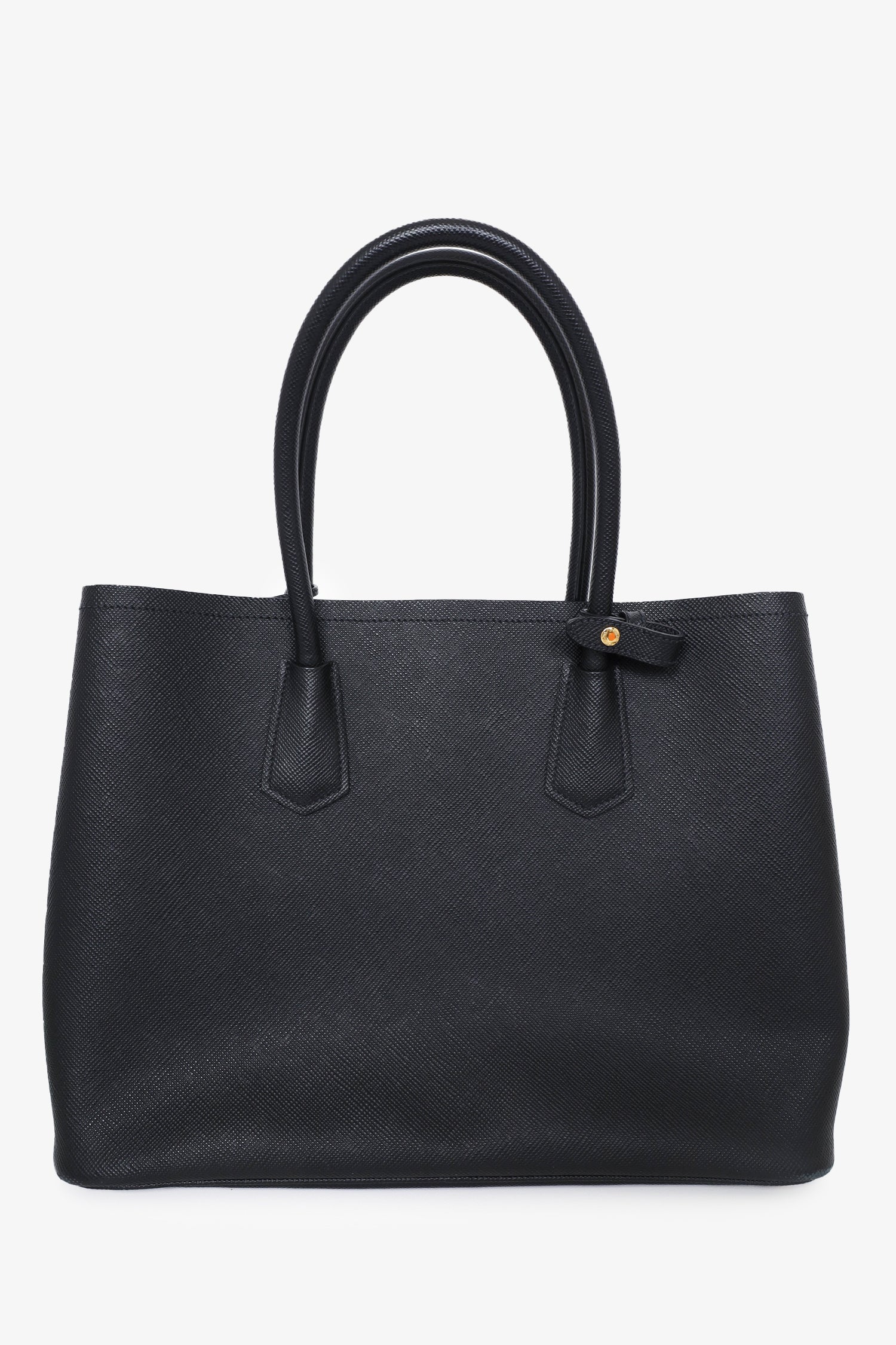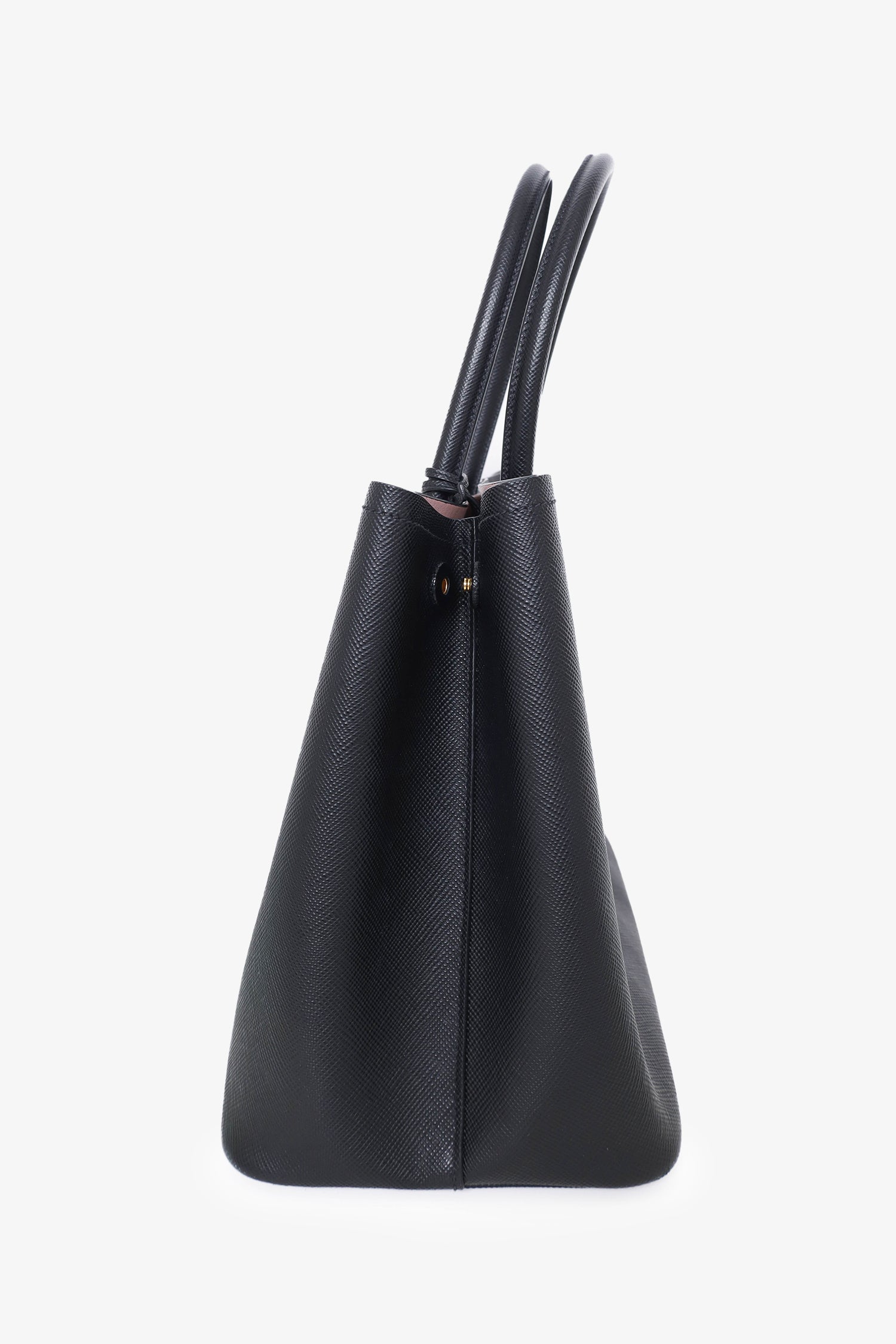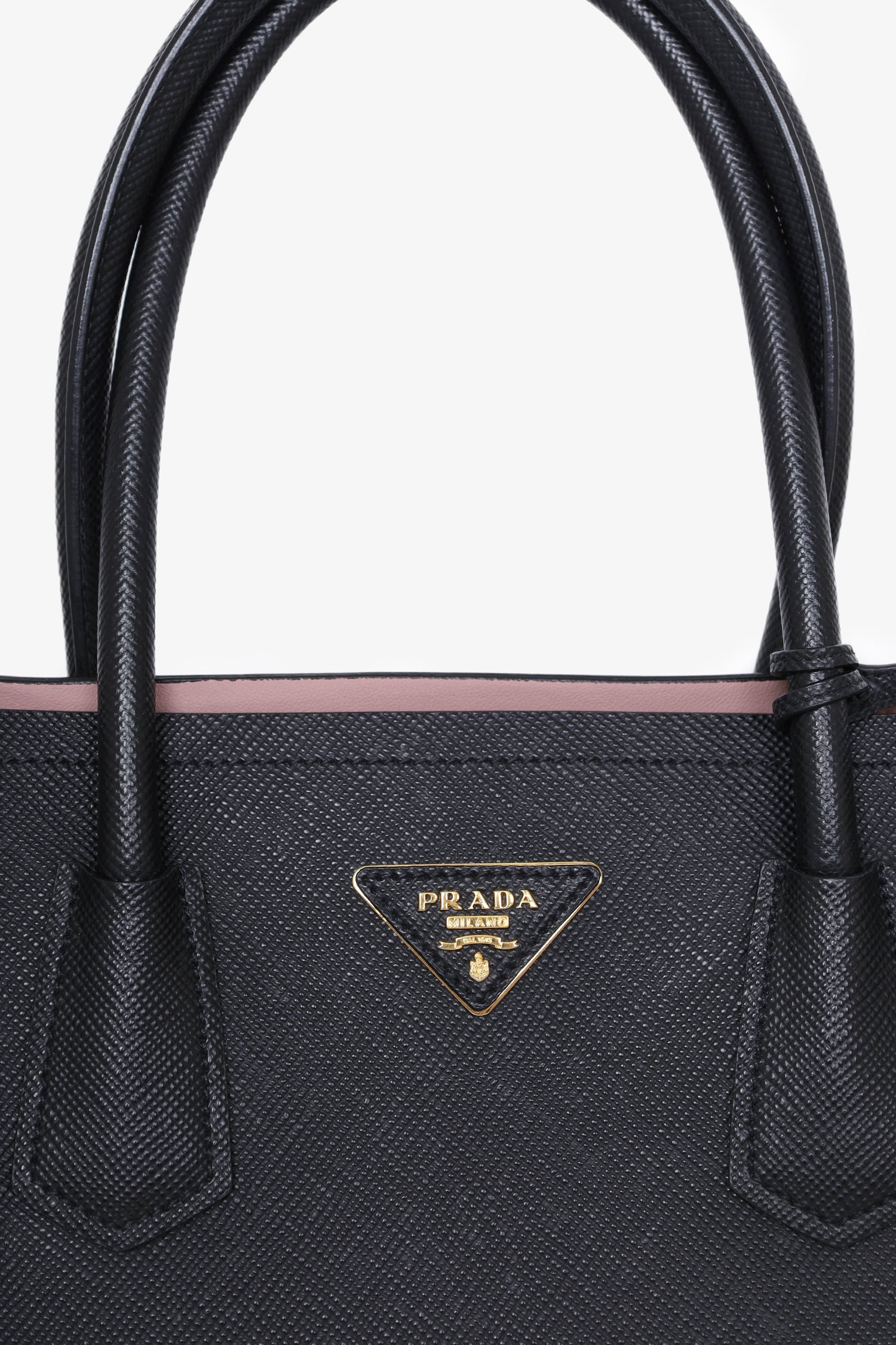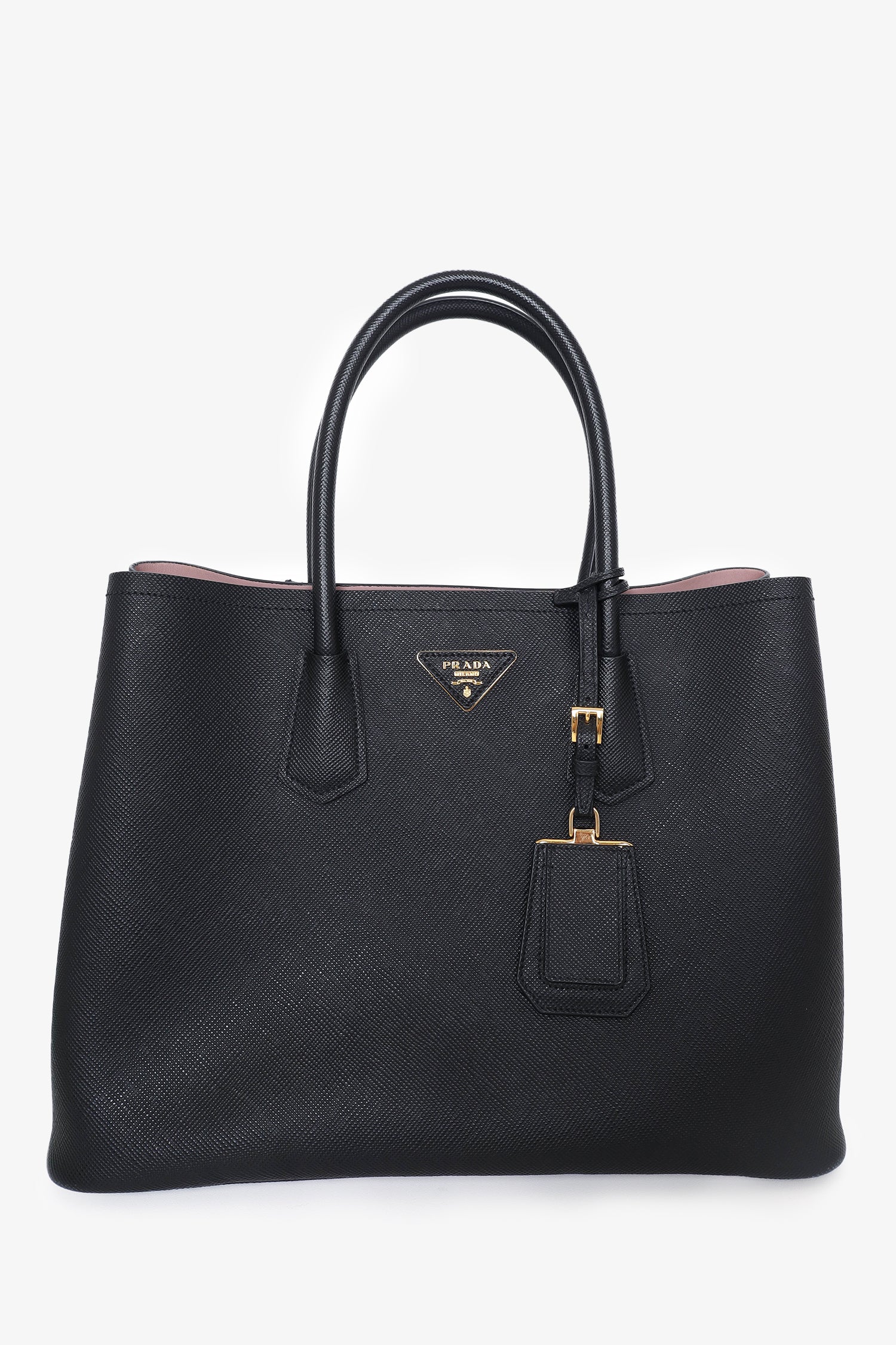 Refresh availabilityPrada Black Saffiano Large Cuir Double Bag with Strap. Twin rolled hardware. 2 interior compartment. Pink interior leather lining. Removable clochette. Interior divider pocket with Magnetic closure. Gold-toned hardware. Tonal stitching.