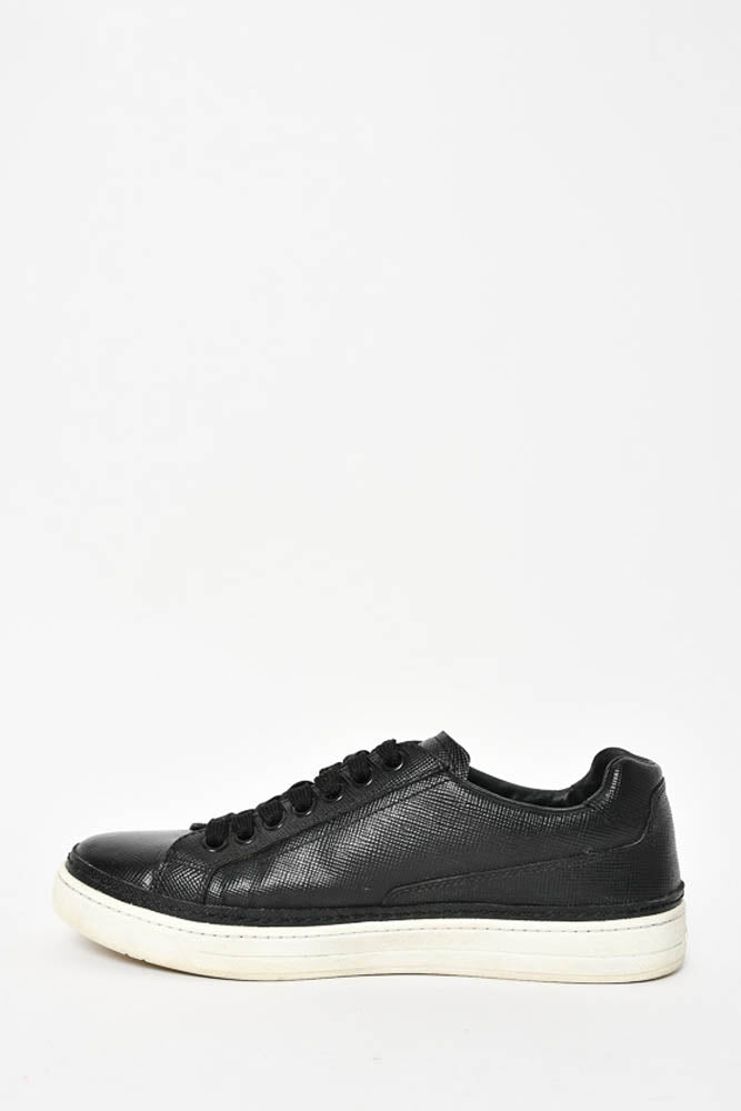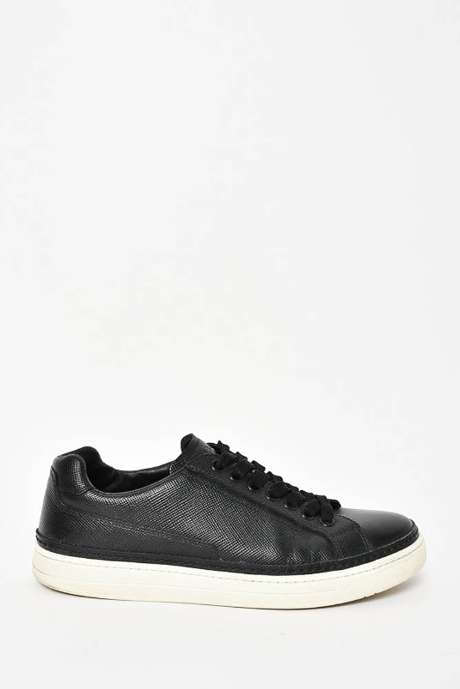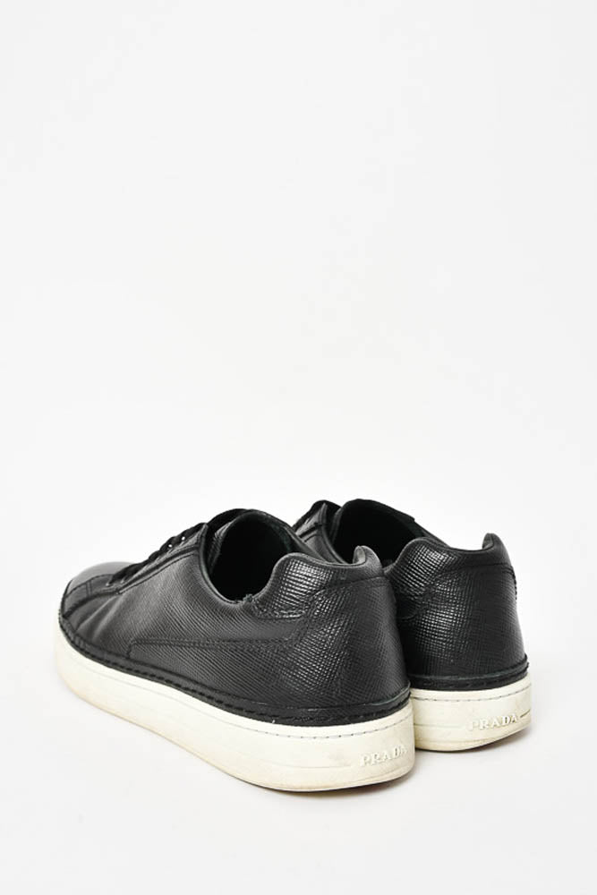 Refresh availabilityPrada Black Saffiano Leather Low Top Sneakers. Round toe. Lace-up. Tonal stitching.