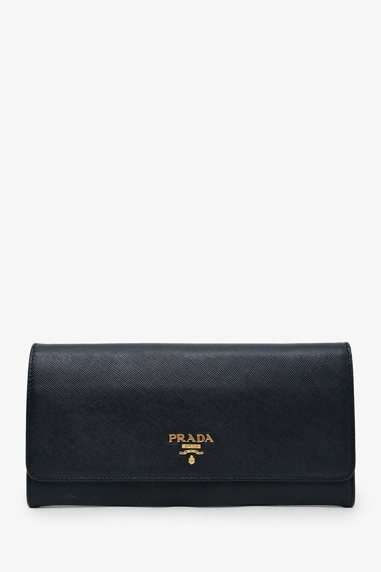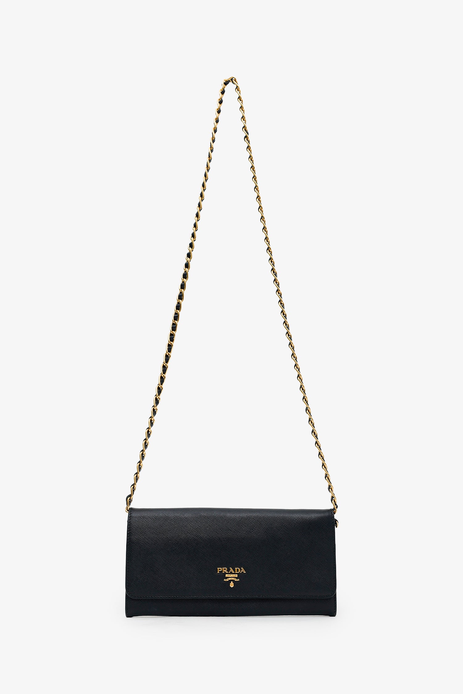 Refresh availabilityPrada Black Saffiano Leather Wallet on Chain. Front fold-over flap with snap-button closure. Removable chainlink and leather strap with snap-button-up closure. Lined interior with 12 pockets; 6 card slots, 3 bill slots, 2 slip, and 1 zip. Gold-tone hardware. Tonal stitching.