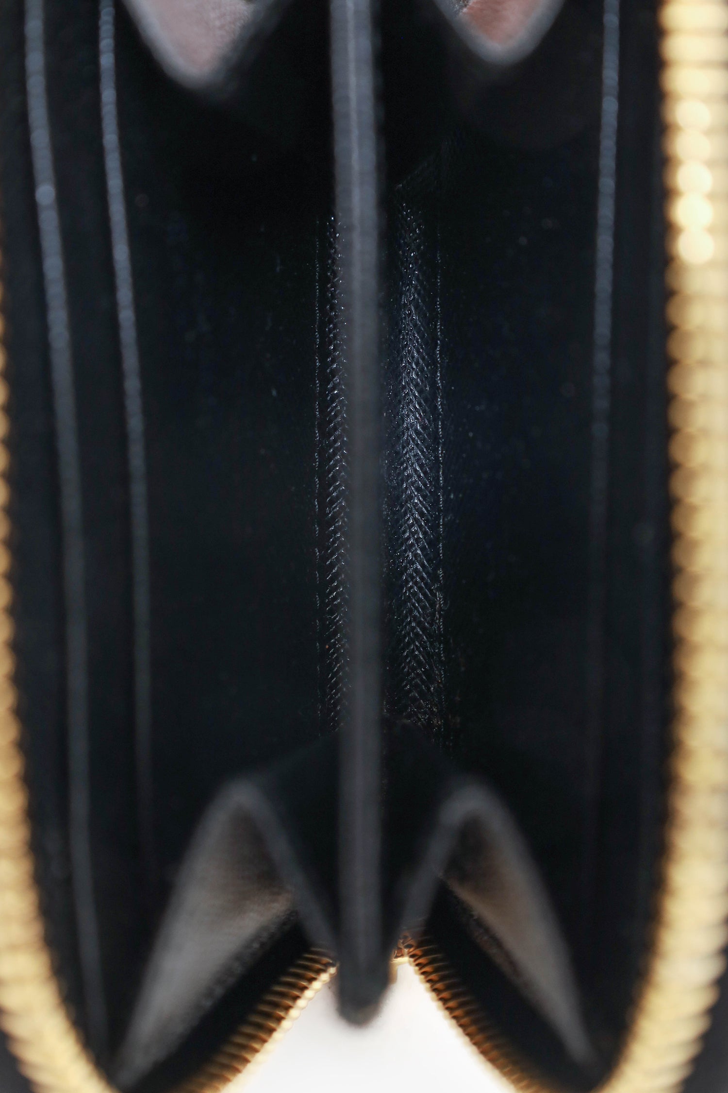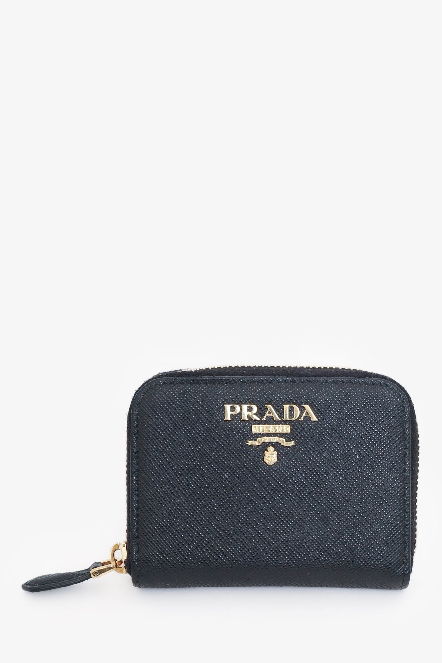 Refresh availabilityPrada Black Saffiano Leather Zip Around Coin Purse. Top zip closure. 2 interior sections with 2 card slip pockets on either side. Gold-tone hardware. Tonal stitching.