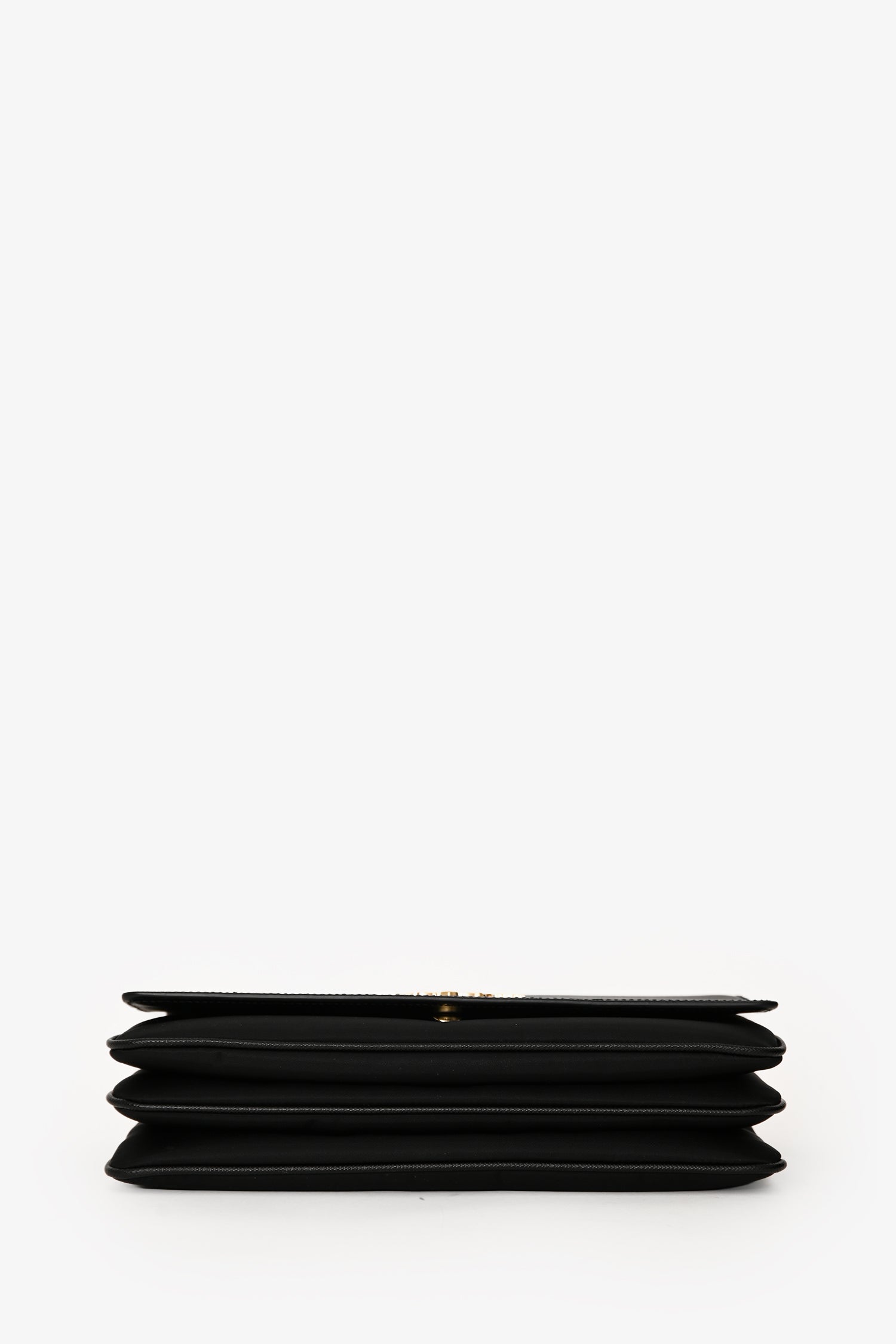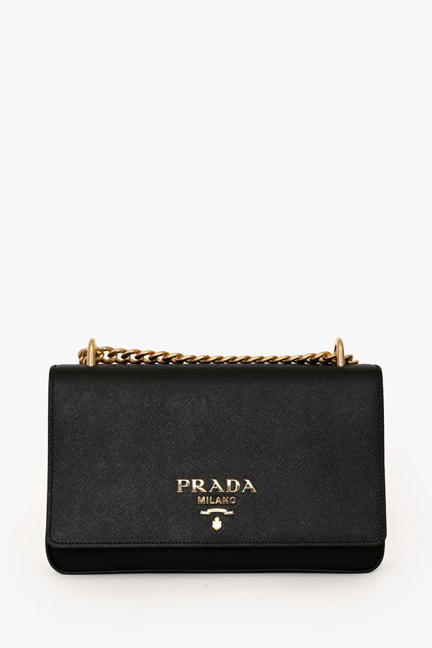 Refresh availabilityPrada Black Saffiano Lux Tessuto Nylon Flap Chain Crossbody Bag. Front fold-over flap with a snap button closure. Chain-link crossbody strap. 3 lined interior compartments with 1 zip. Gold-tone hardware. Tonal stitching.