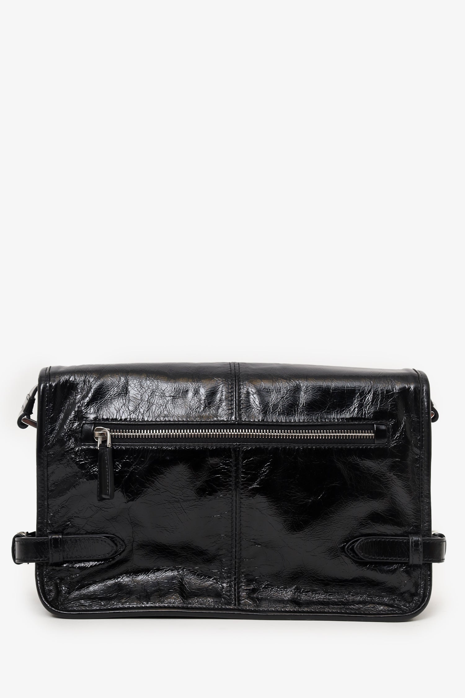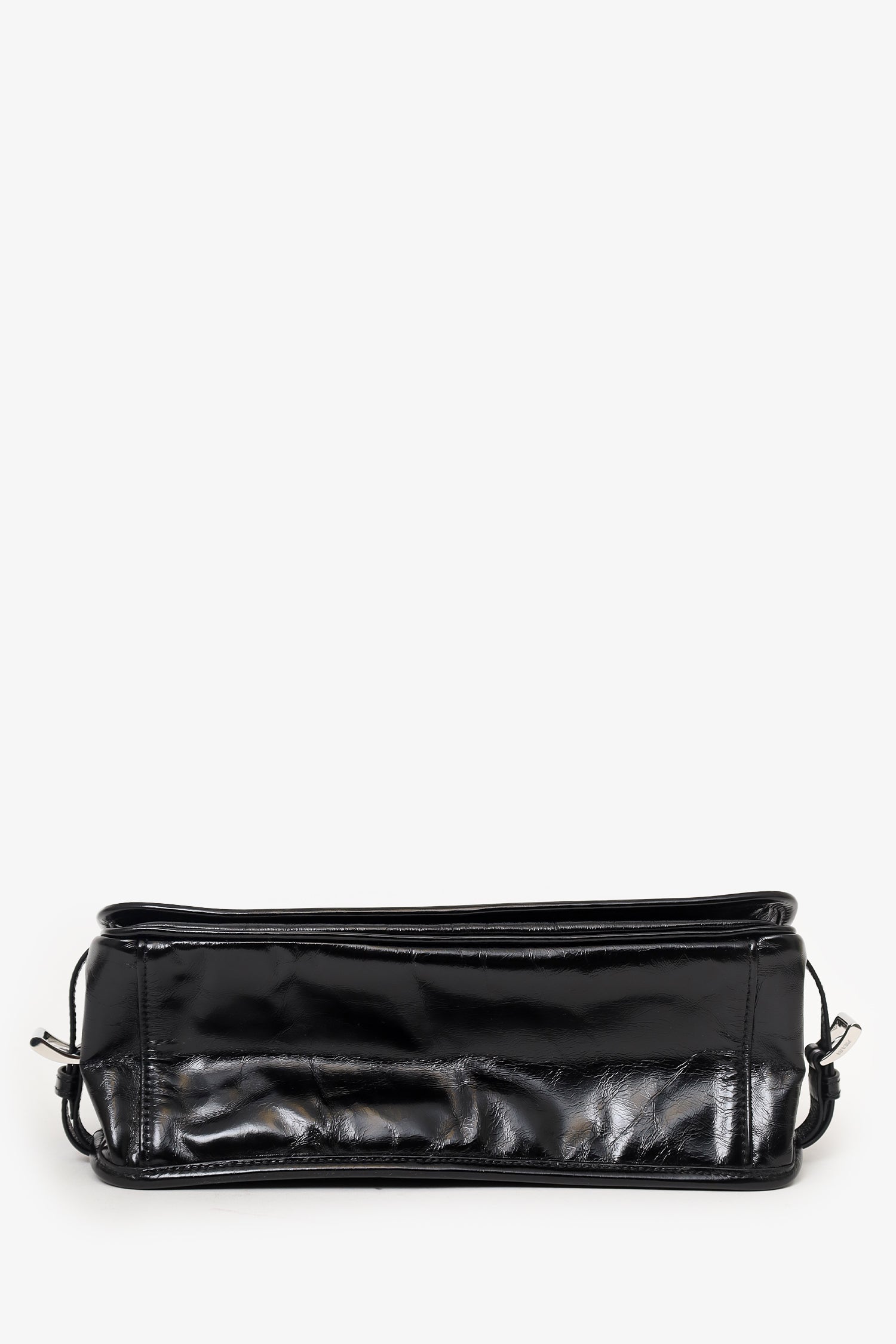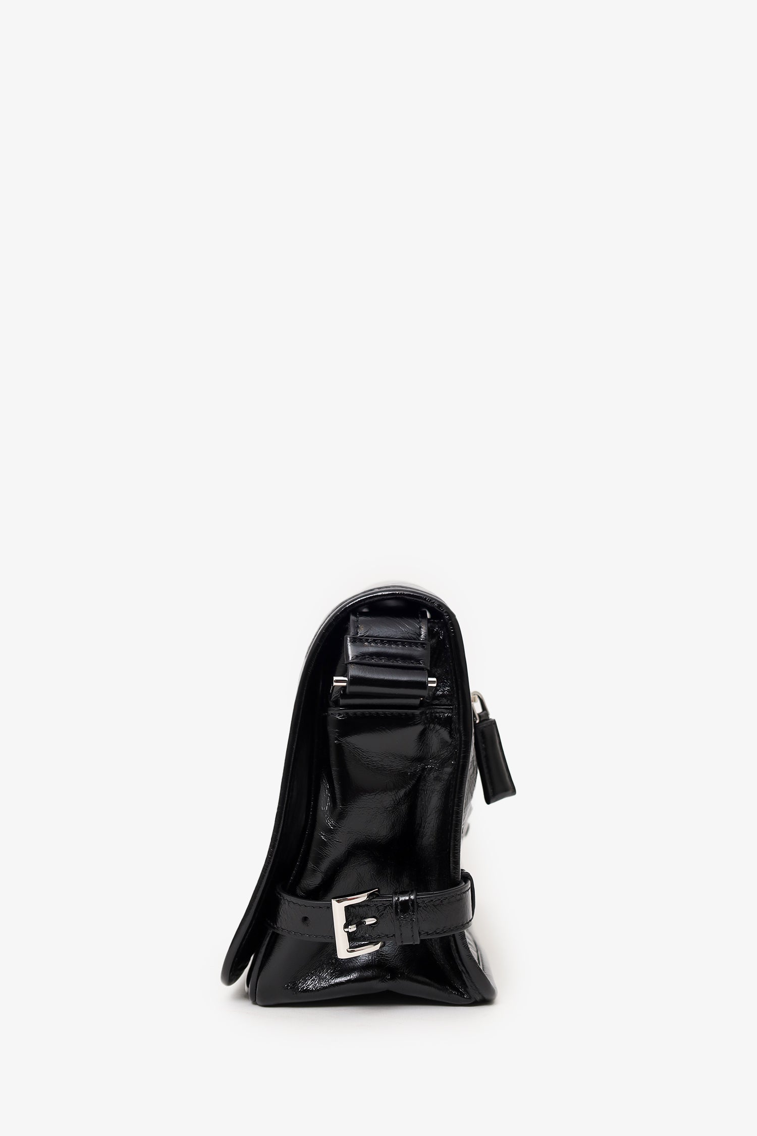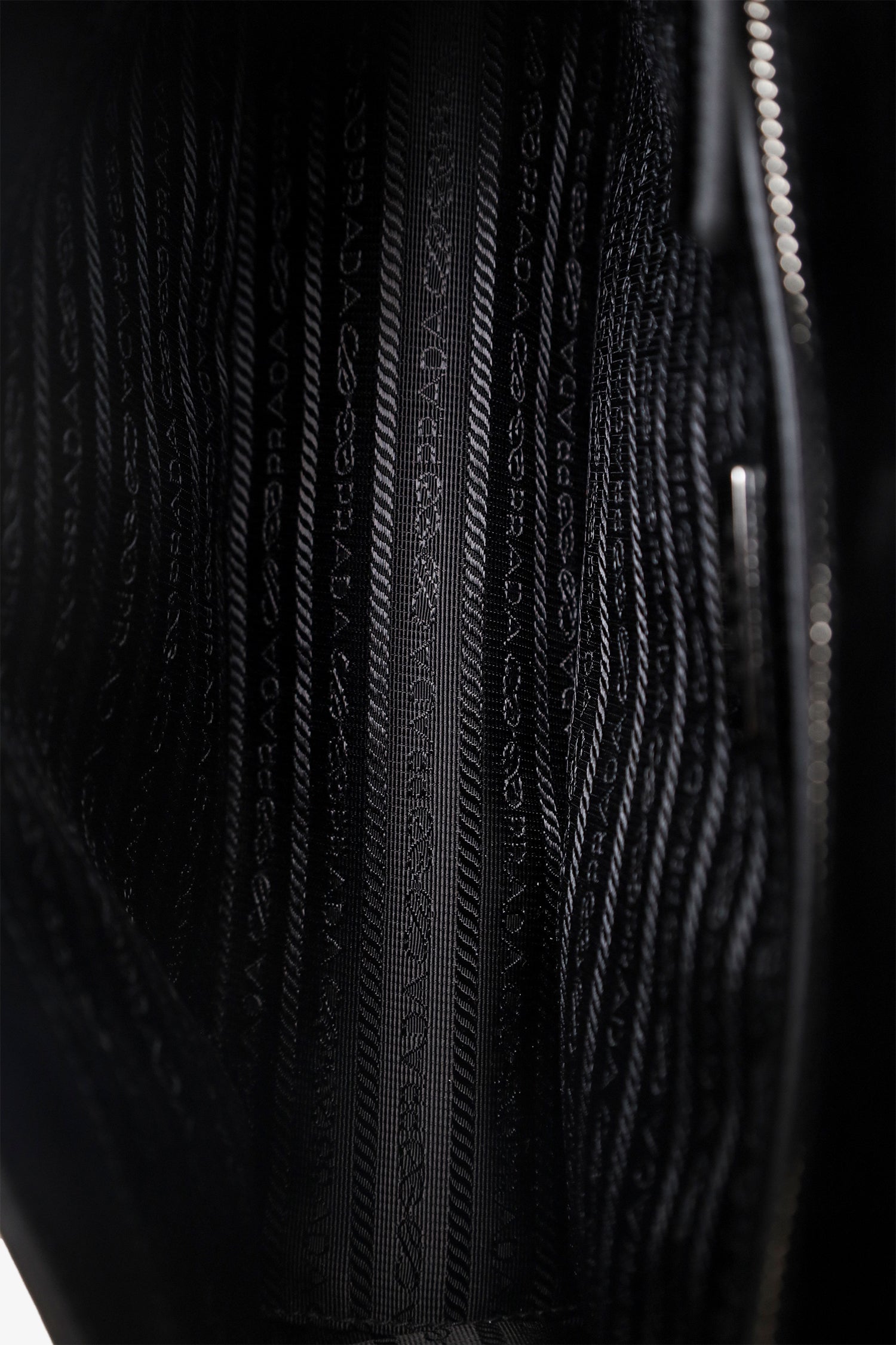 Refresh availabilityPrada Black Small Nappa Leather Duffle Bag. Front fold-over flap with magnetic closure. Shoulder strap with adjustable buckle closure. Rear exterior zip pocket. Straps with adjustable buckle closure on sides of bag. Lined-interior. Single interior pocket. Silver-tone hardware. Tonal stitching.