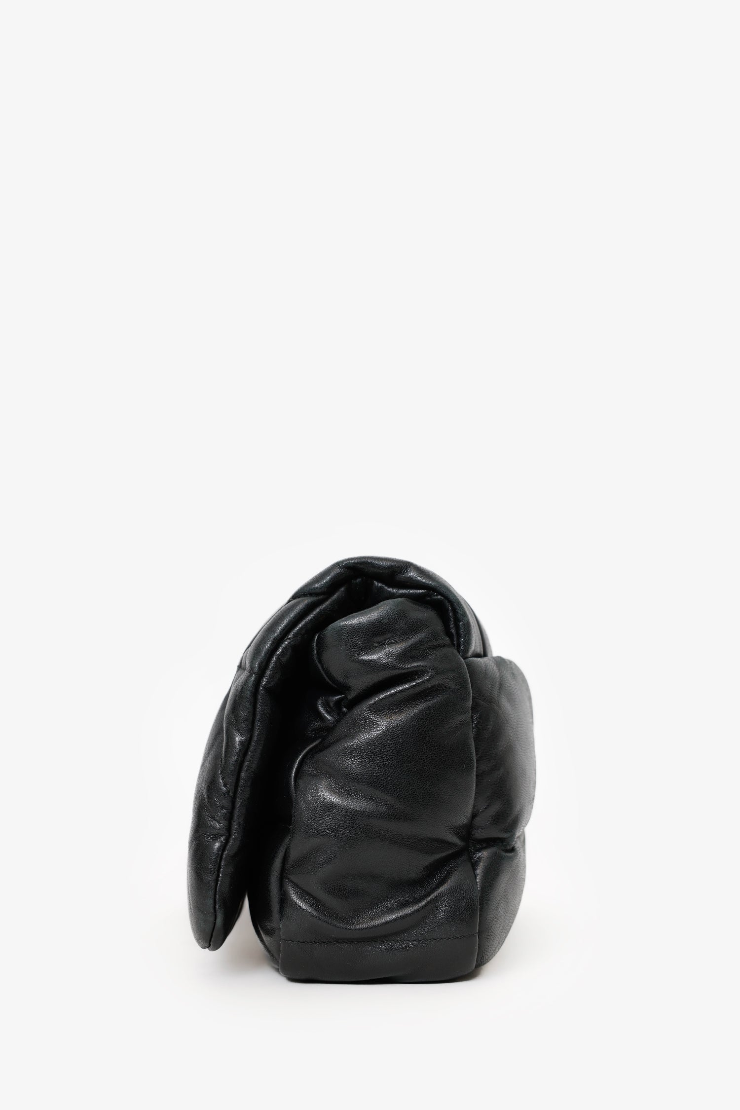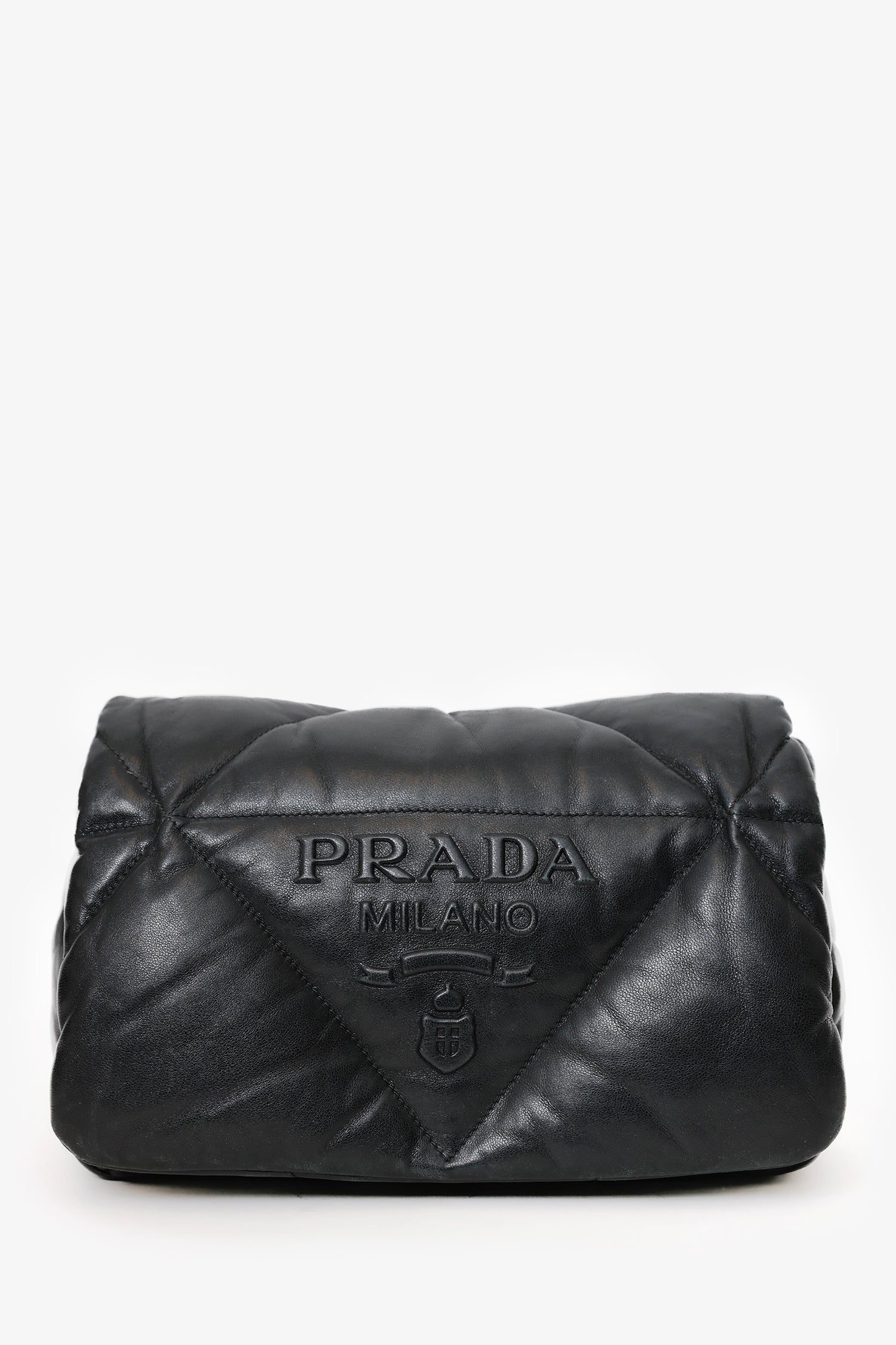 Refresh availabilityPrada Black Soft Quilted Padded Leather Medium Patchwork System Flap Shoulder Bag. Front fold-over flap with snap-button up closure. Chain link shoulder strap. Removable leather shoulder strap with clasp closure. Single exterior rear snap-button-up pocket. Leather-lined interior with 2 pockets; 1 slip, and 1 zip-up. Gold-tone hardware. Tonal stitching.