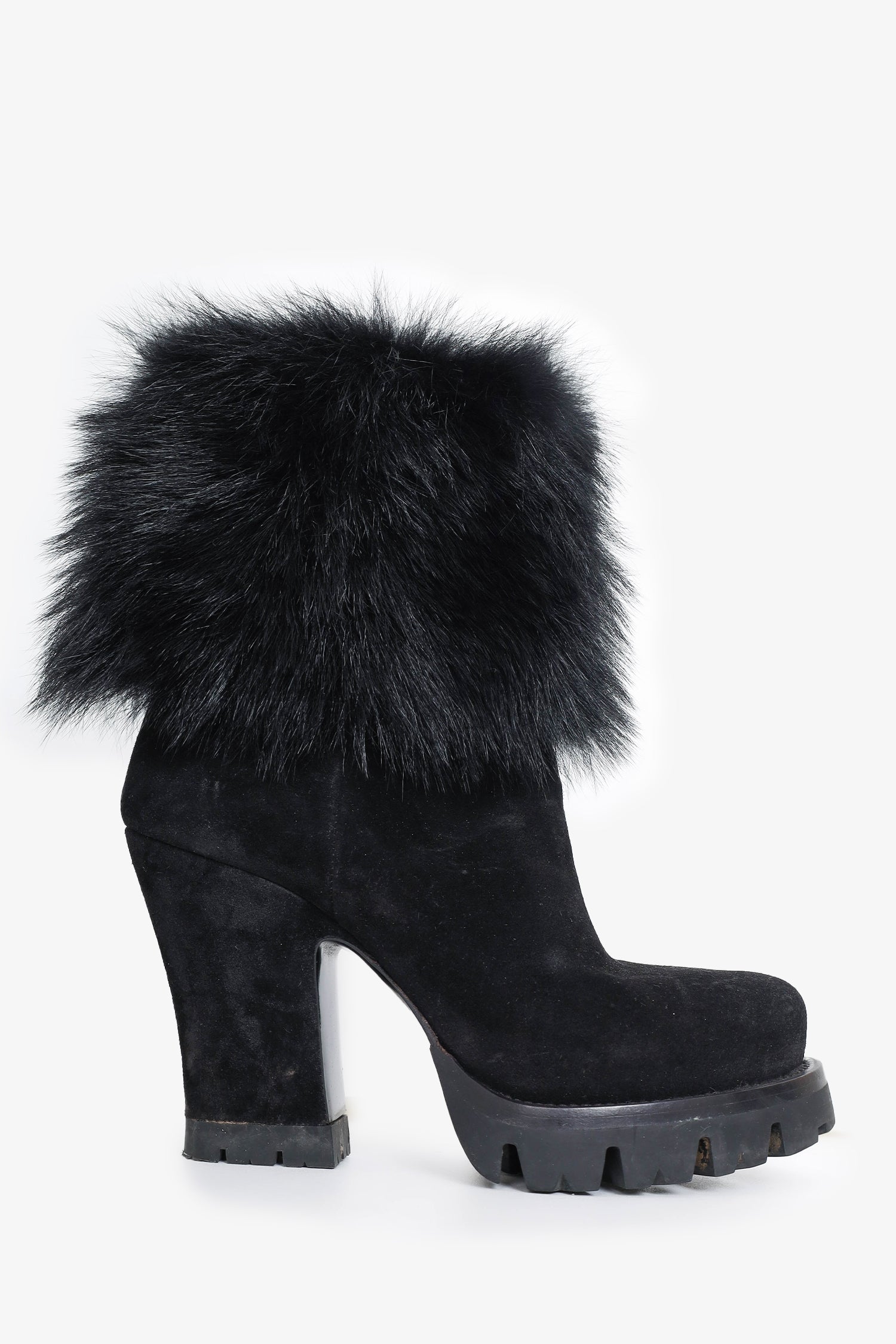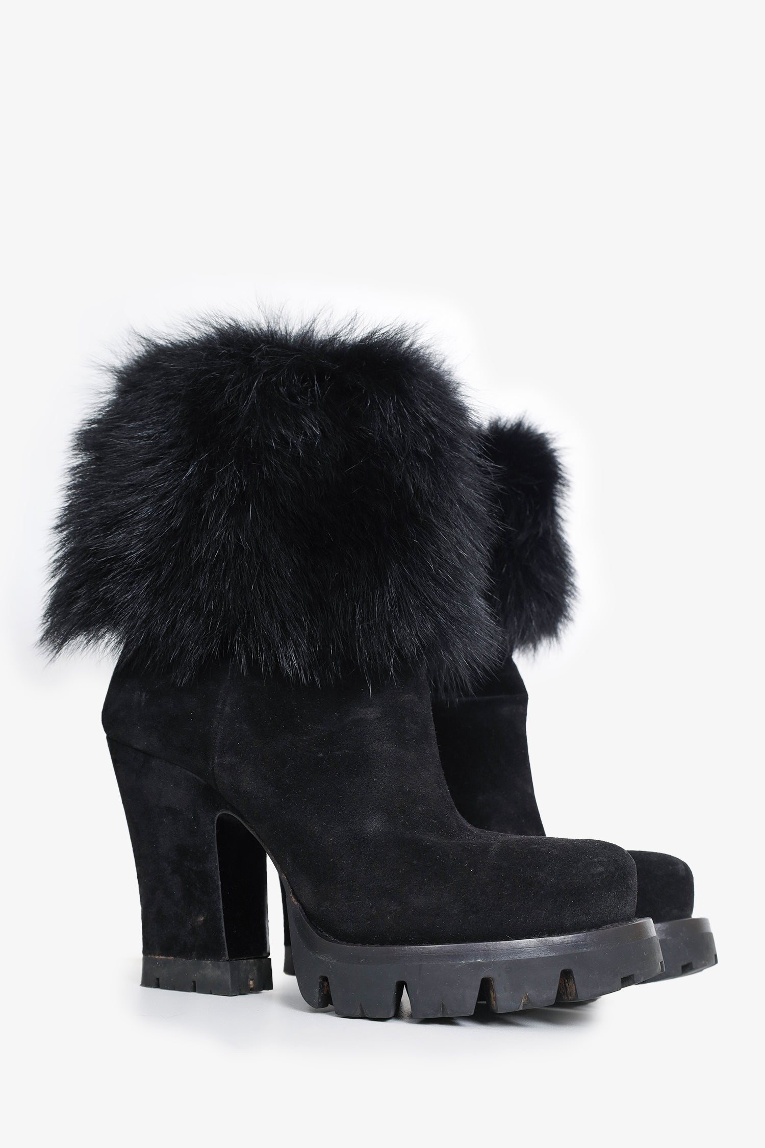 Refresh availabilityPrada Black Suede Fur Shearling Heeled Boots. Slip-on. Round toe. Block heel. Tonal stitching.