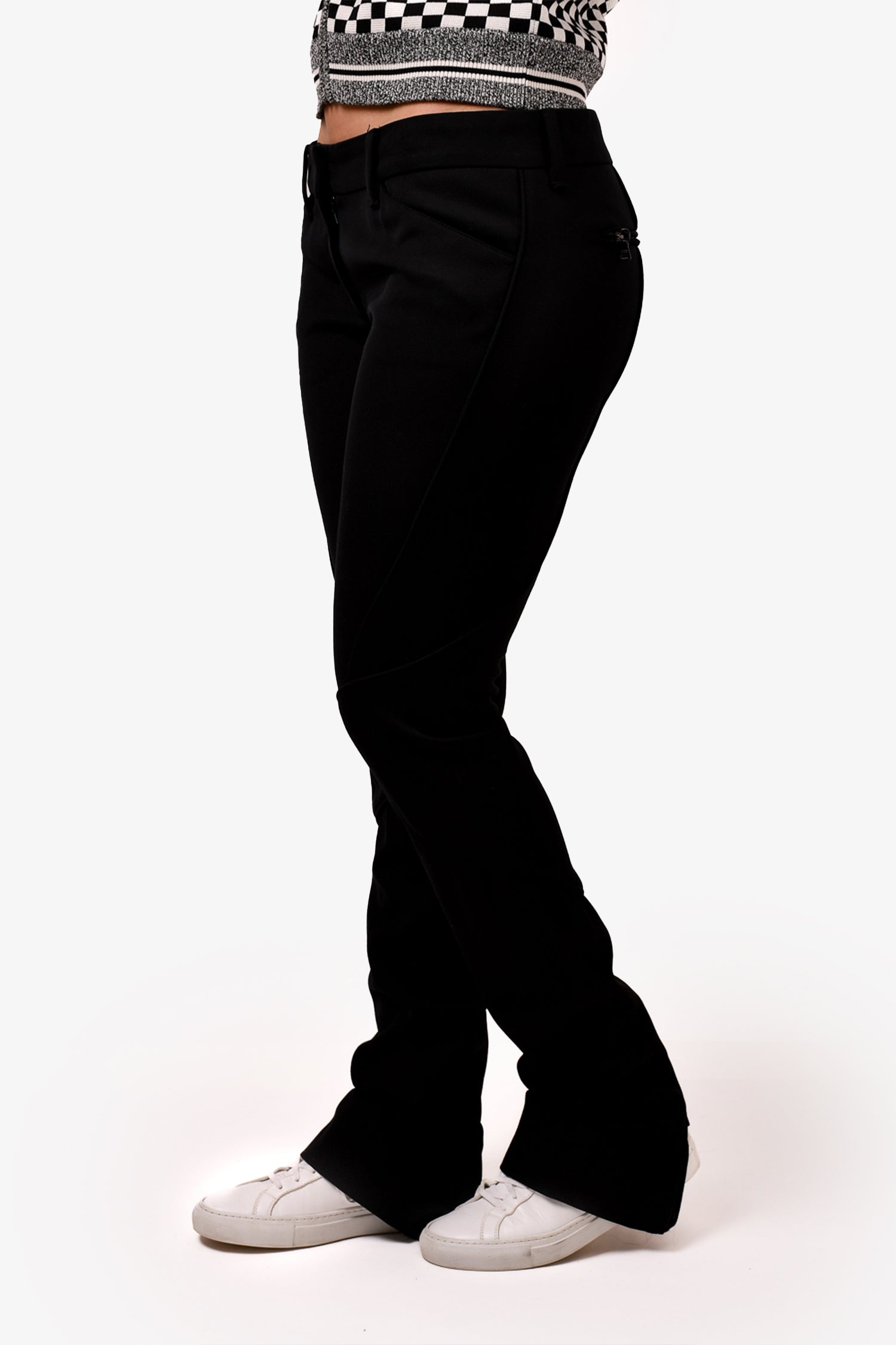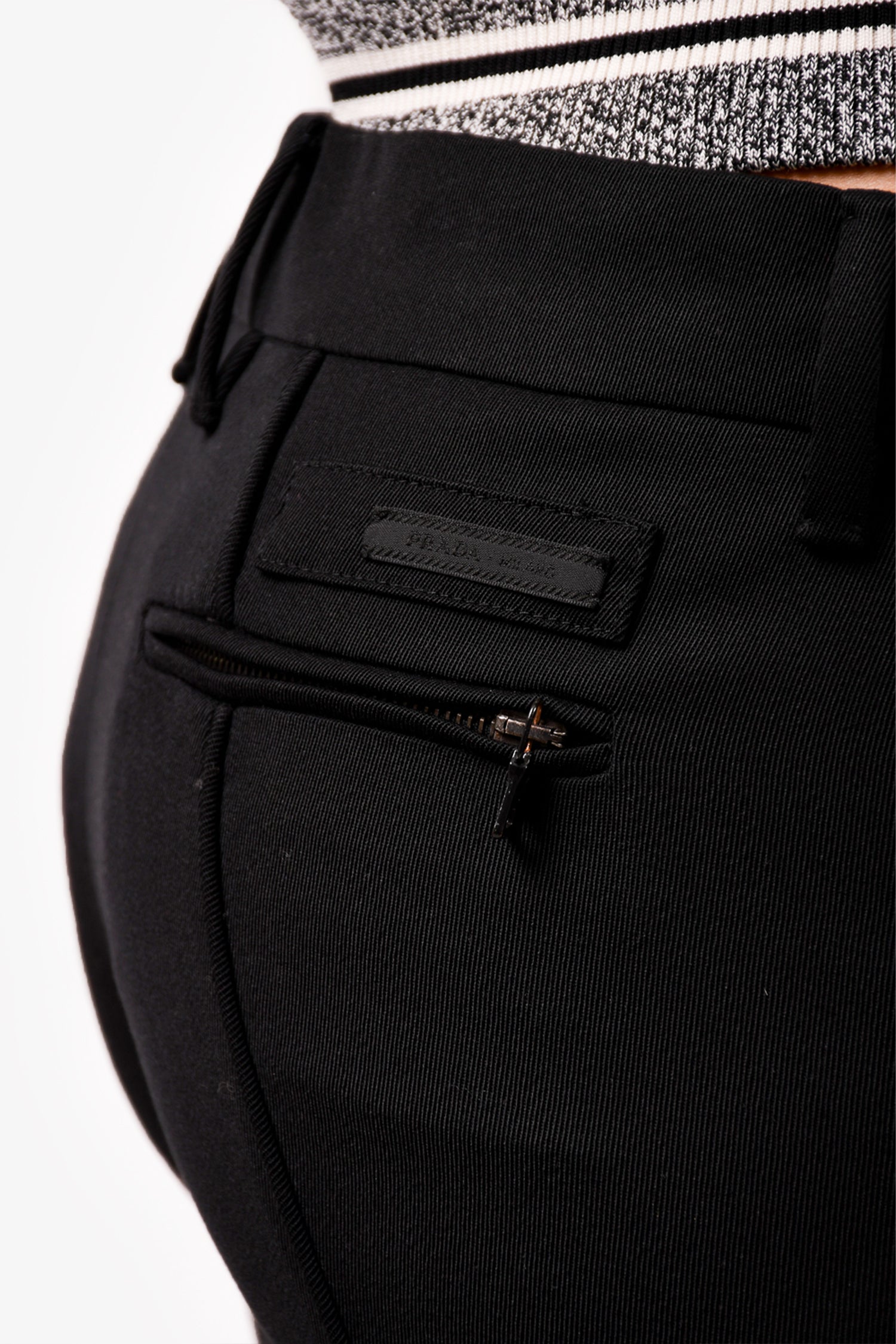 Refresh availabilityPrada Black Trousers with Zip Detail. Front zip, hook and button closure. Front slip pockets. Outer rear zip pockets. Waist belt loops. Tonal stitching.
