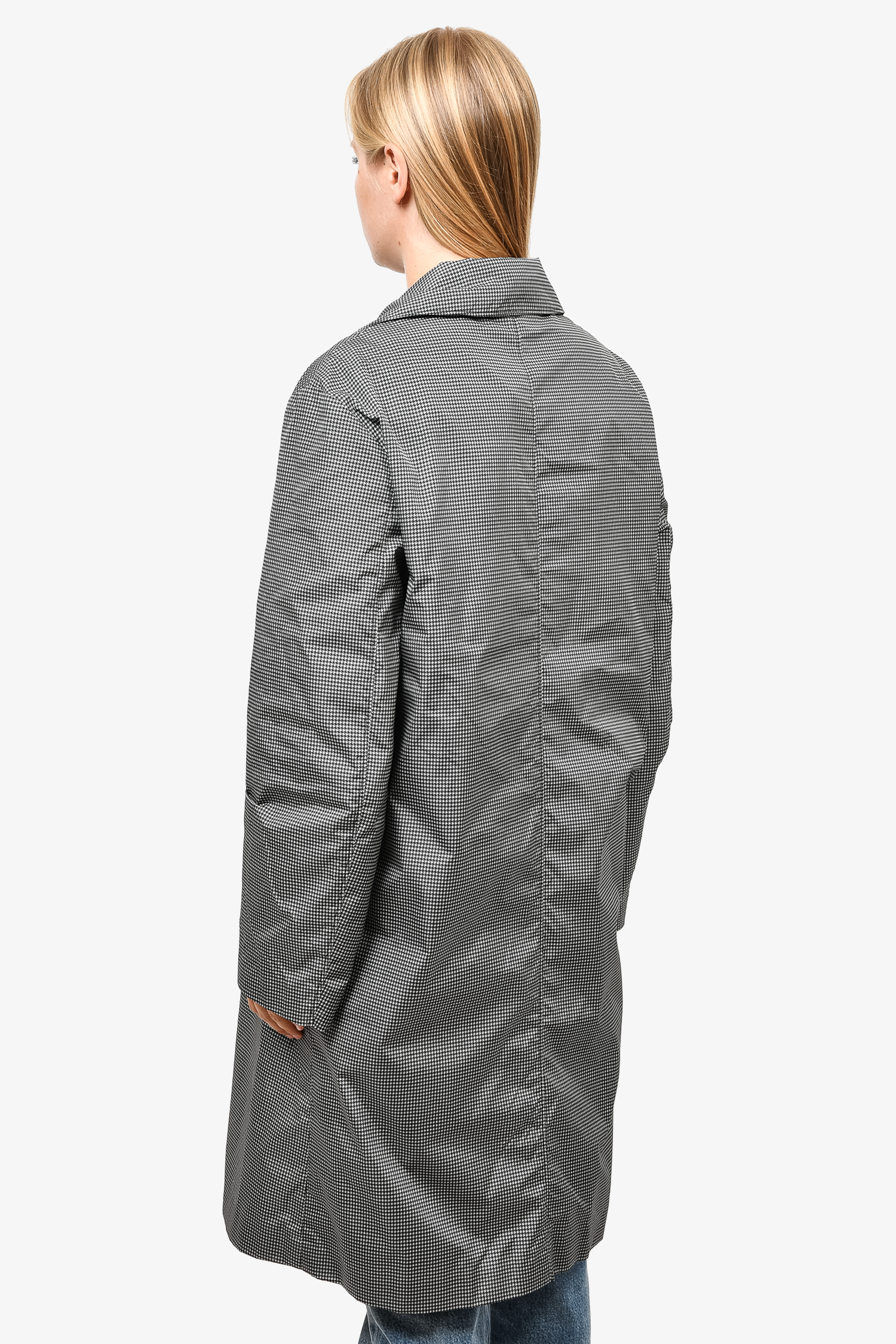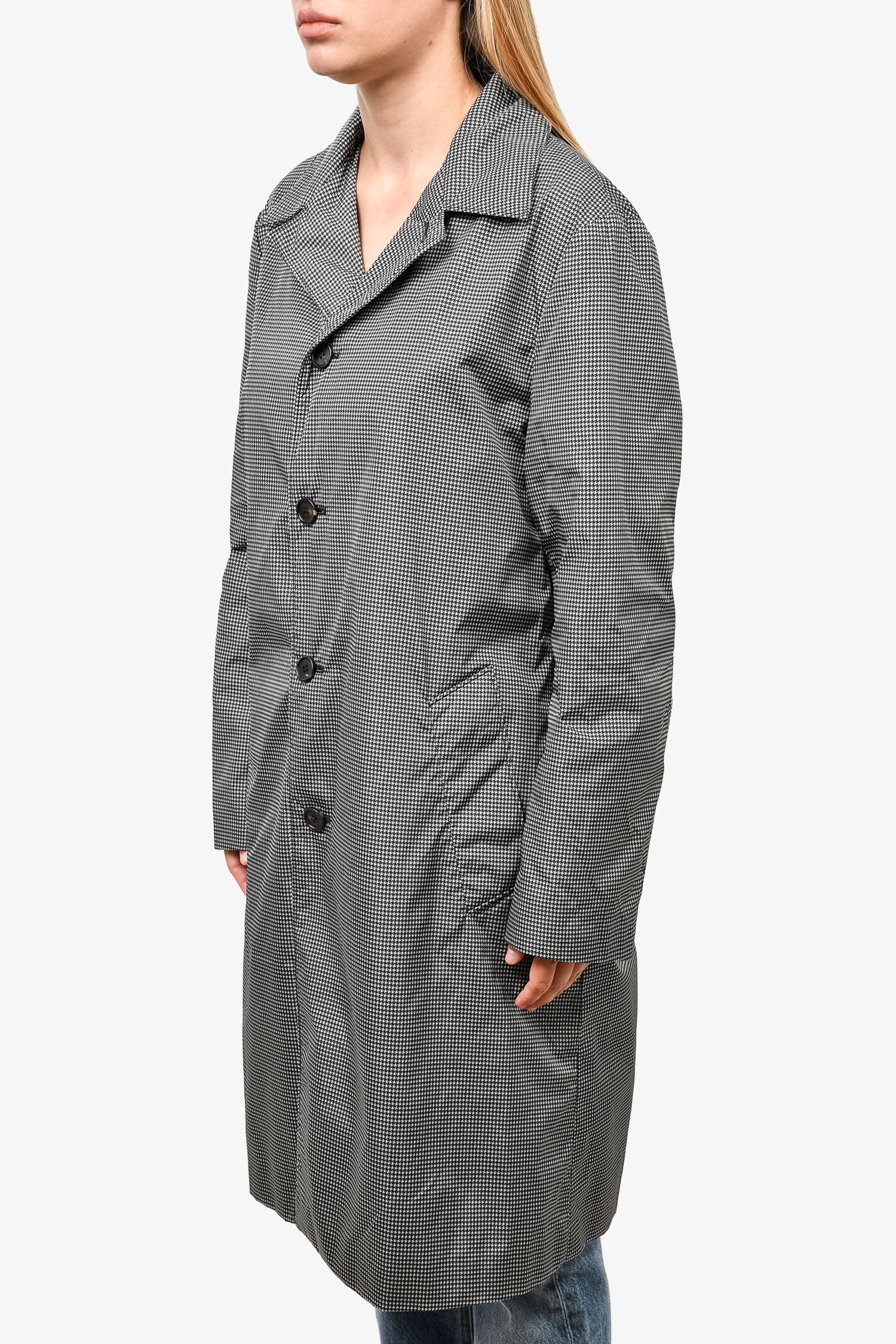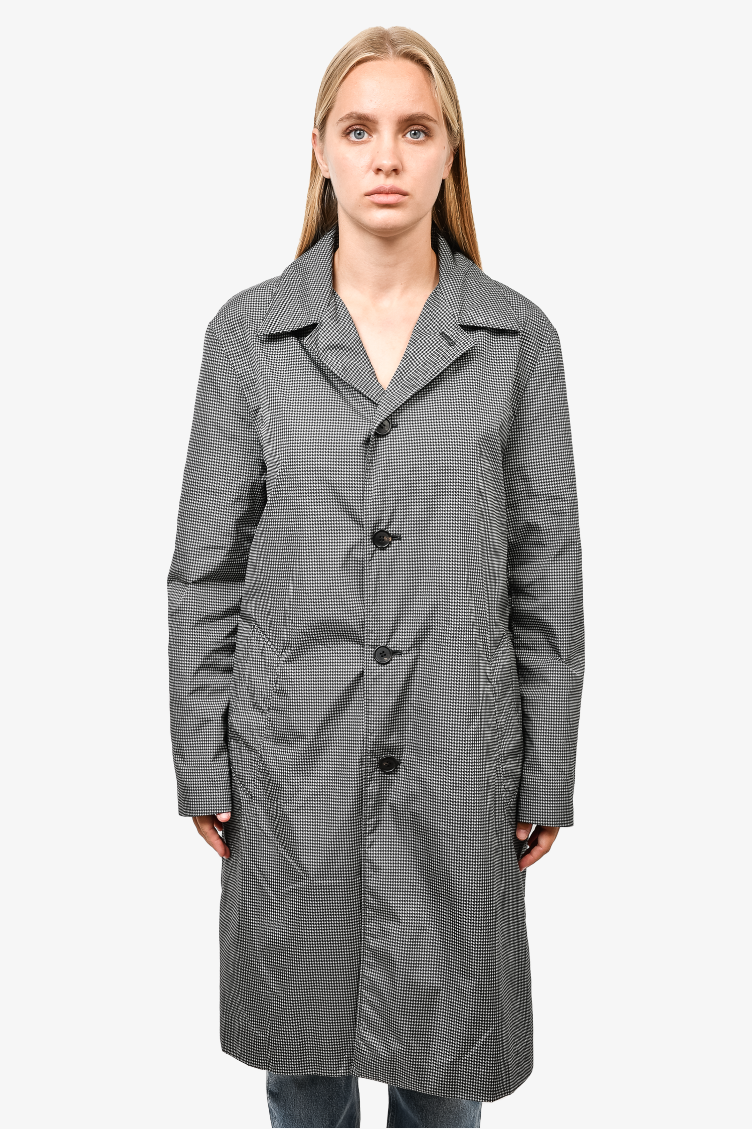 Refresh availabilityPrada Black/White Houndstooth Nylon Collared Trench Coat. Front button-up closure. Front pockets. Tonal stitching.