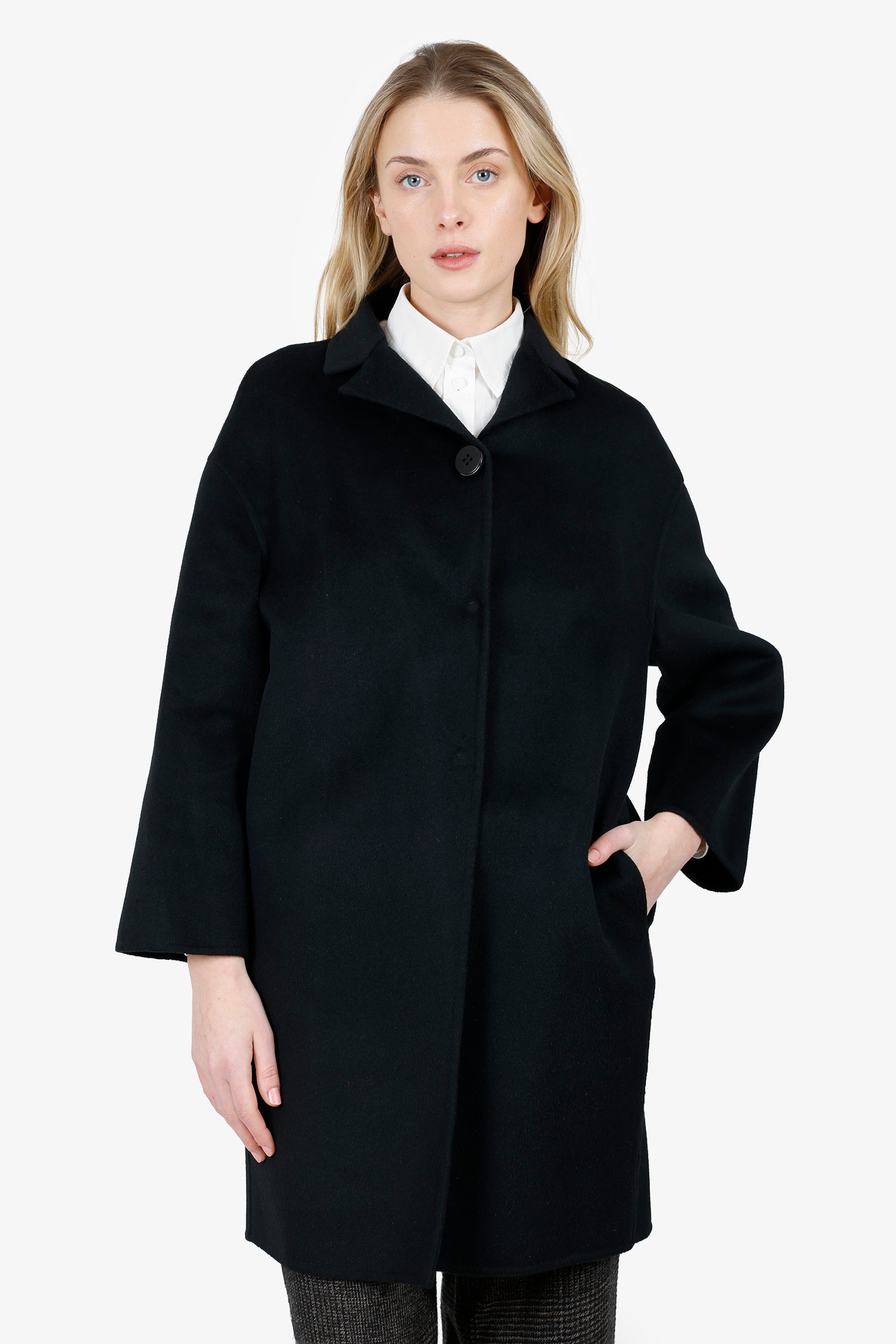 Refresh availabilityPrada Black Wool Coat. Collared neckline. Front button-up closure. 2 exterior side slip pockets. Partially lined interior. Silver-toned hardware. Tonal stitching.