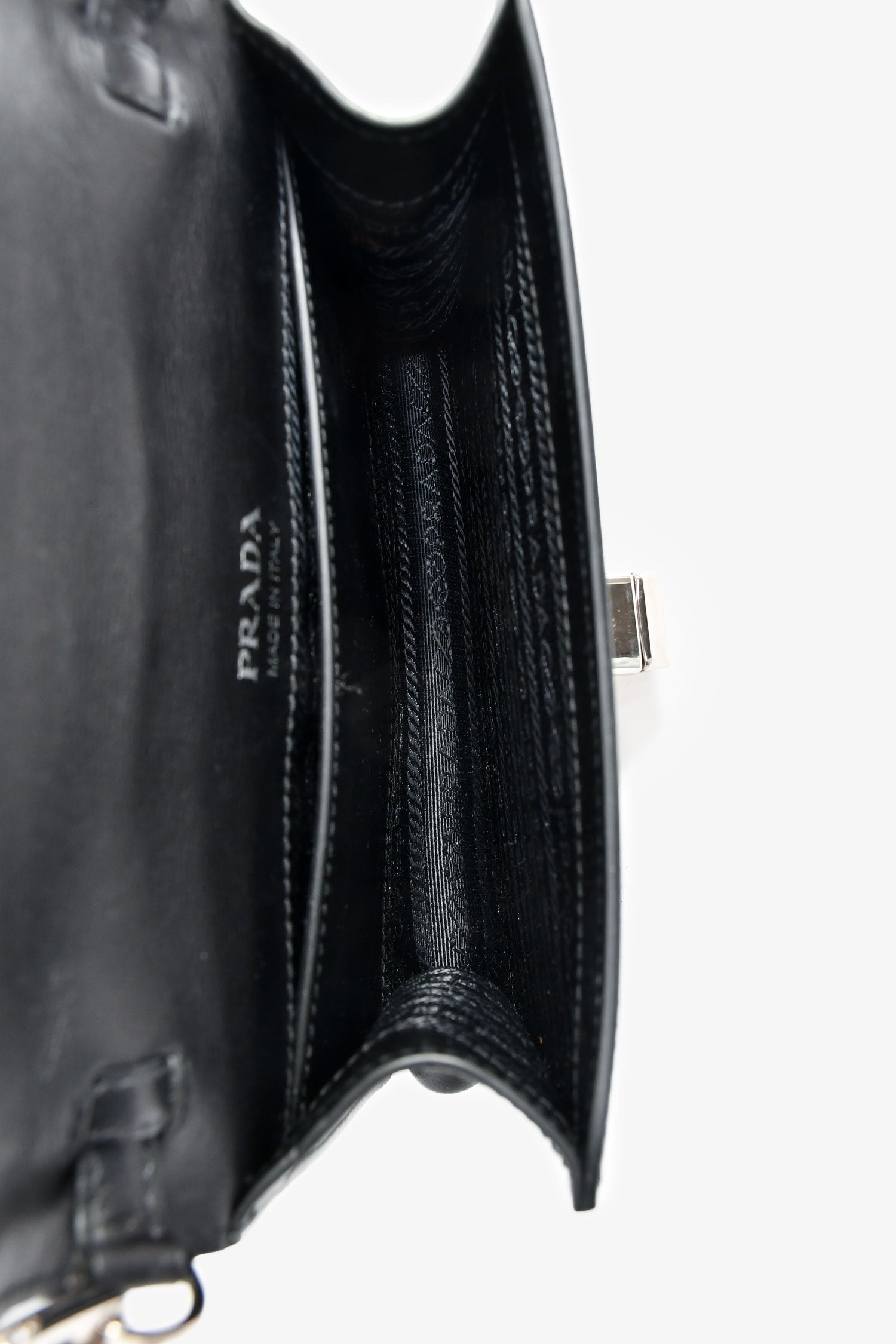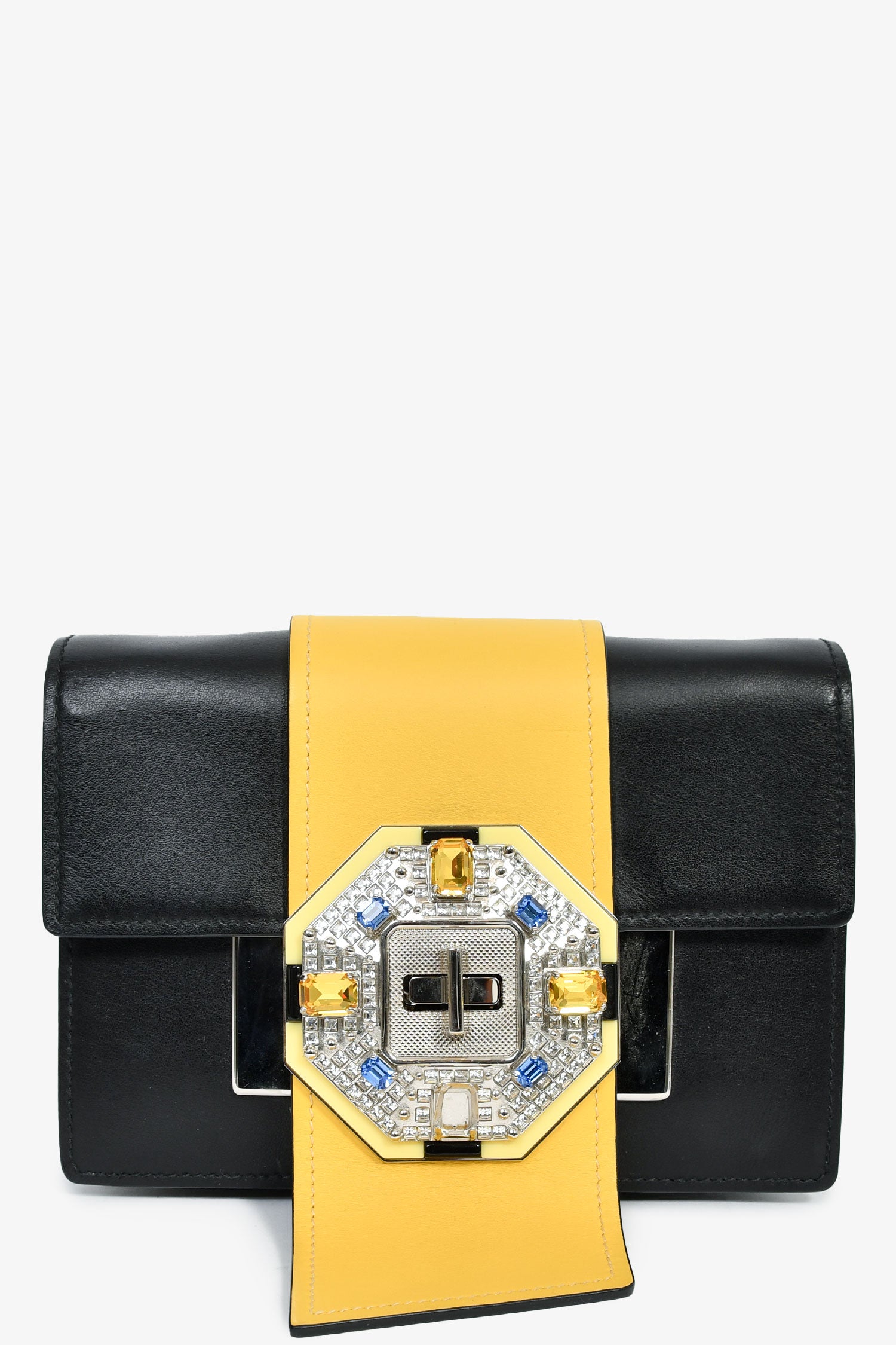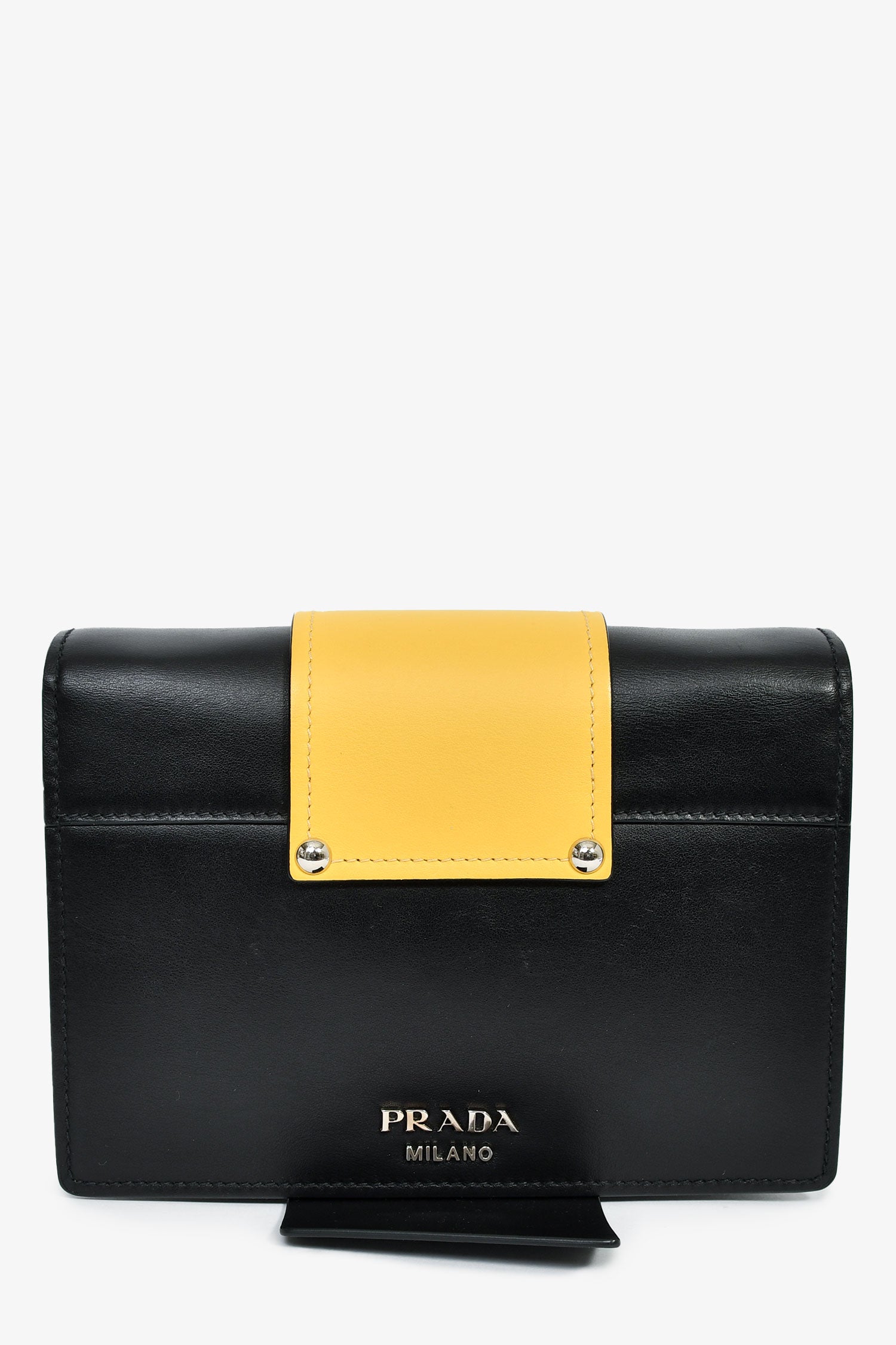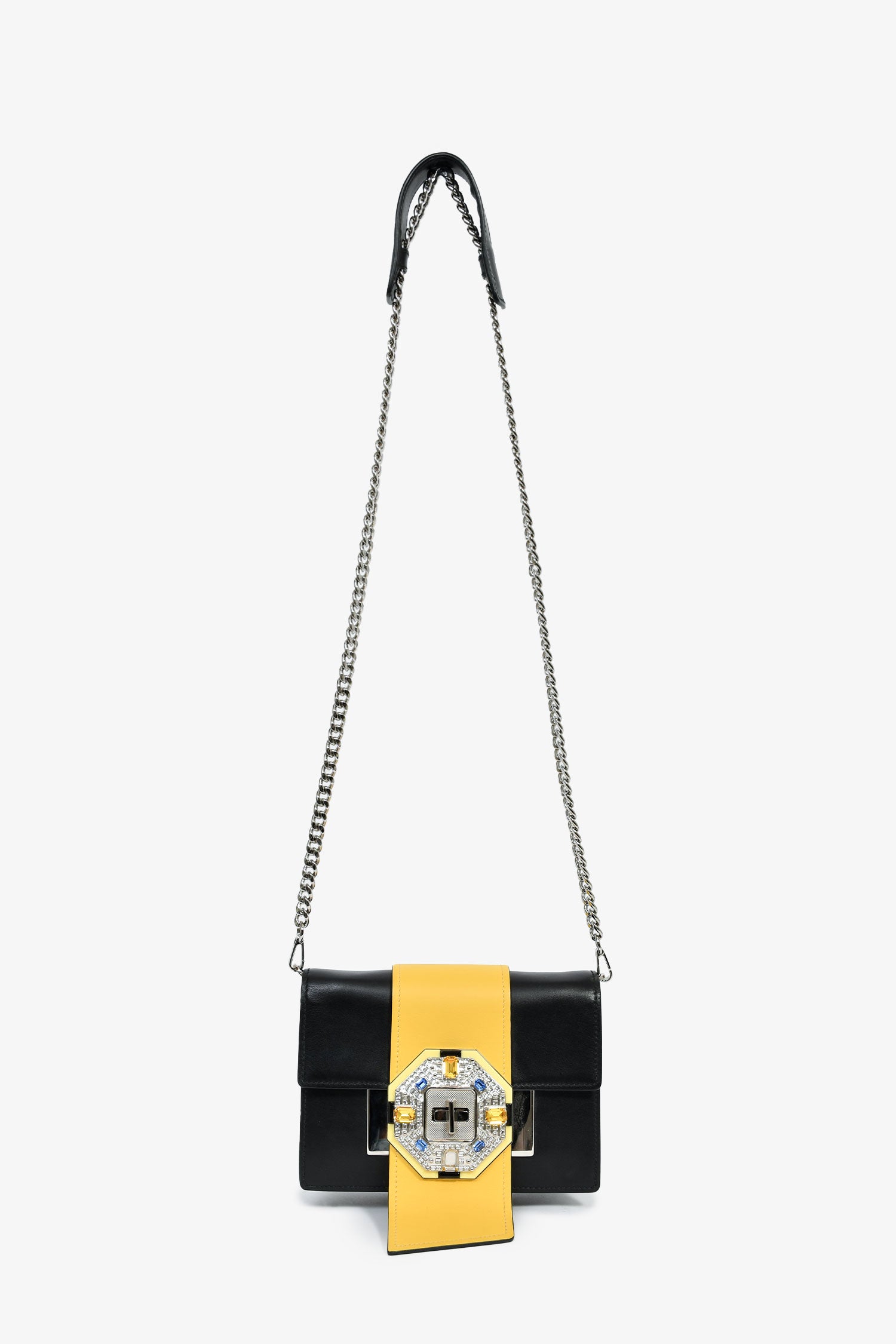 Refresh availabilityPrada Black/Yellow Leather City Calf Embellished Ribbon Chain Bag. Front fold-over flap with turn-lock closure. Chain-link shoulder strap. Lined interior with a slip compartment. Tonal stitching.