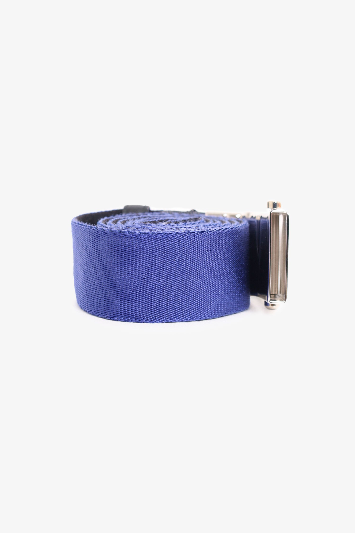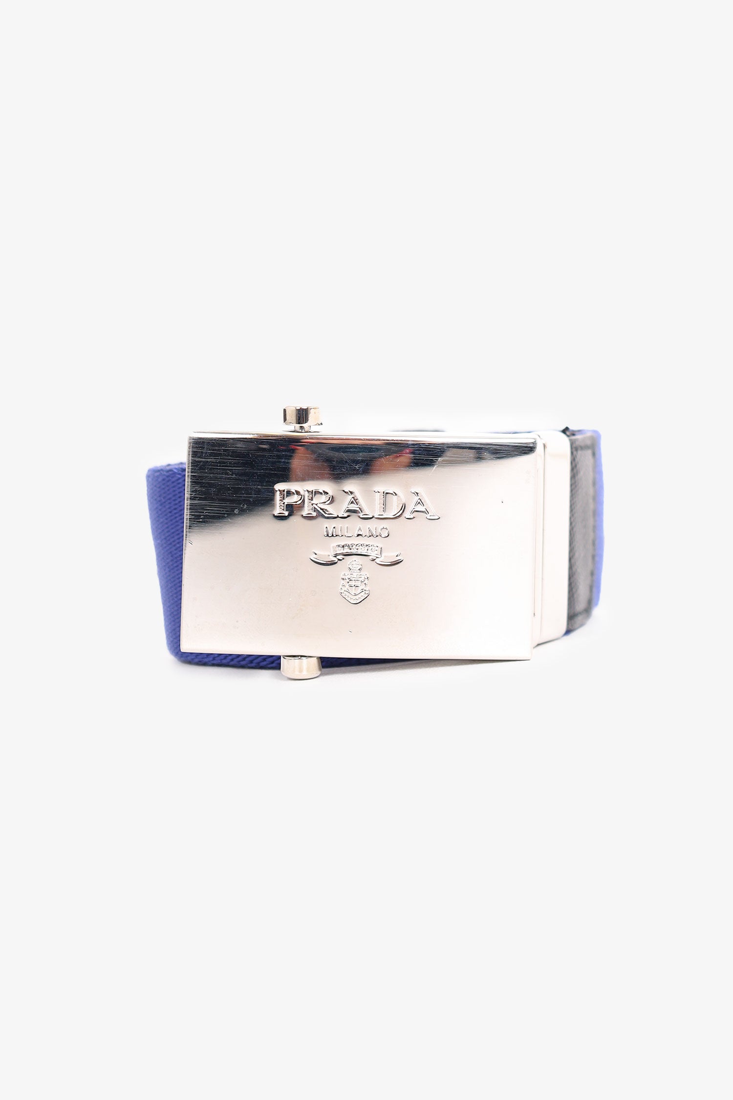 Refresh availabilityPrada Blue/Black Canvas Buckle Belt. Leather accents. Silver-tone hardware. Tonal stitching.